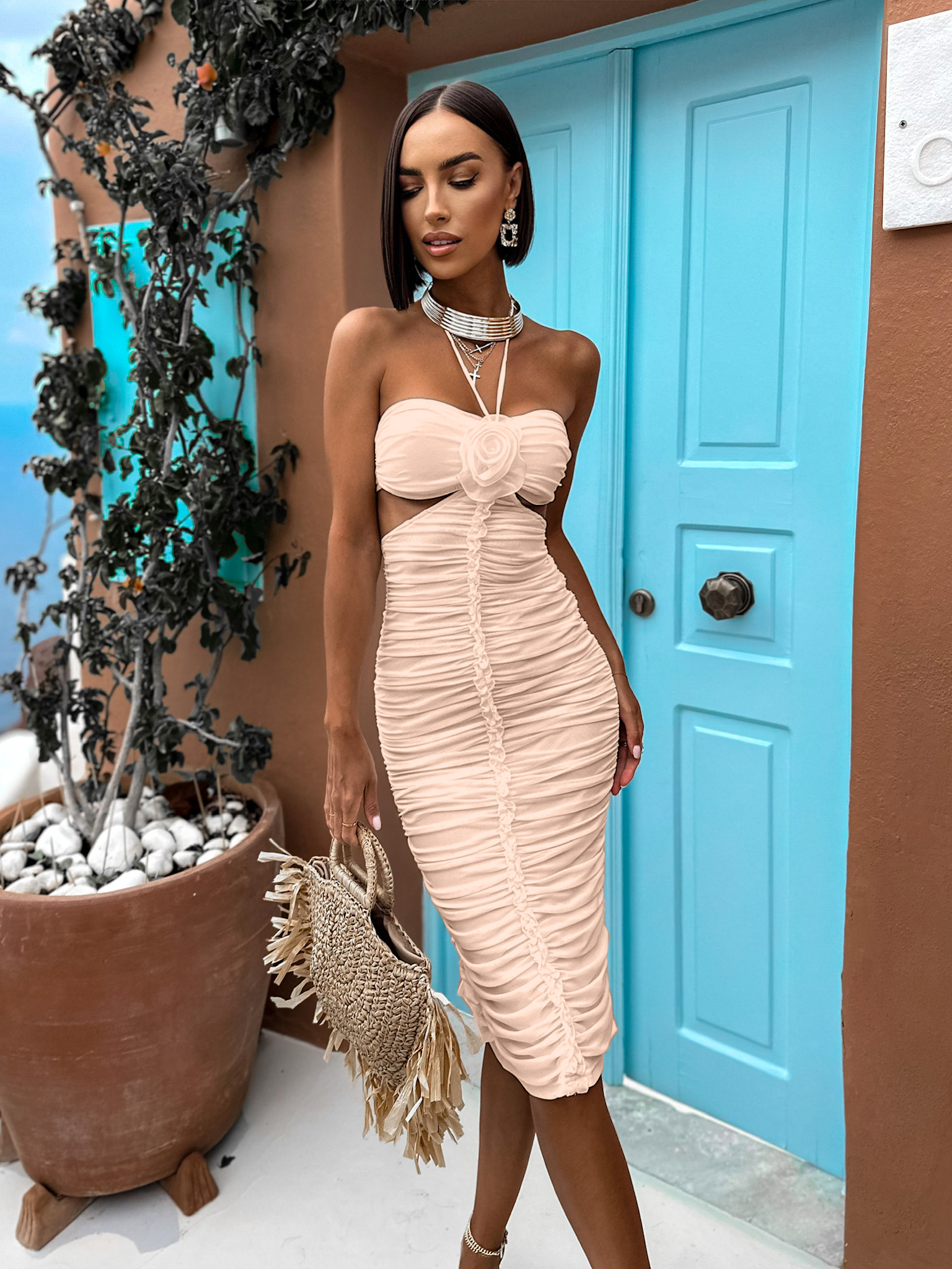 Béžové elegantní šaty RENERY s řasením Velikost: M/L