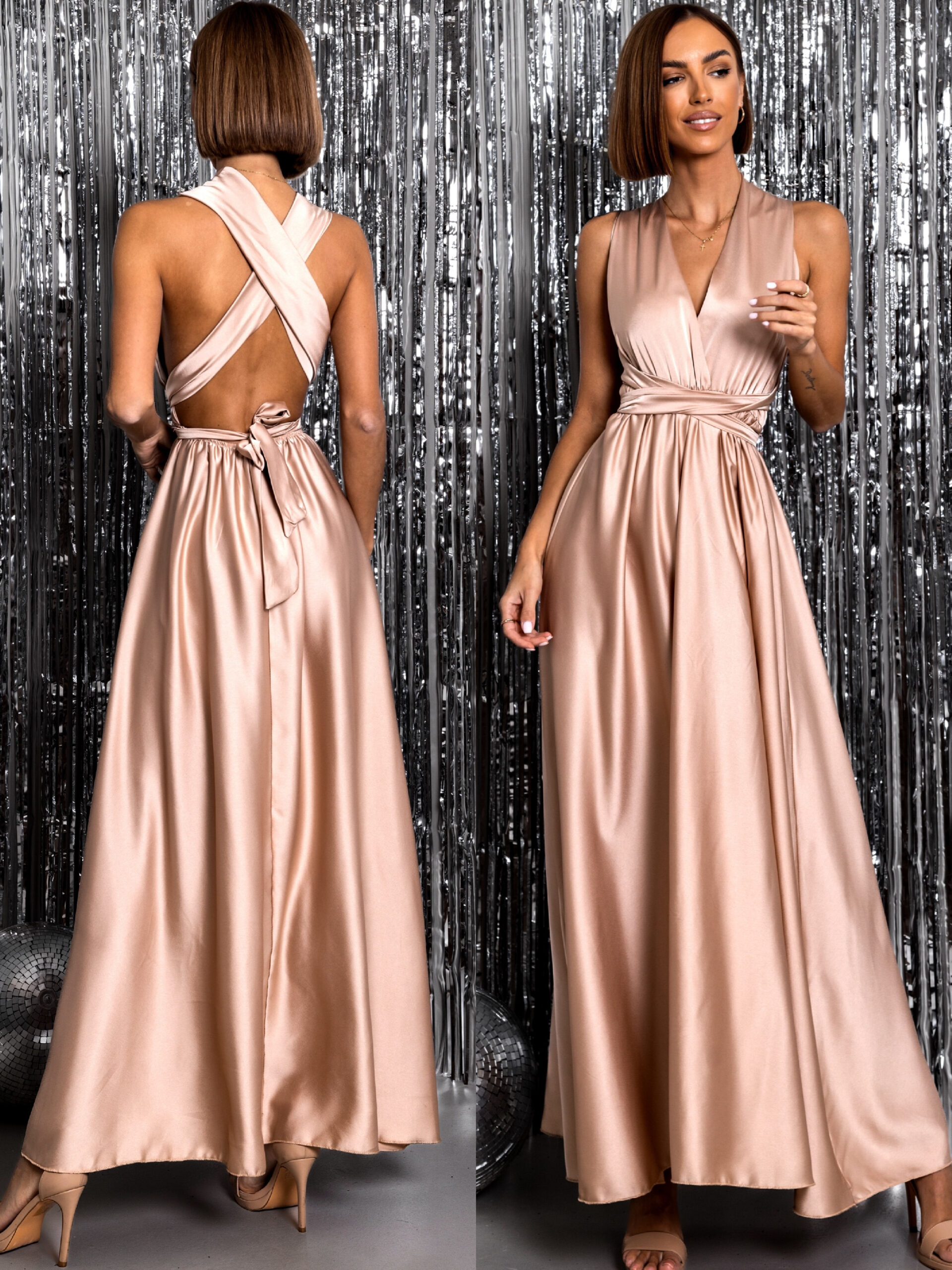 Tyto nádherné šaty jsou dokonalou volbou pro plesy i jako družičkovské šaty. Lesklý materiál dodává luxusní vzhled a variabilní vázání zajišťuje perfektní padnutí pro všechny typy postavy. Ideální kombinace elegance a pohodlí, která vás promění v hvězdu každé společenské události.