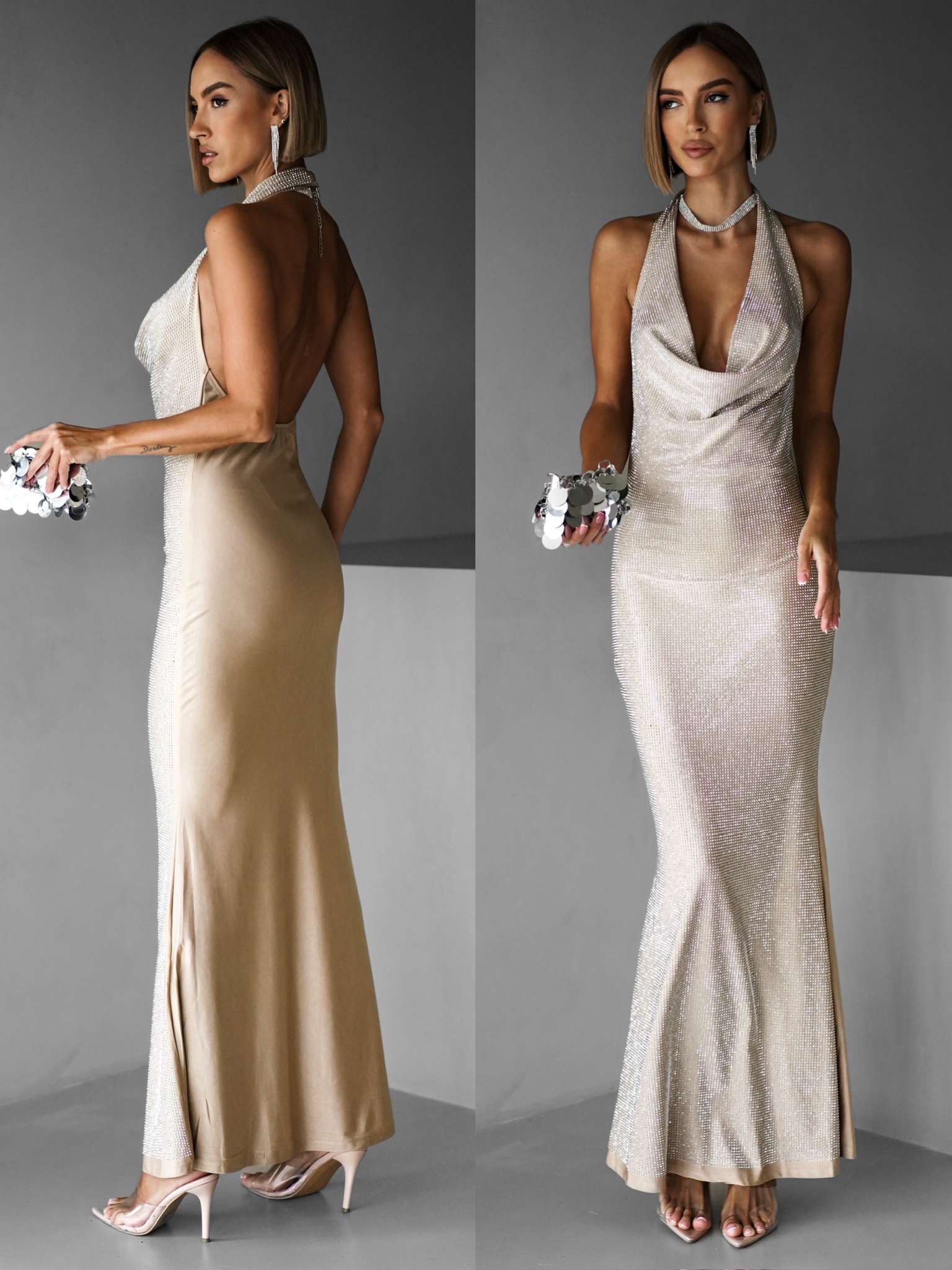Béžové třpytivé dlouhé šaty CESARA Velikost: M/L