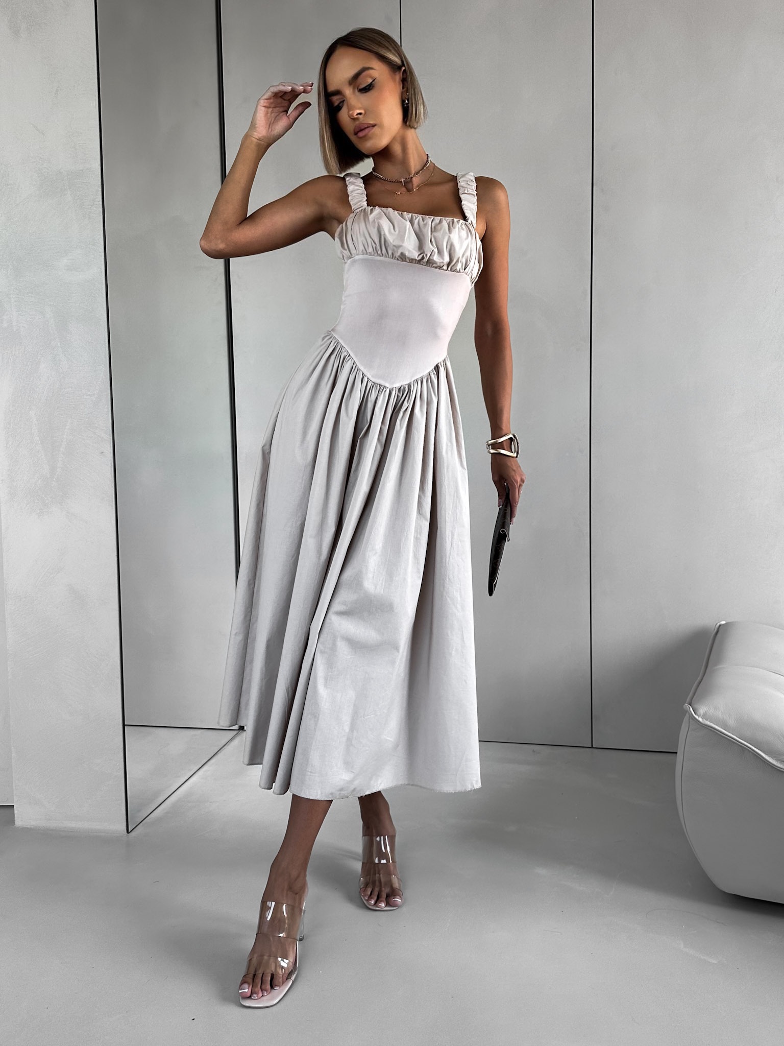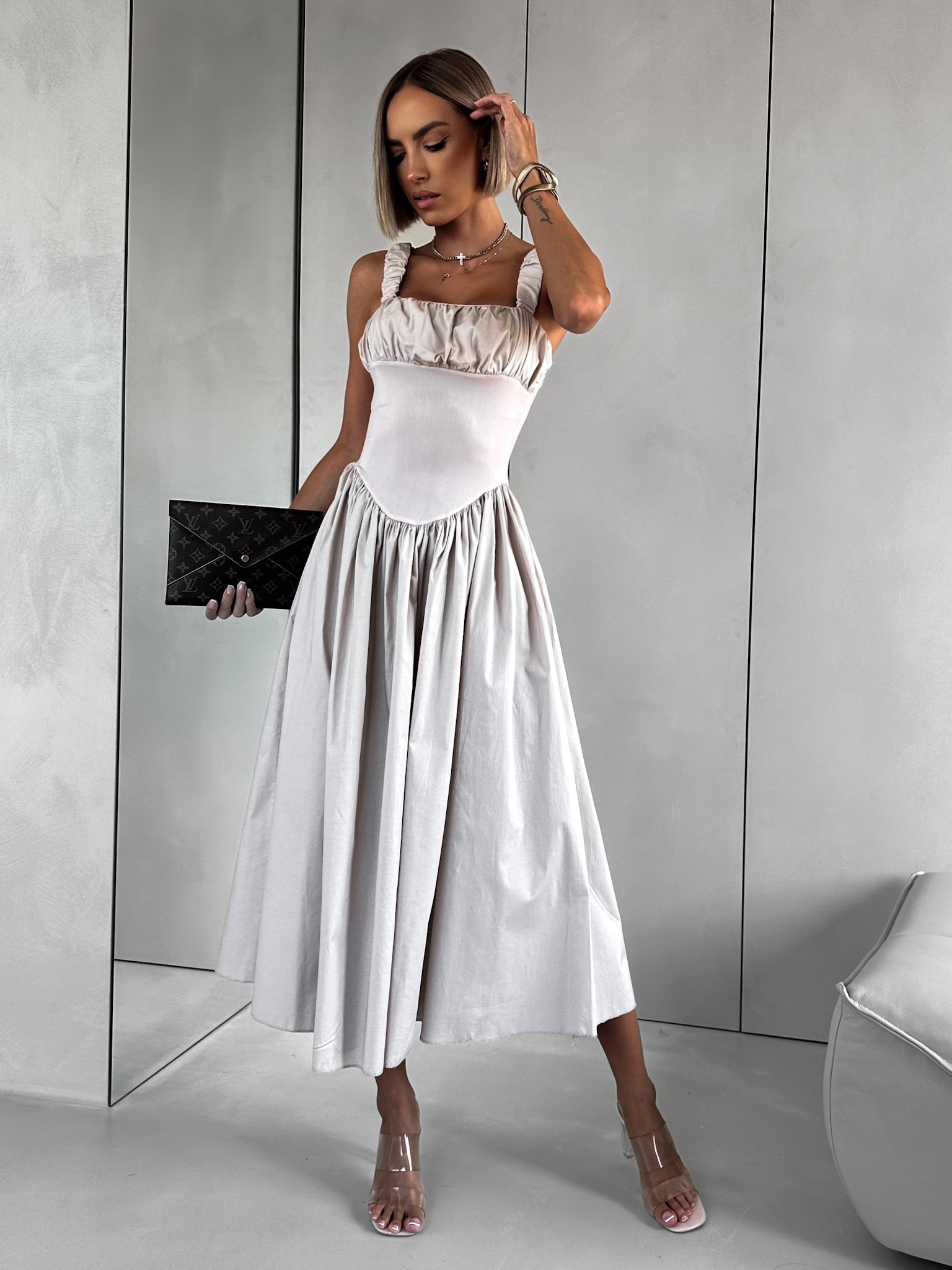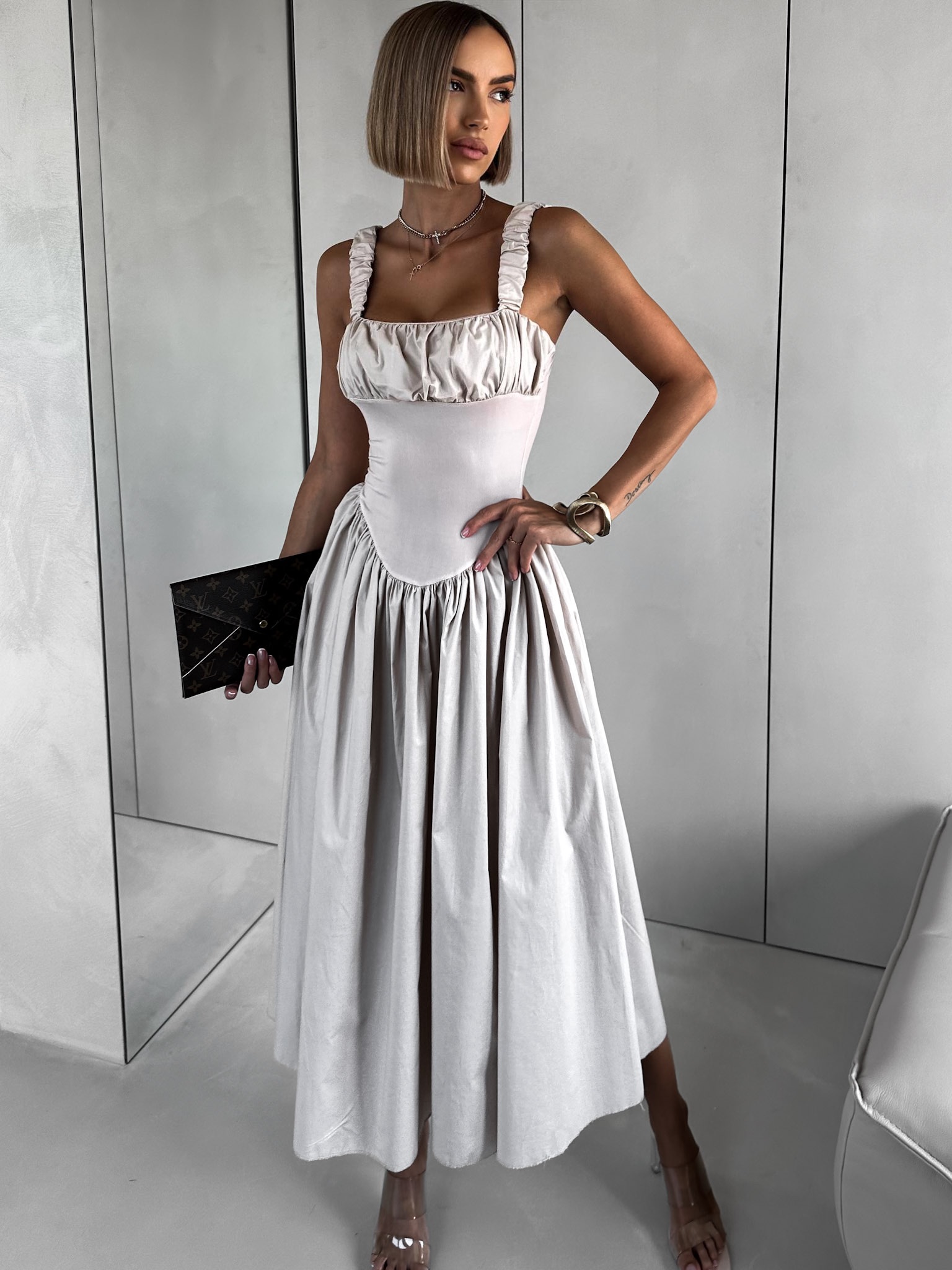 Béžové vypasované řasené šaty PELYT Velikost: ONESIZE