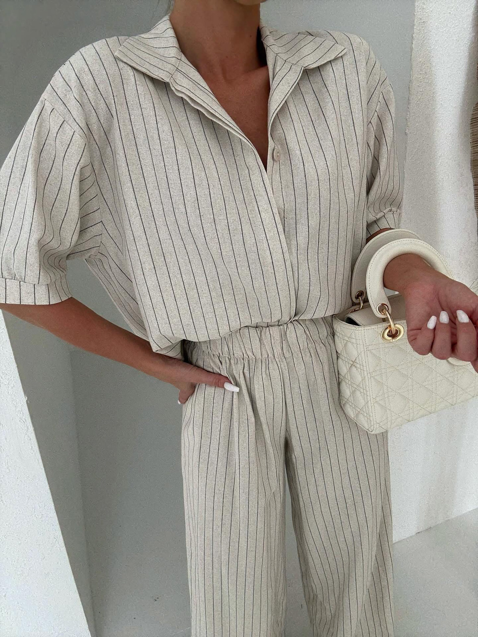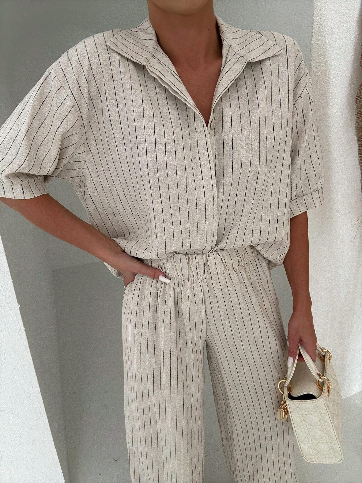 Béžový pruhovaný lněný dlouhý kalhotový komplet VELIOR Velikost: ONESIZE