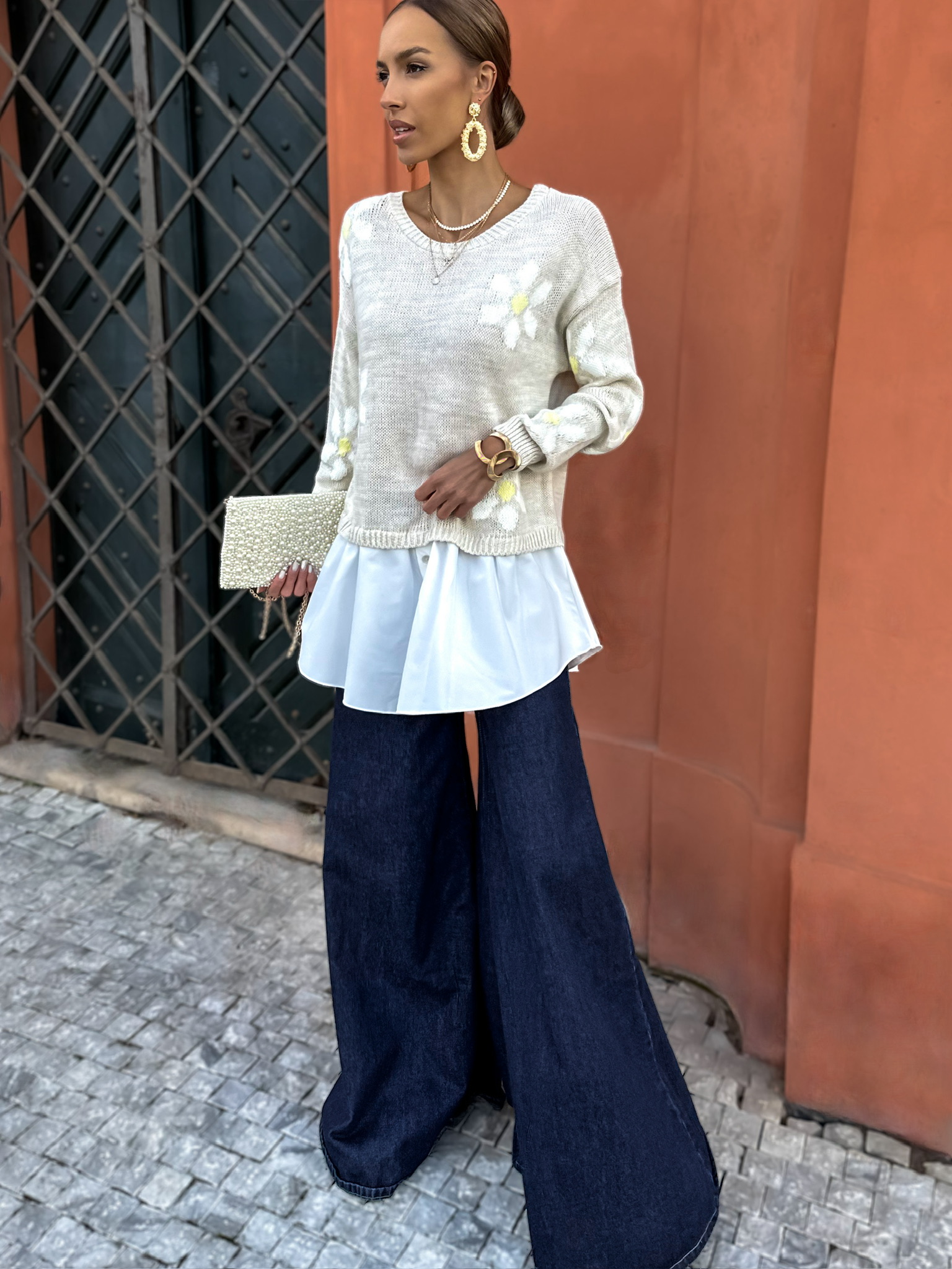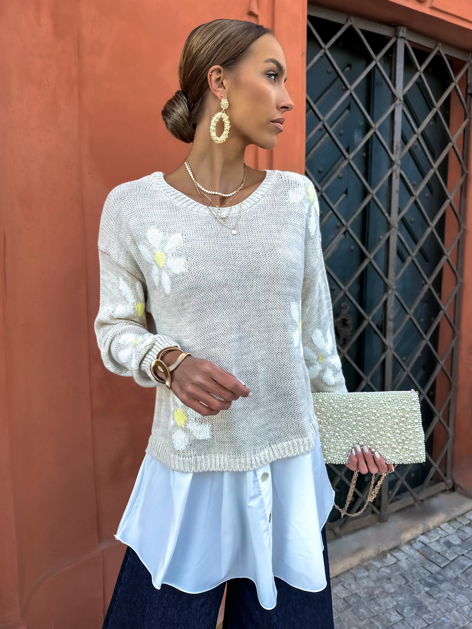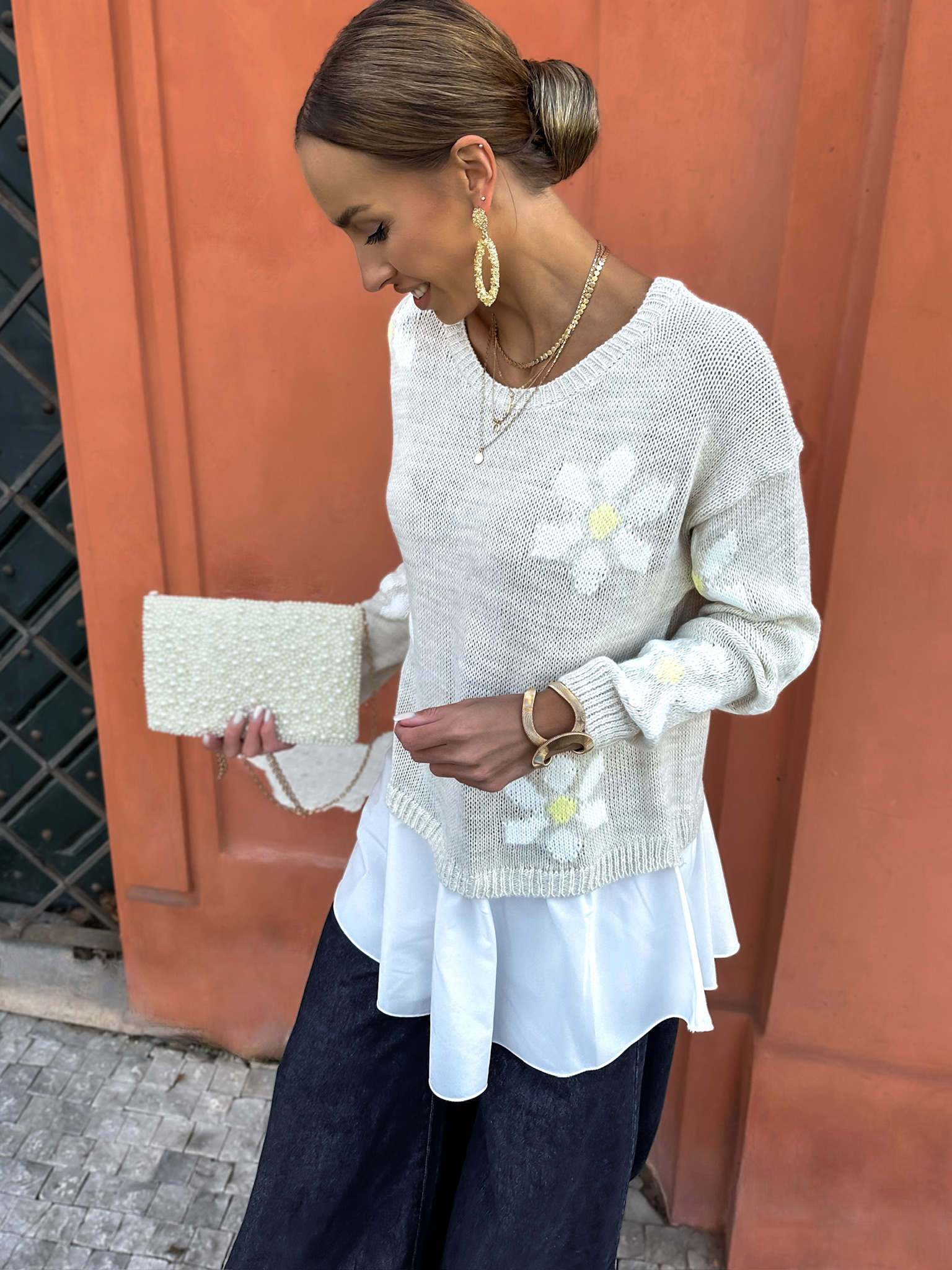 Béžový svetřík s květinami PAULINA Velikost: ONESIZE