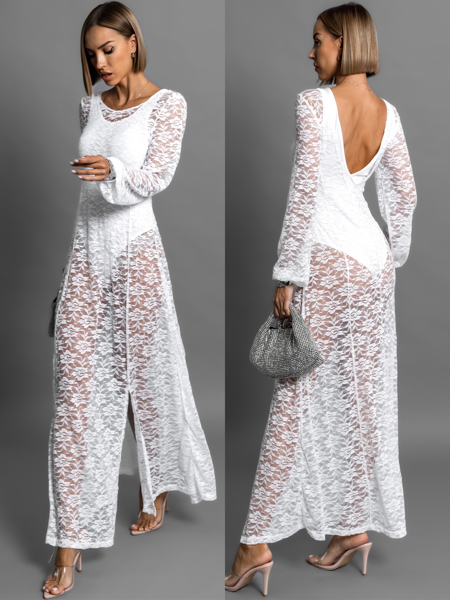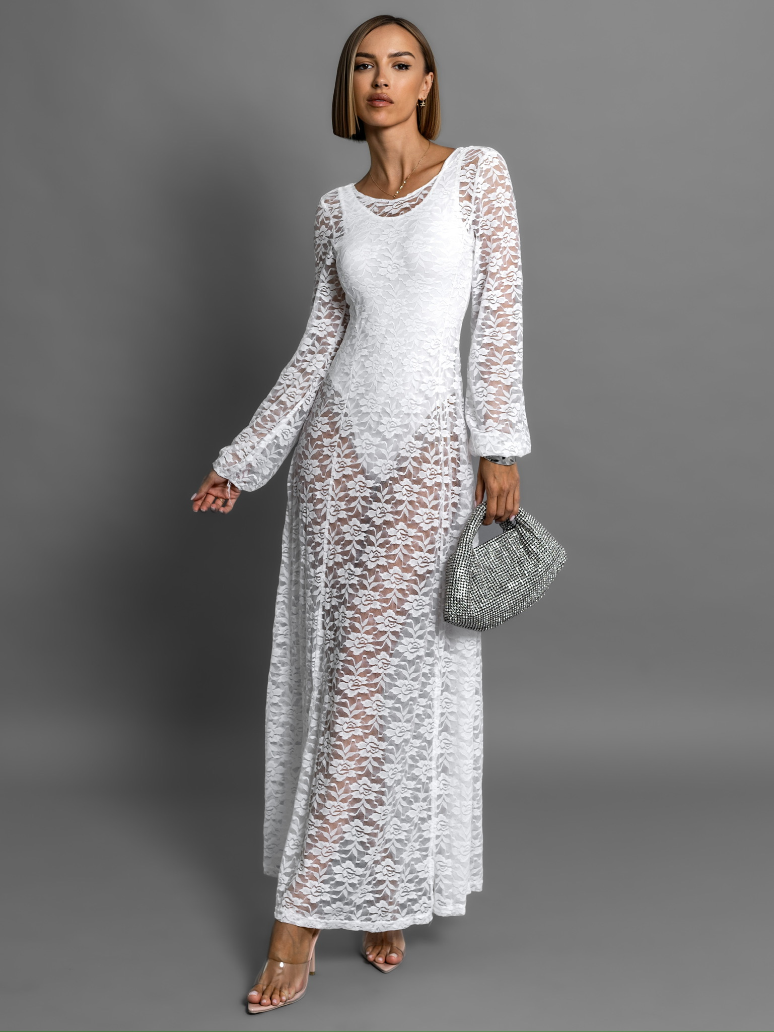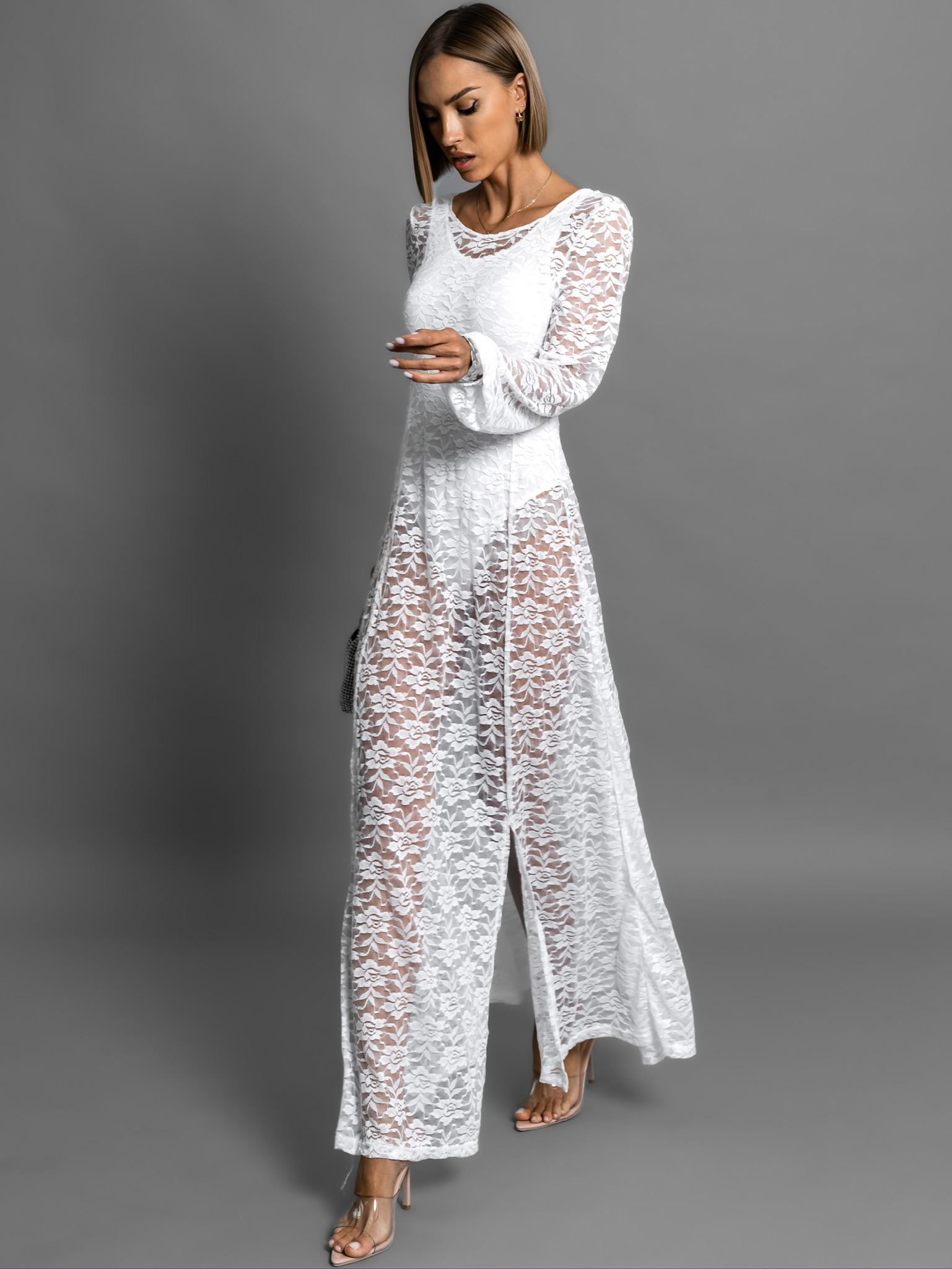 Bílé dlouhé krajkované šaty OCHRIM s body Velikost: M/L