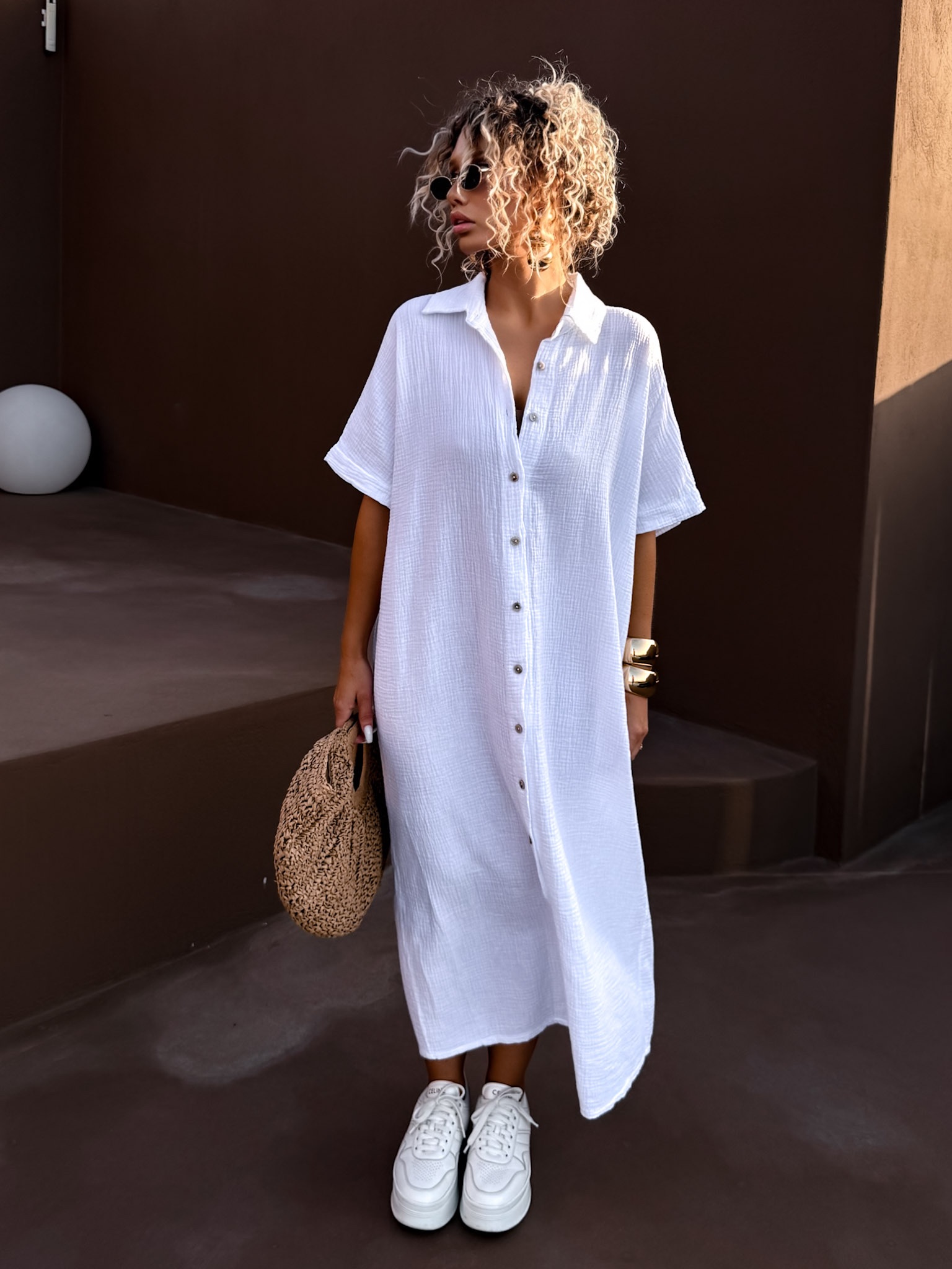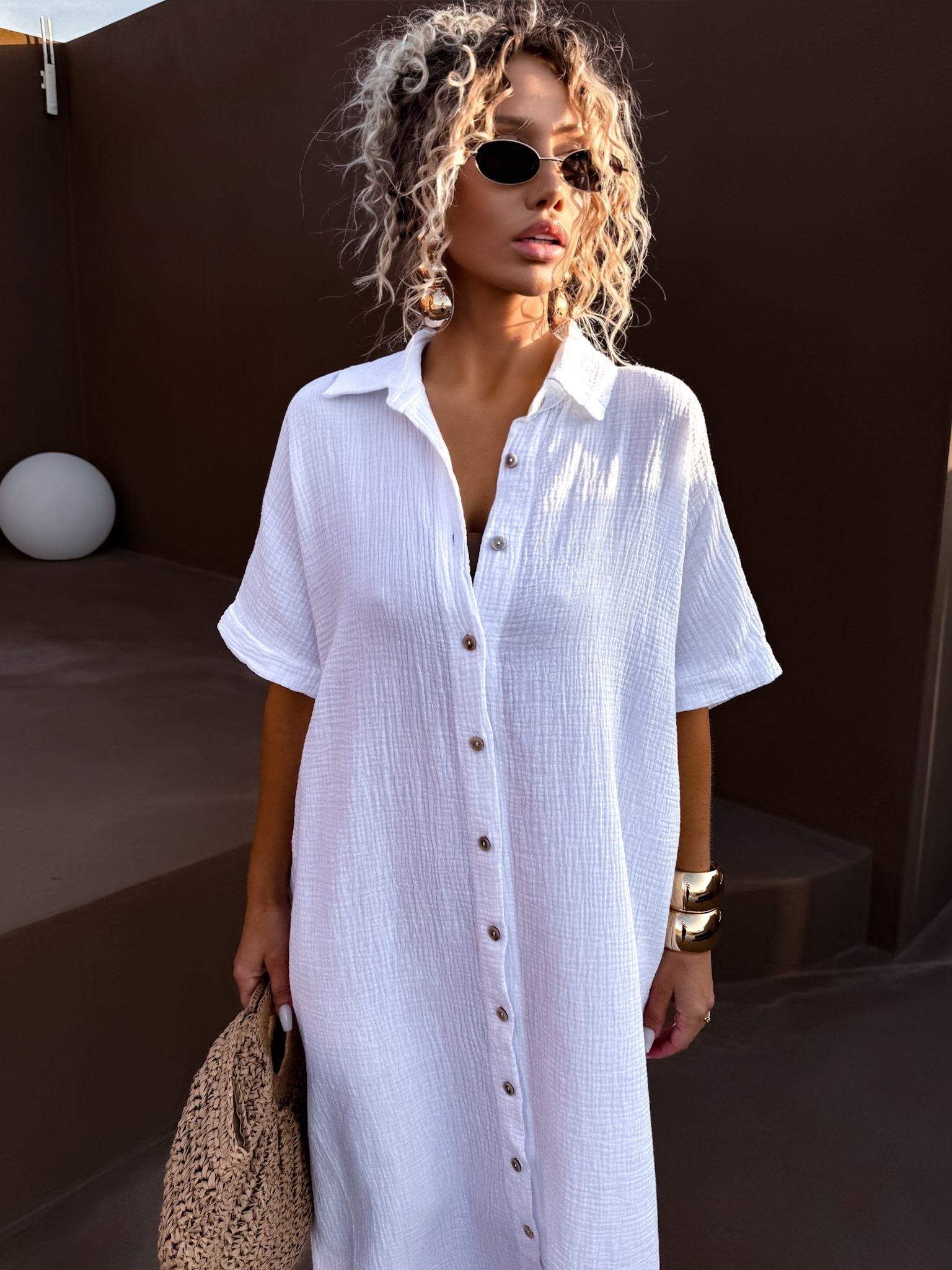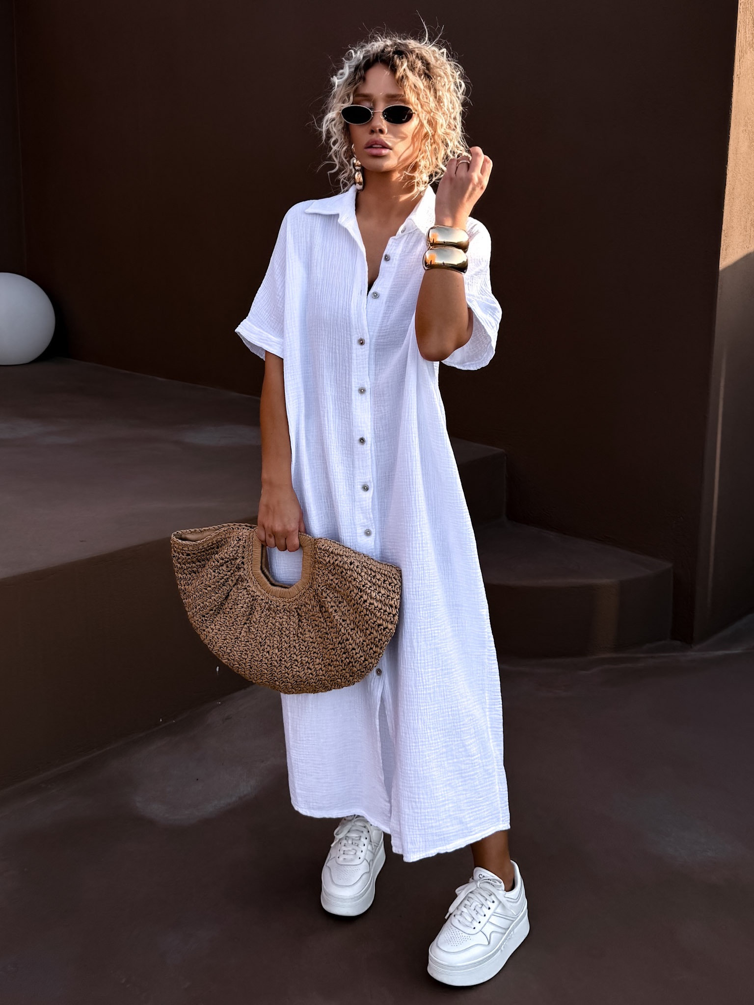Bílé dlouhé mušelínové košilové šaty NUKET s krátkým rukávem Velikost: ONESIZE