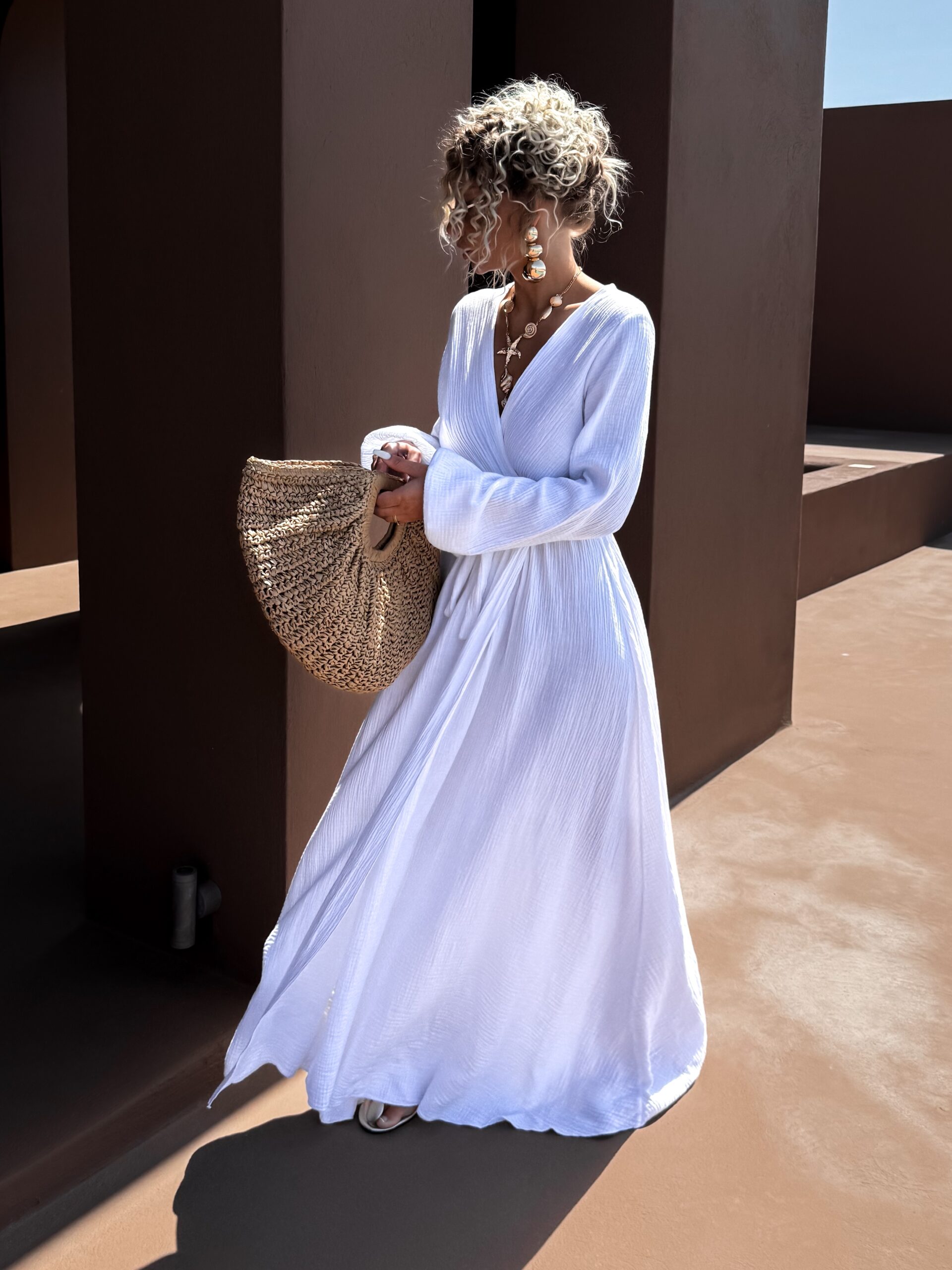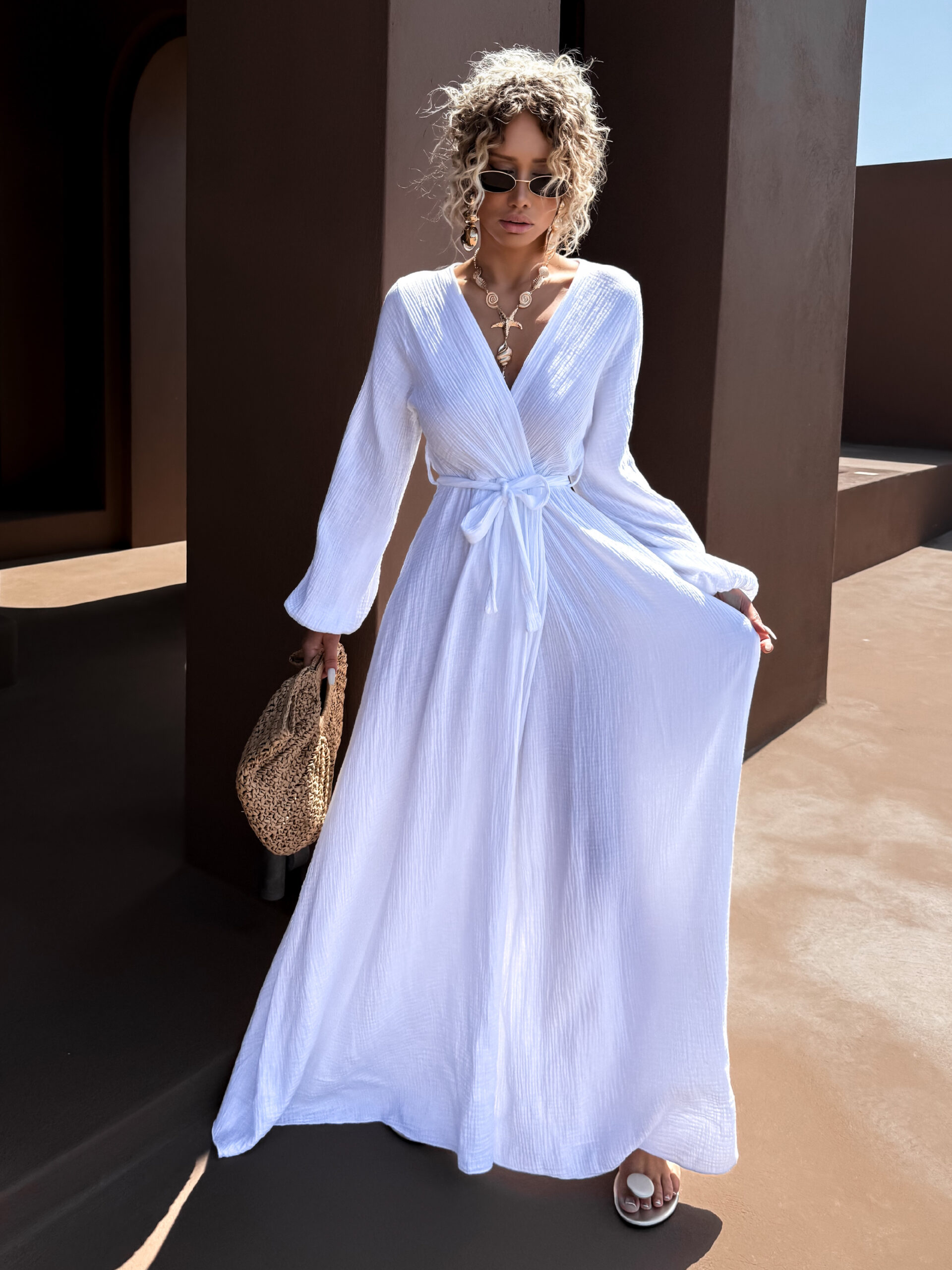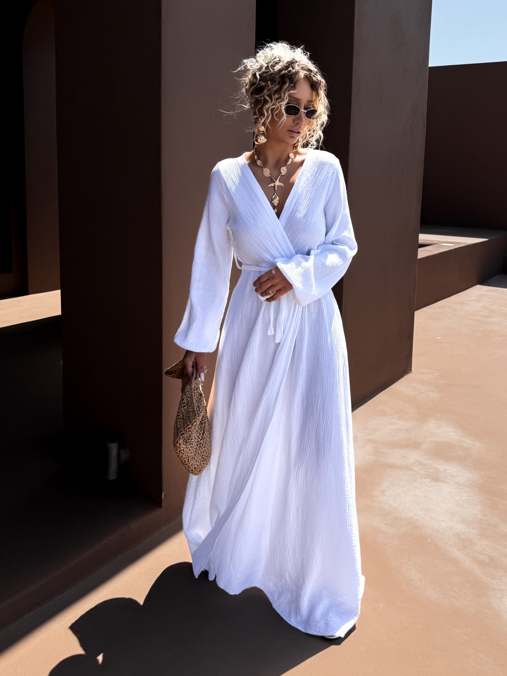 Bílé mušelínové dlouhé šaty VERIENA s výstřihem Velikost: ONESIZE