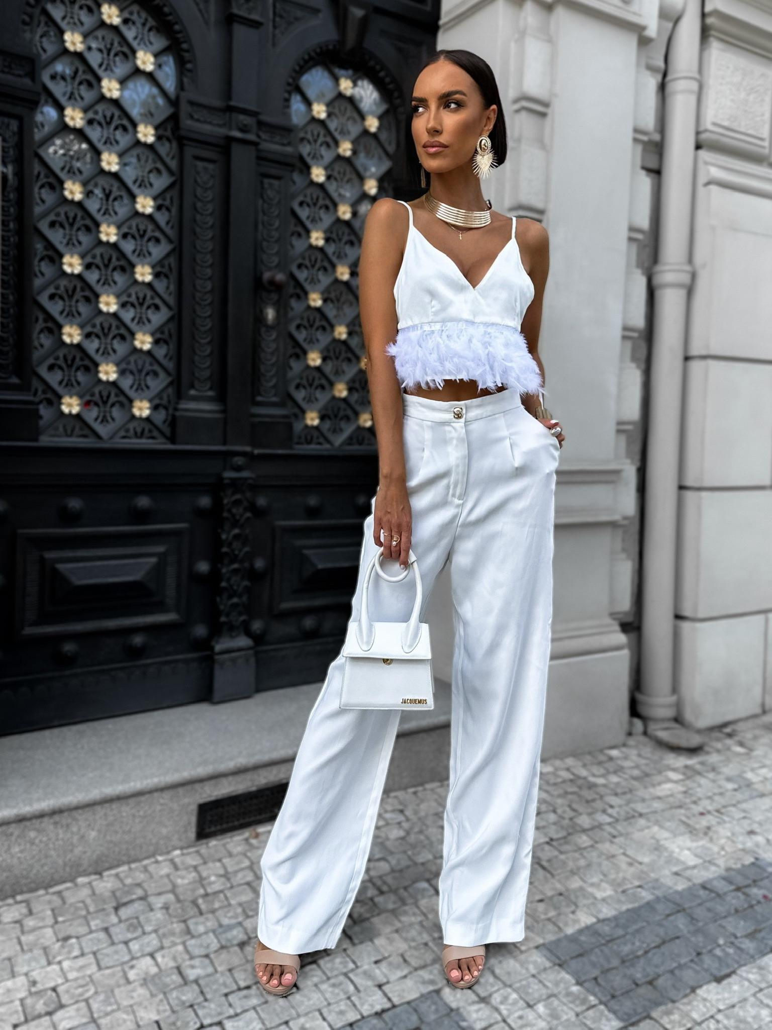 Bílý elegantní crop top KINCELES s peřím Velikost: M/L