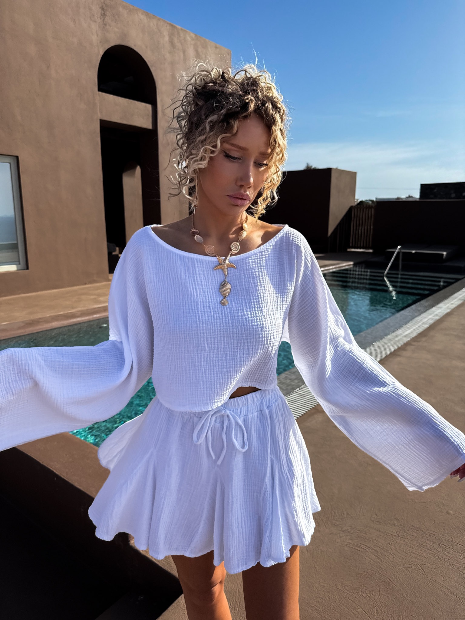 Bílý mušelínový široký top VHAGAR s dlouhým rukávem Velikost: ONESIZE