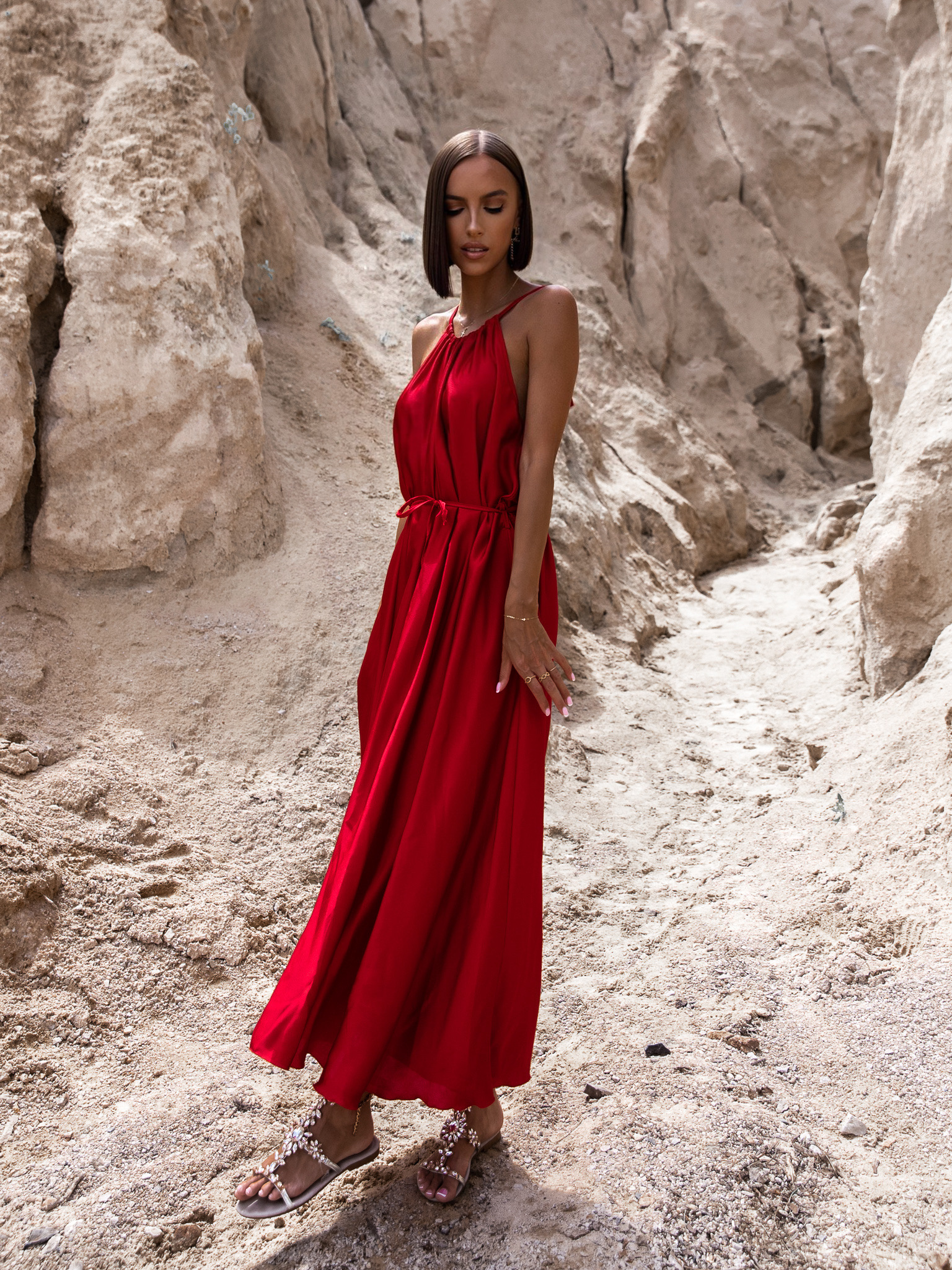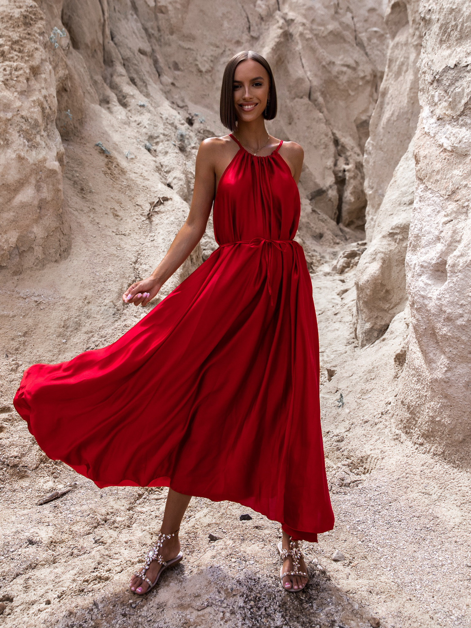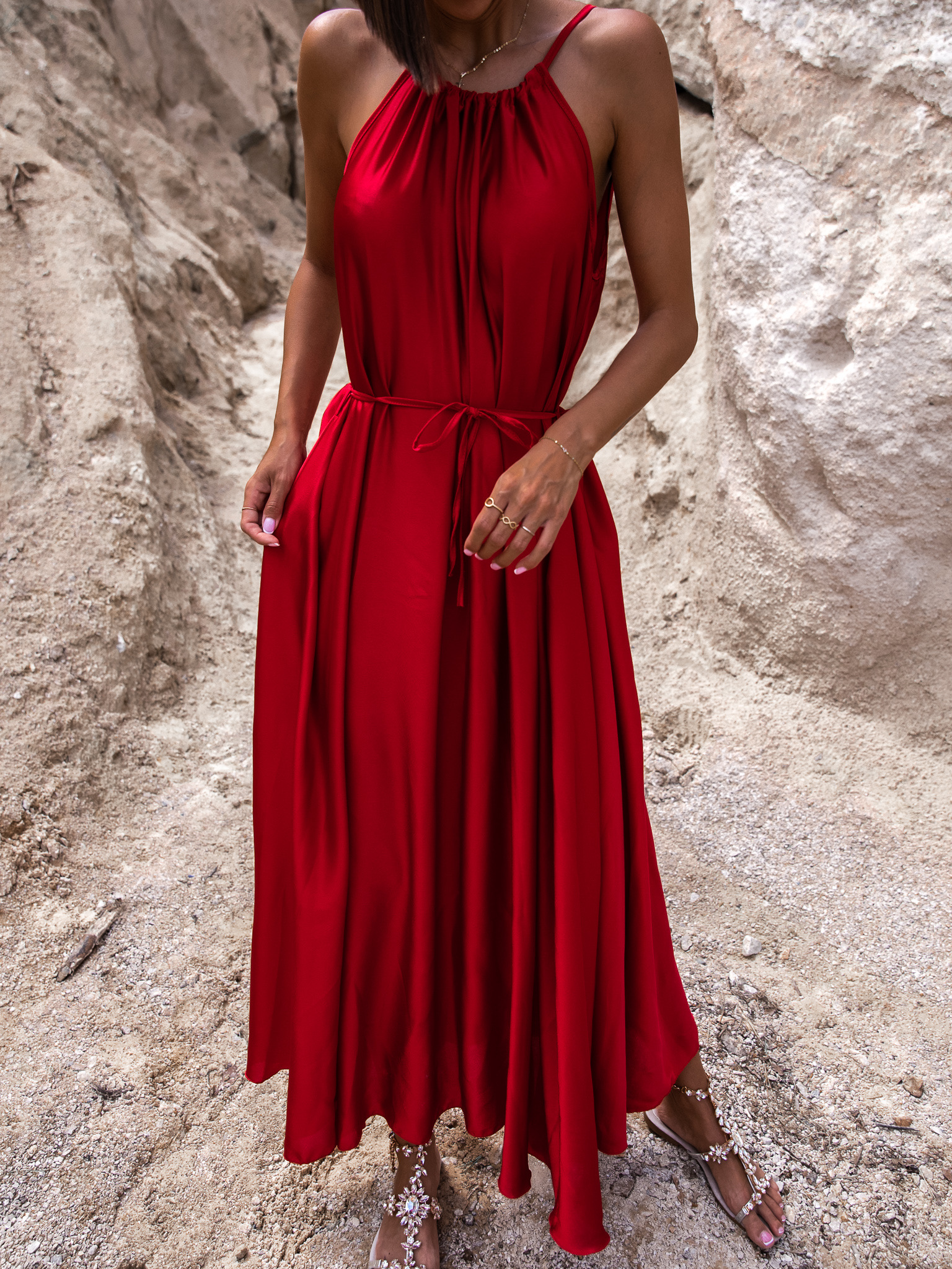 Bordó dlouhé lesklé elegantní šaty MADES se zavazováním