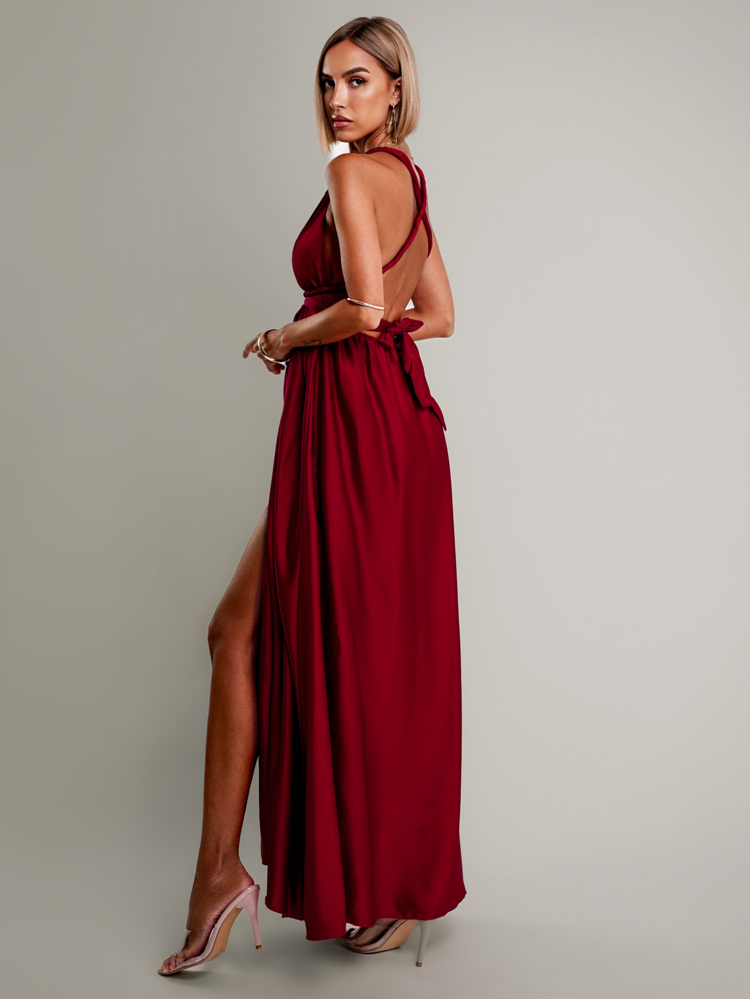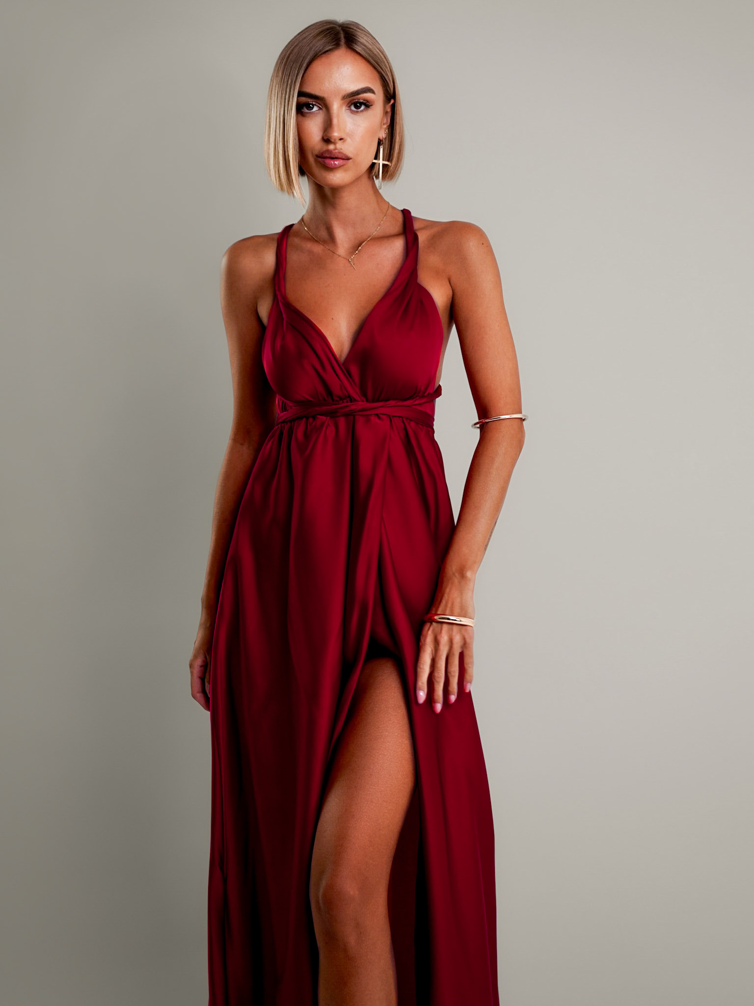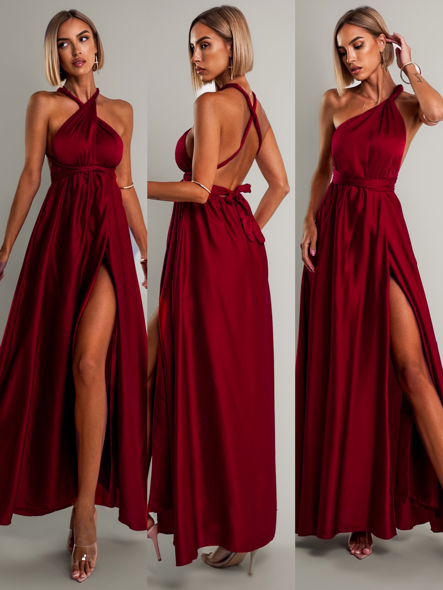 Bordó saténové šaty VALERDI s variabilním vázáním a rozparkem Velikost: ONESIZE