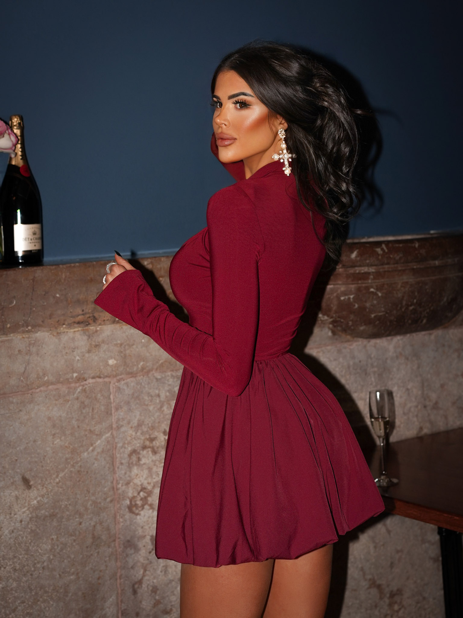 Bordó vypasované šaty SCOTON s dlouhým rukávem Velikost: M/L - Obrázek 2