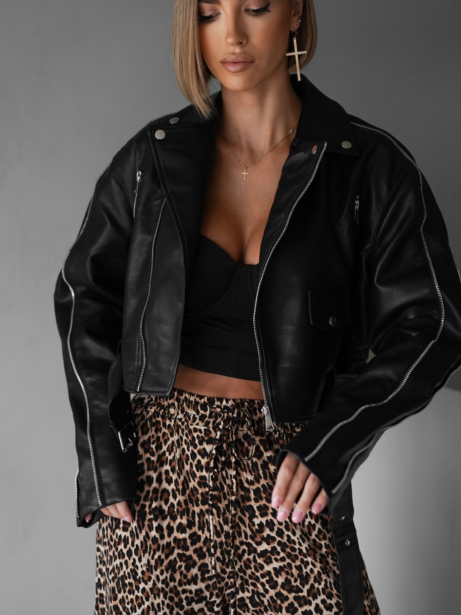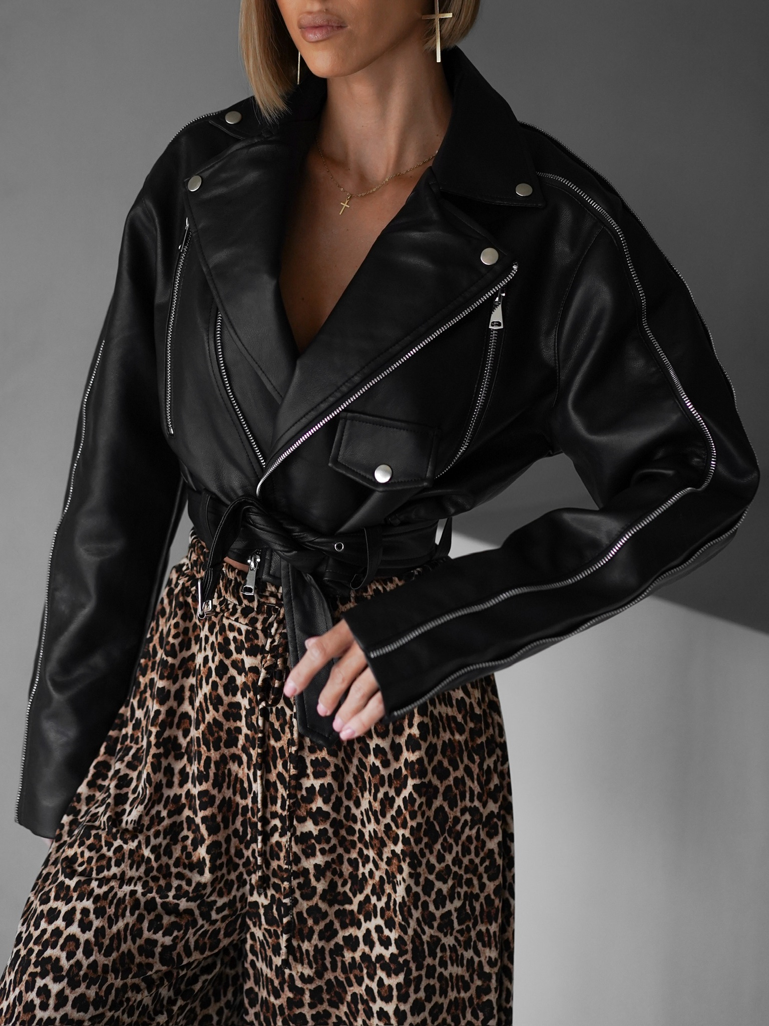 Černá krátká koženková biker bunda BENEDIKTA Velikost: ONESIZE