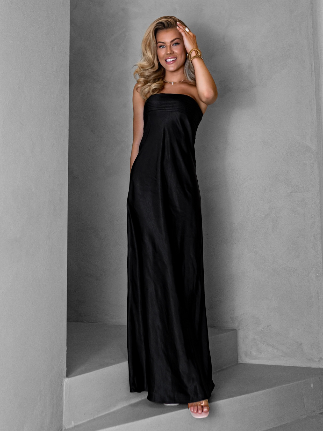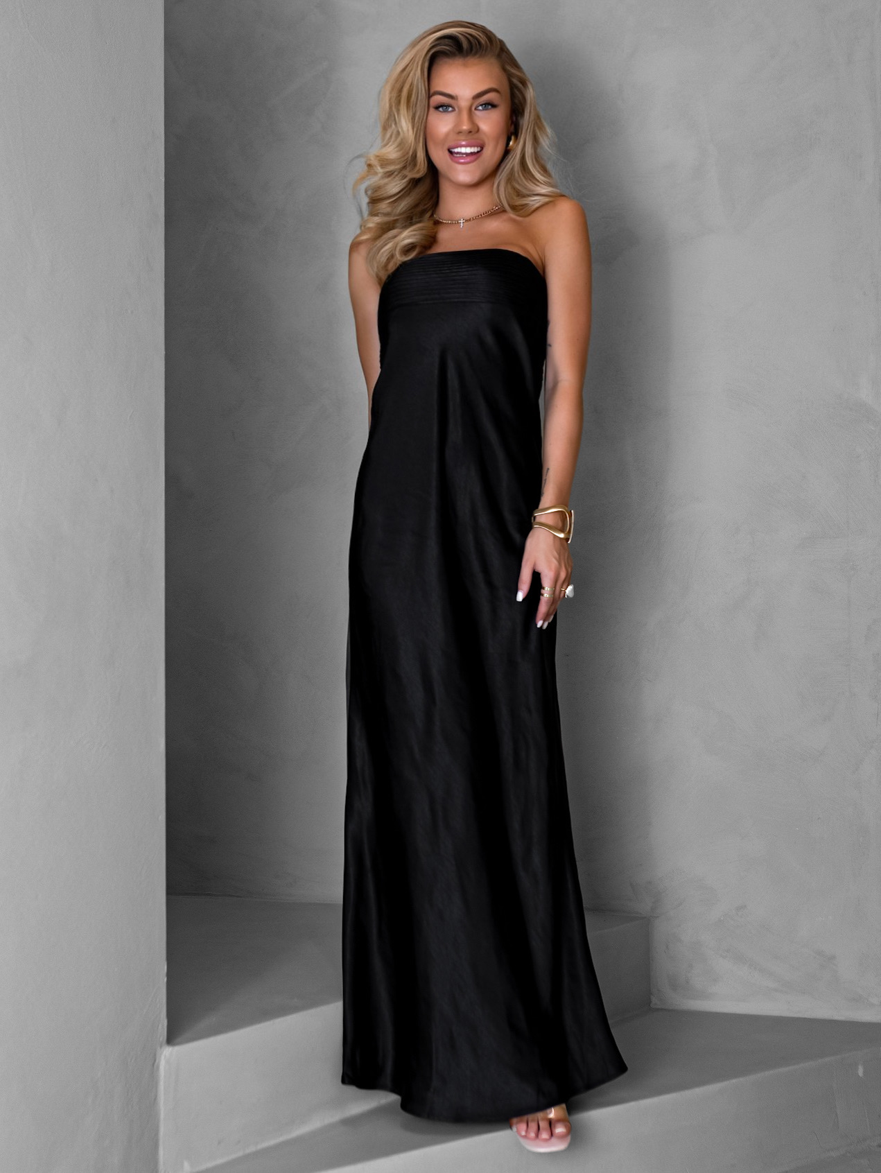 Černé dlouhé saténové lesklé šaty ABIMA Velikost: S