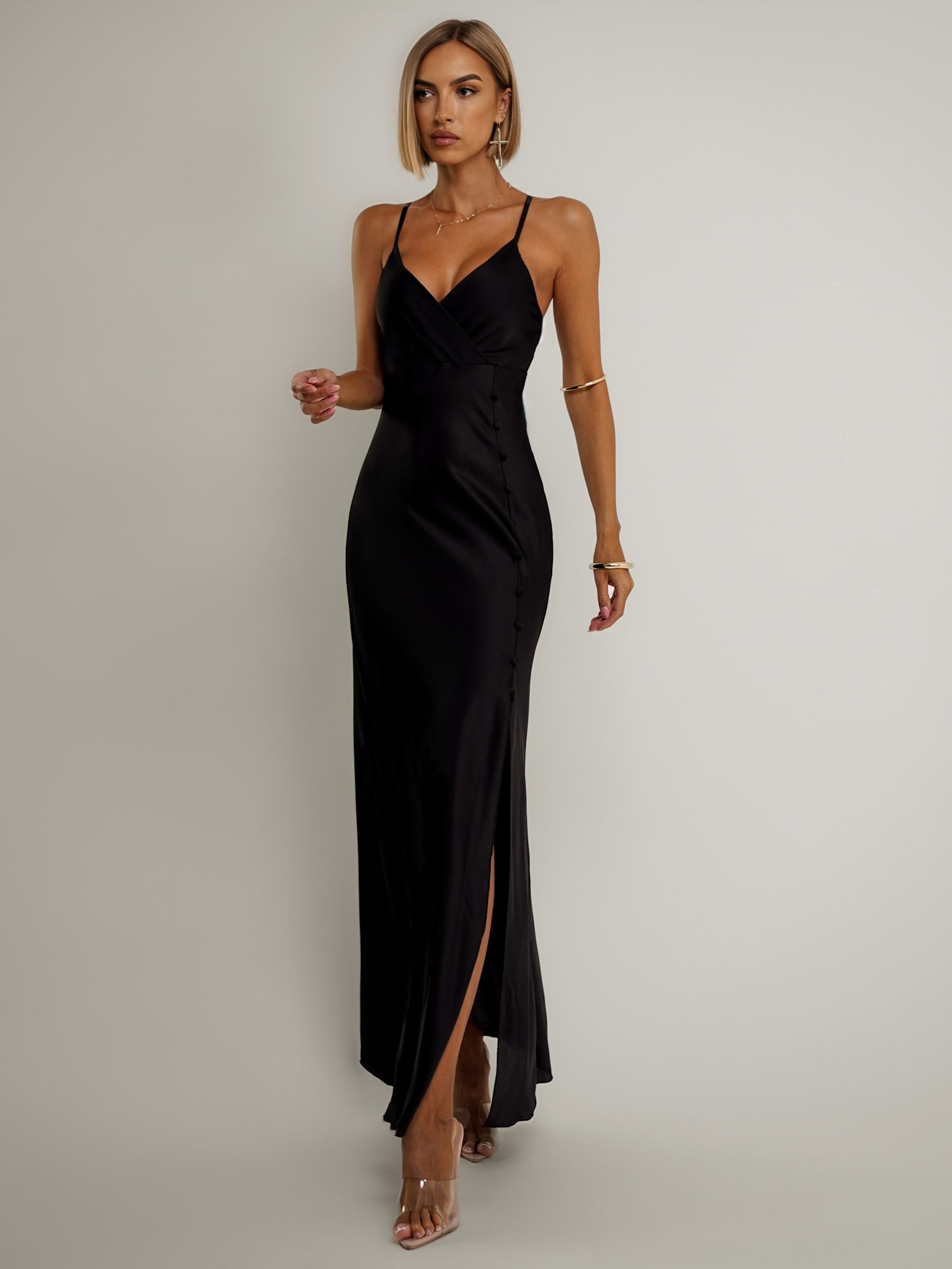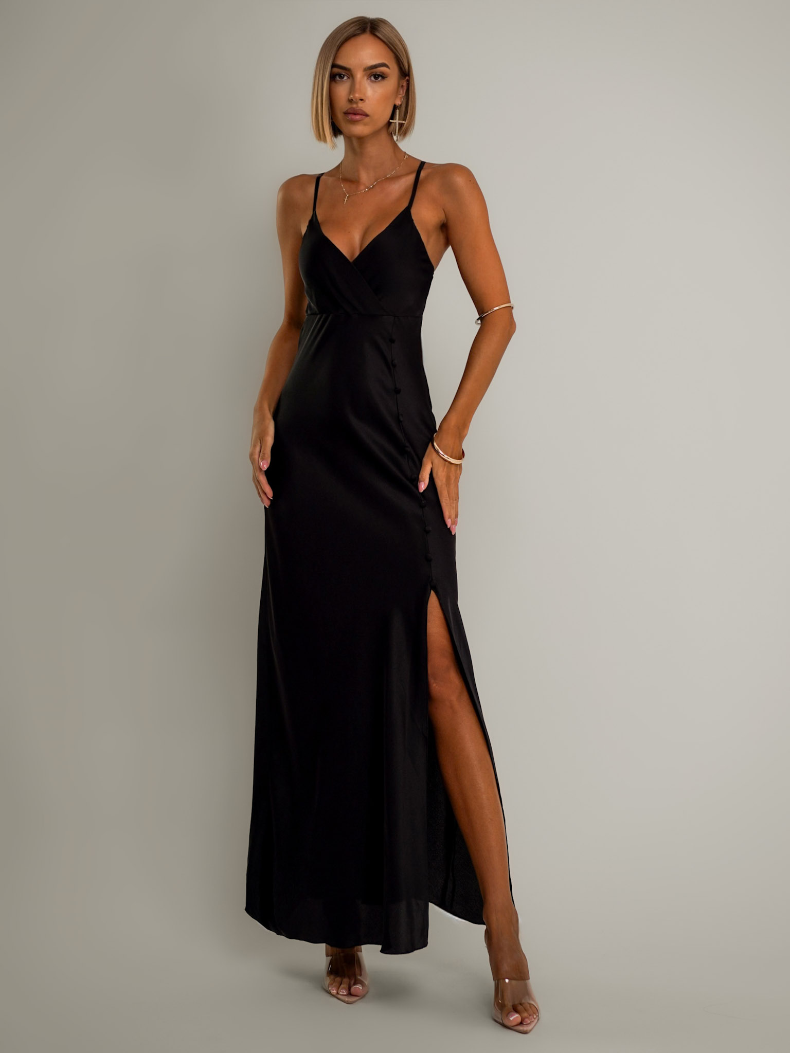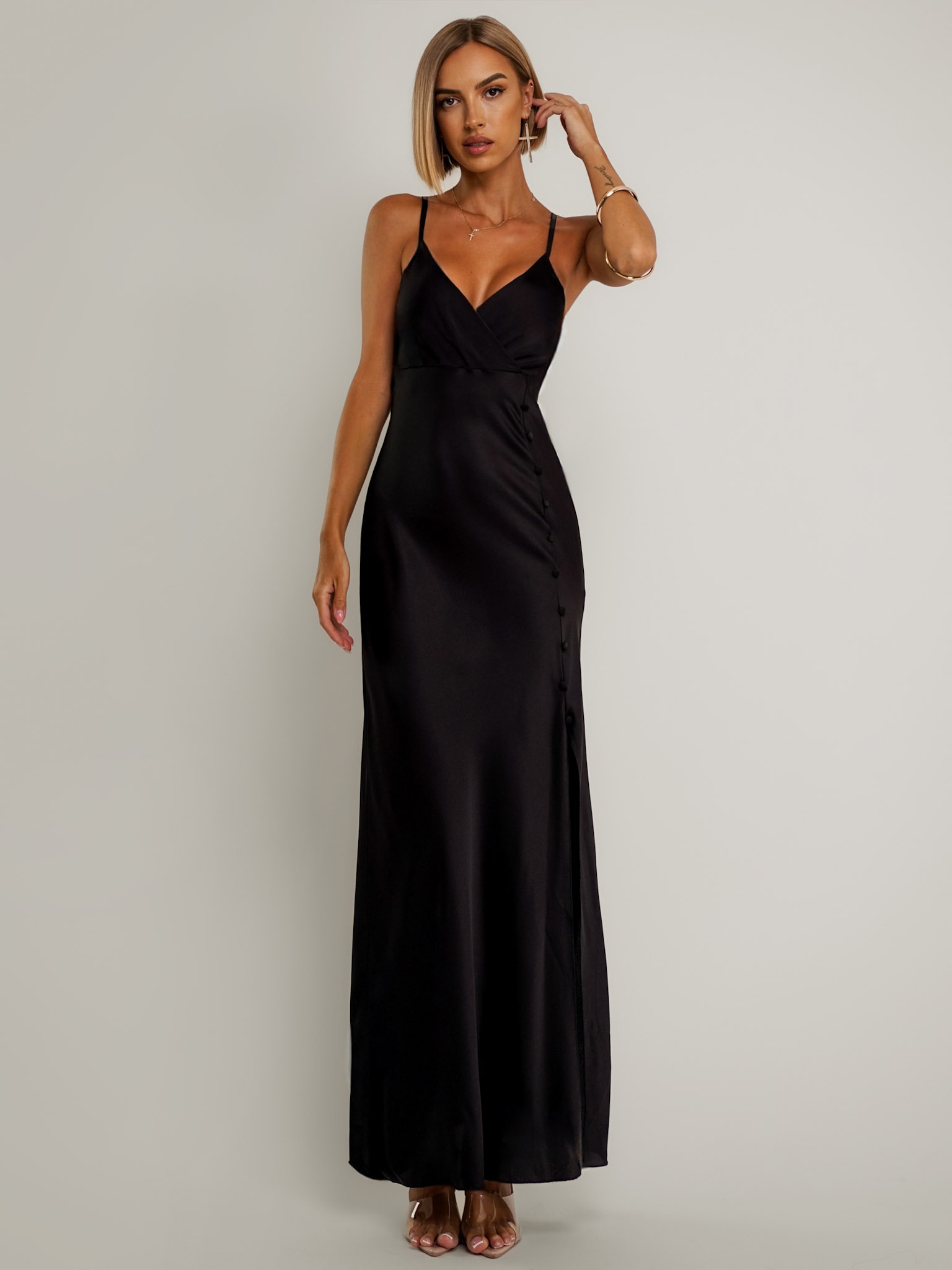 Černé dlouhé saténové šaty ROSES s rozparkem