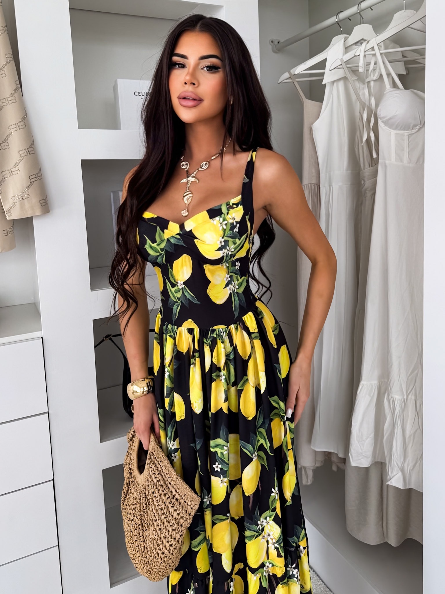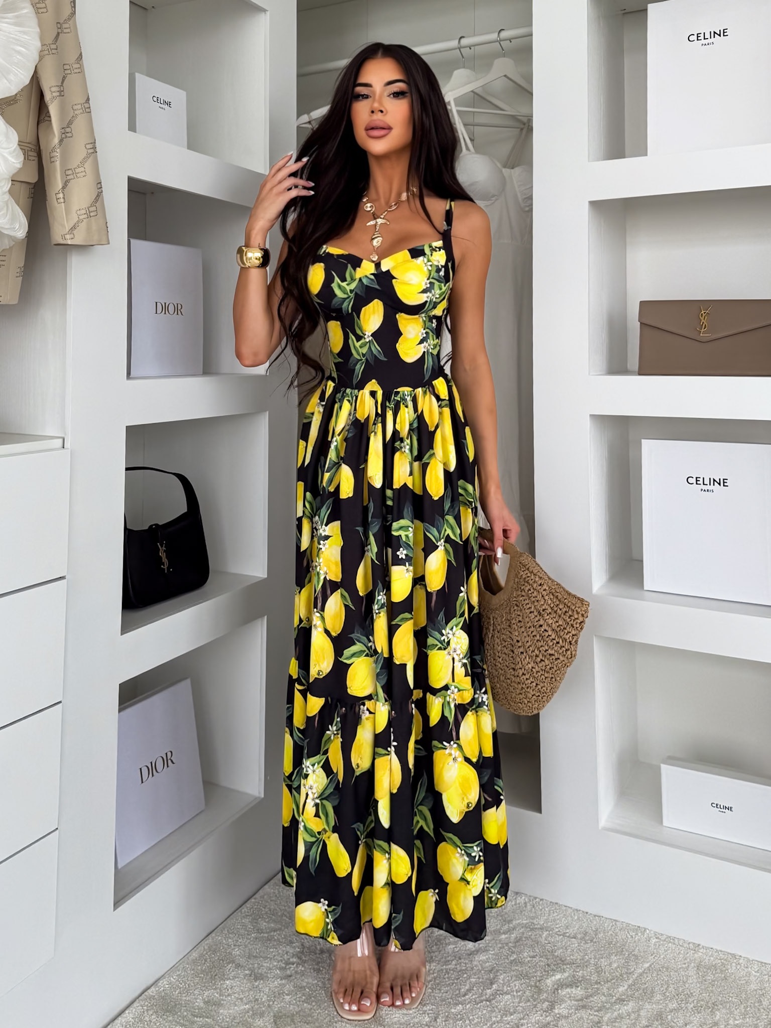 Černé letní dlouhé šaty THEADY s citrony Velikost: ONESIZE