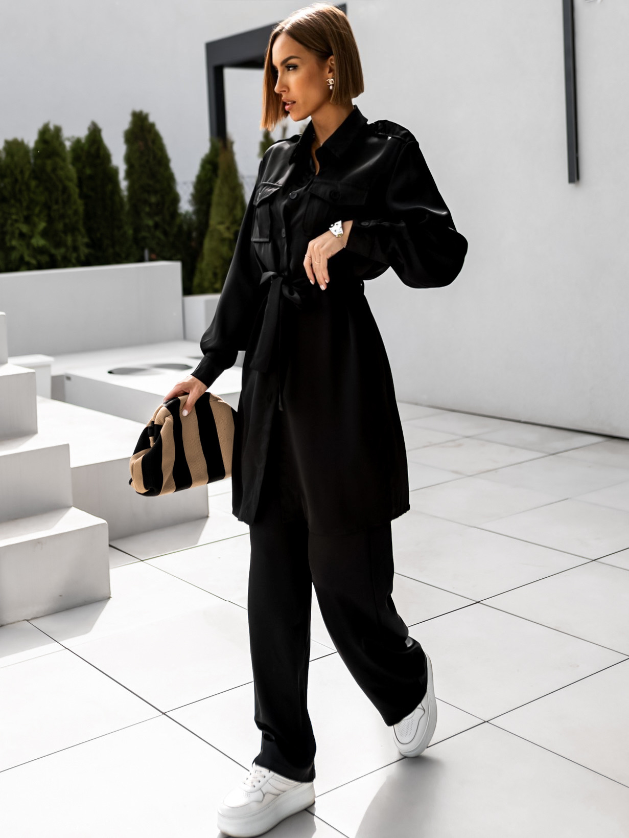 Černý elegantní saténový kalhotový komplet RAEKA Velikost: S/M