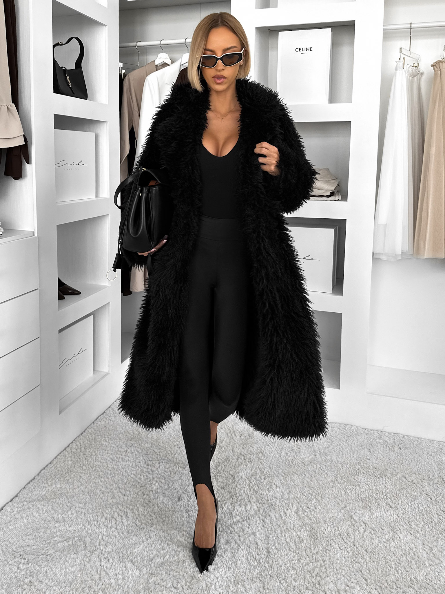 Černý faux fur dlouhý kožešinový kabát HOAIN Velikost: M/L