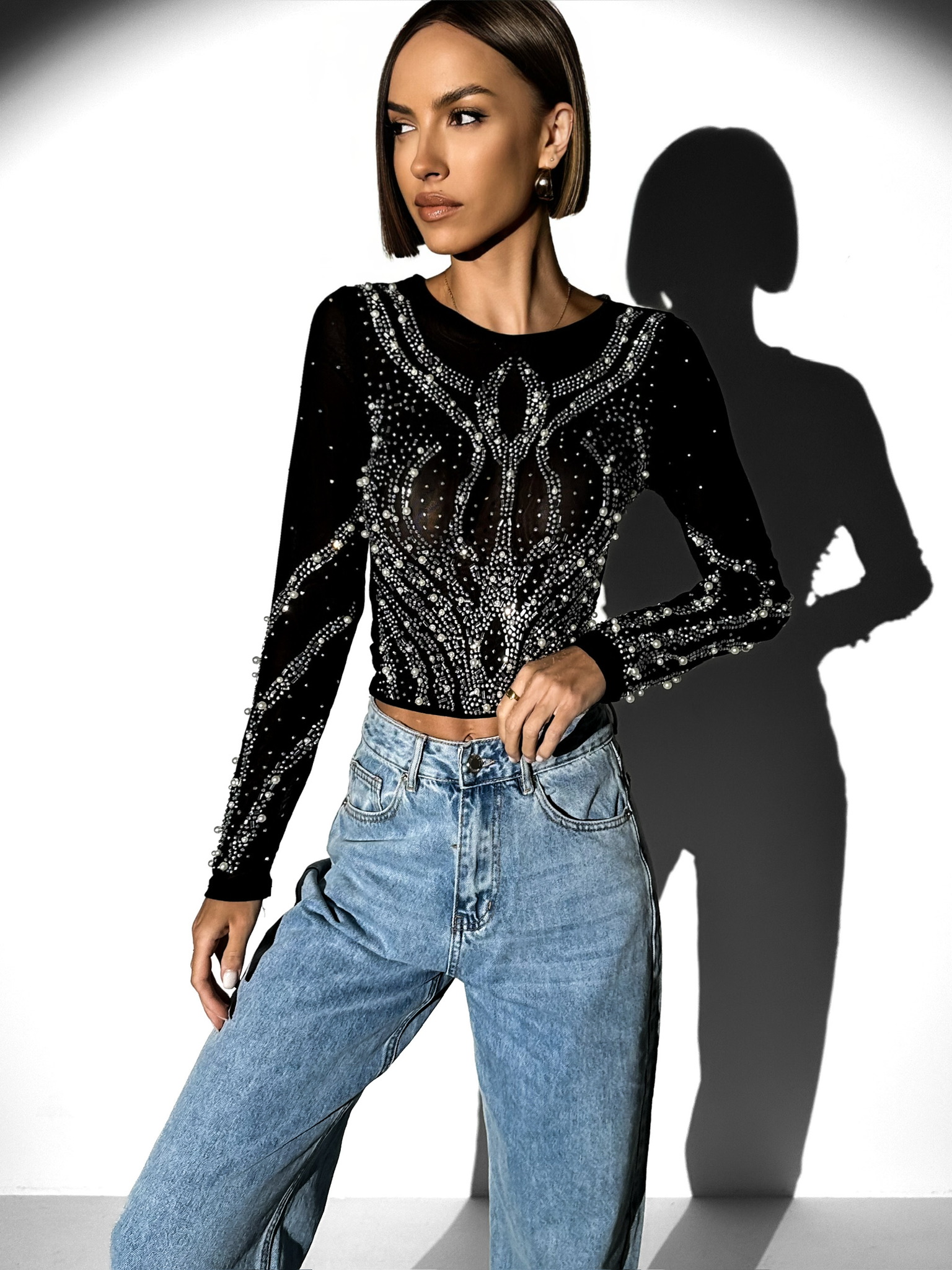 Černý třpytivý top ARLIS s perličkami Velikost: M/L