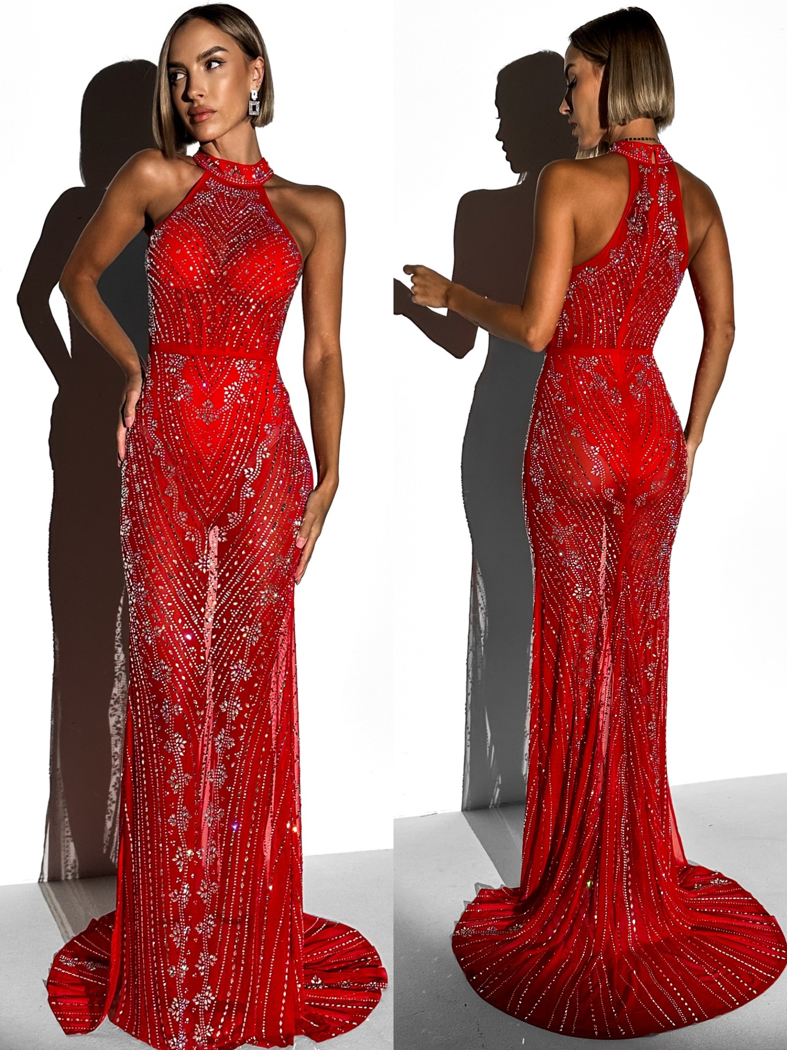 Červené dlouhé třpytivé večerní šaty FARMER s kamínky Velikost: M
