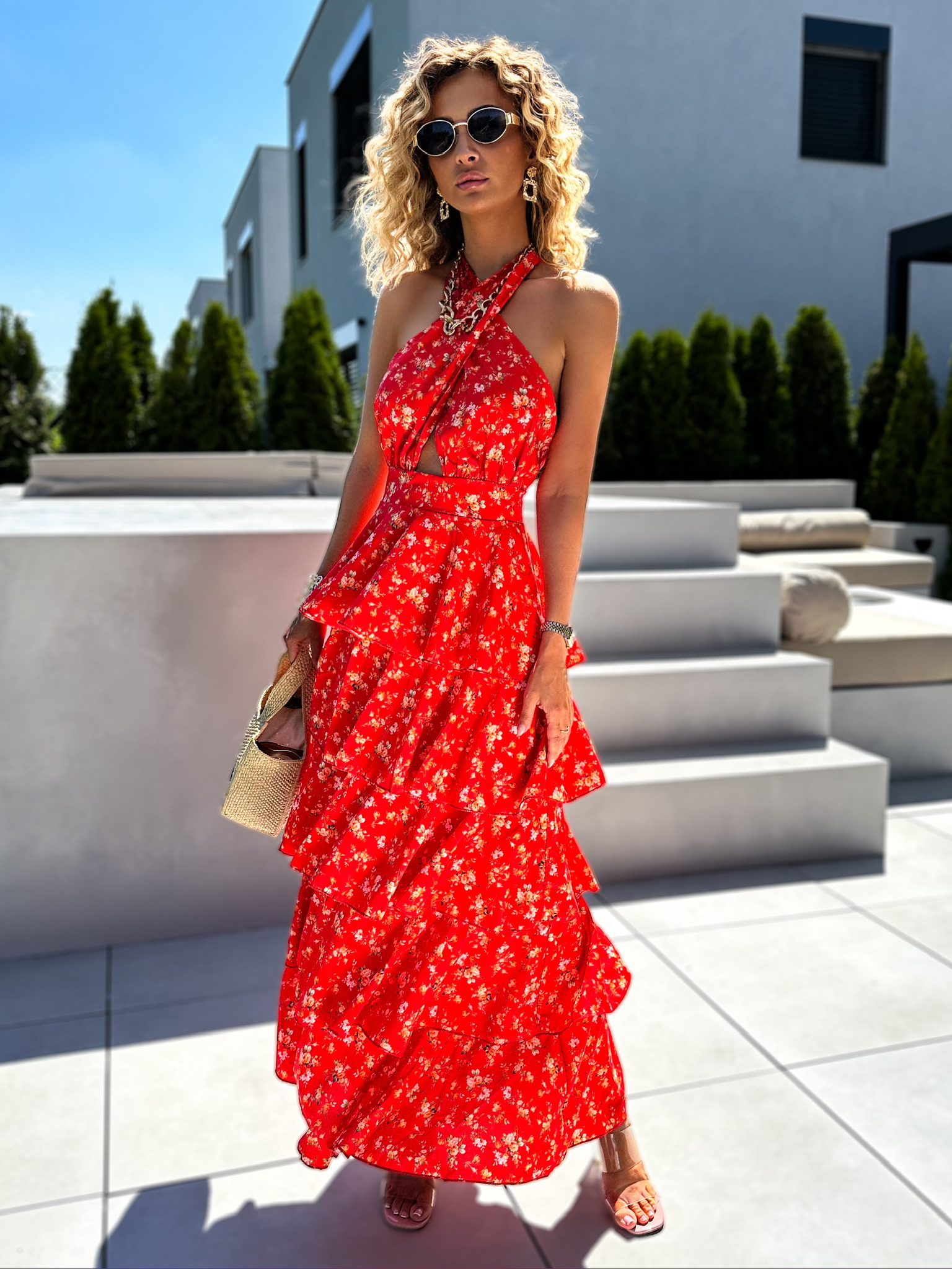 Červené dlouhé volánkové šaty XOXITL Velikost: ONESIZE