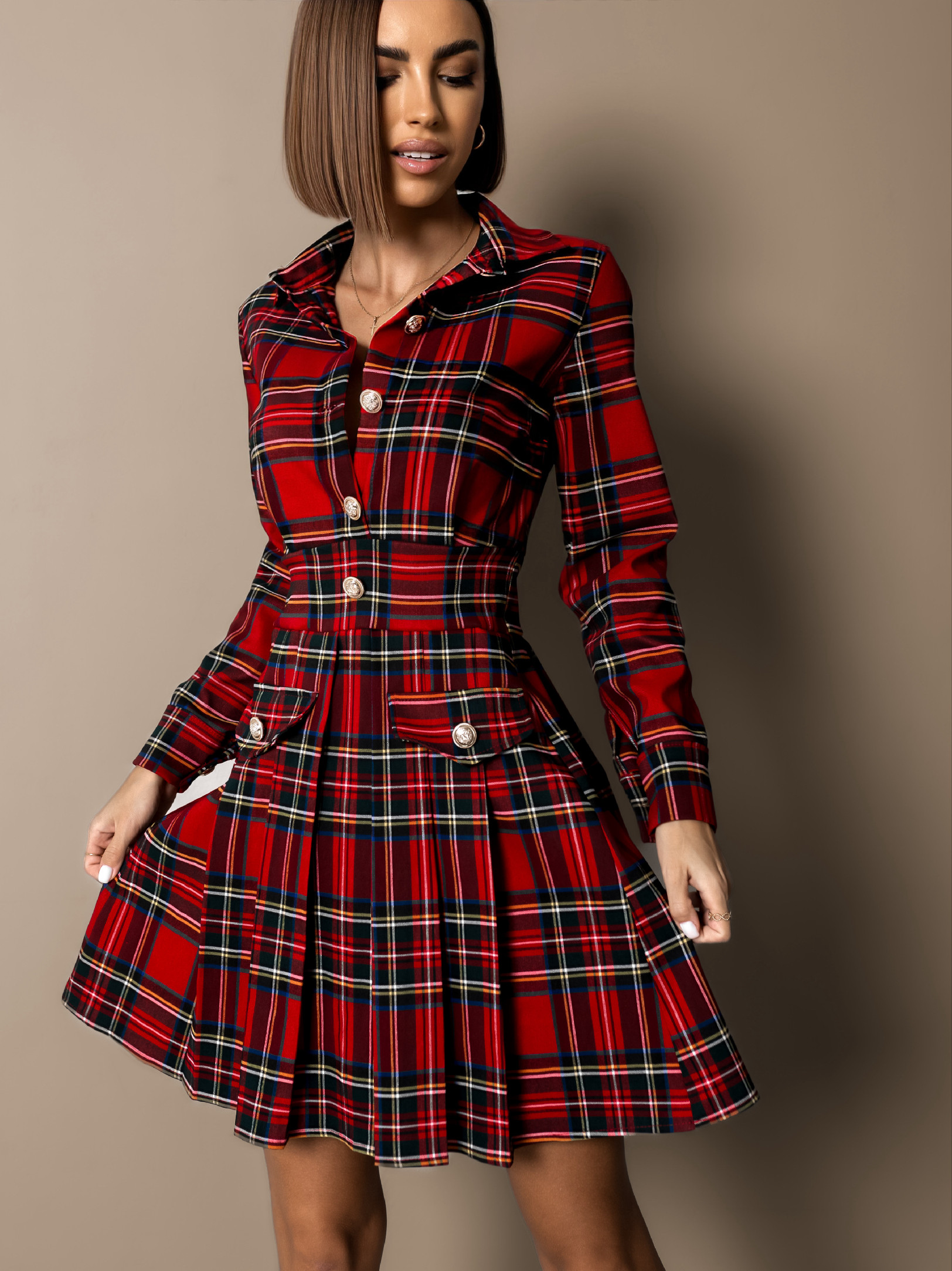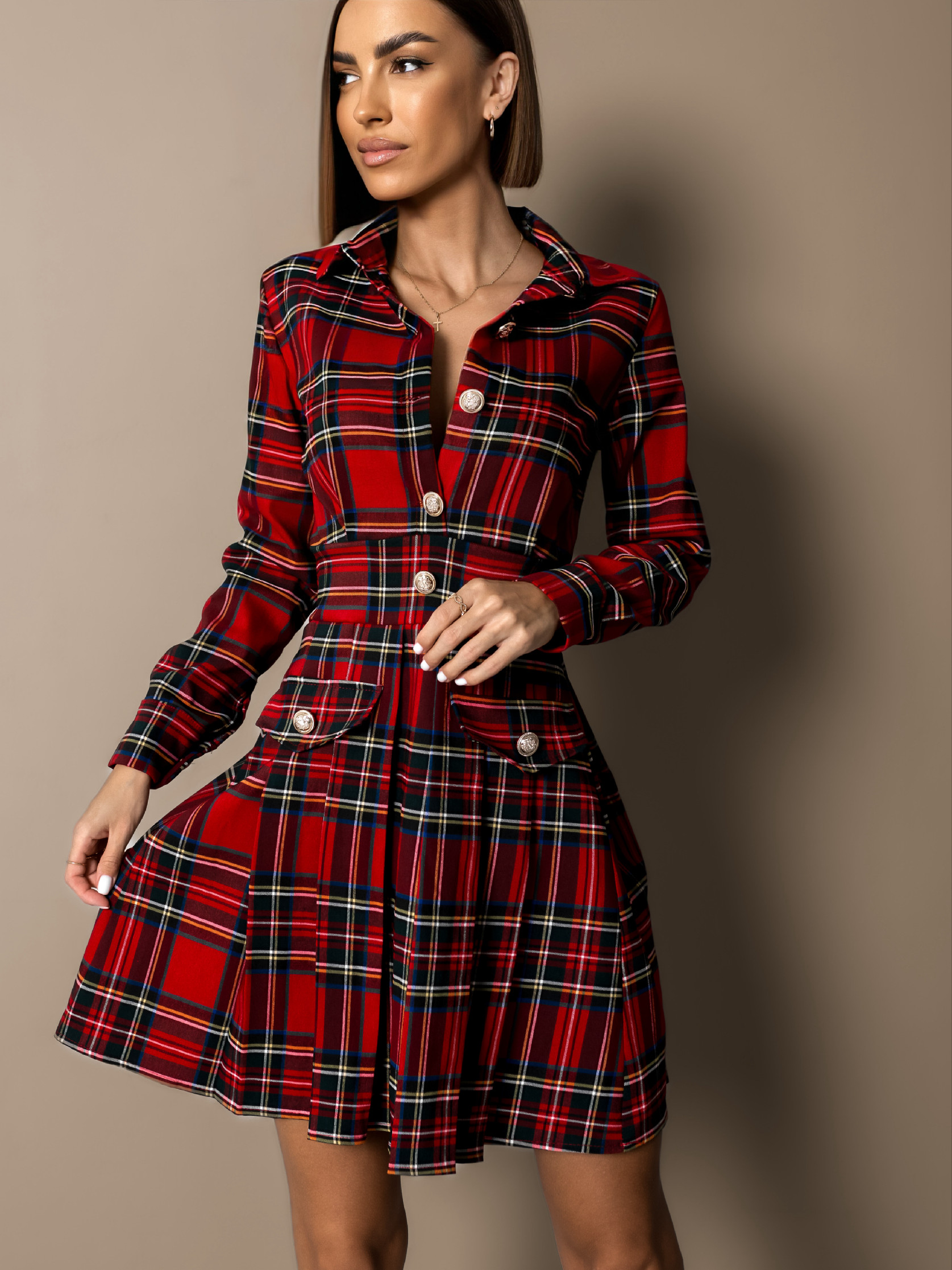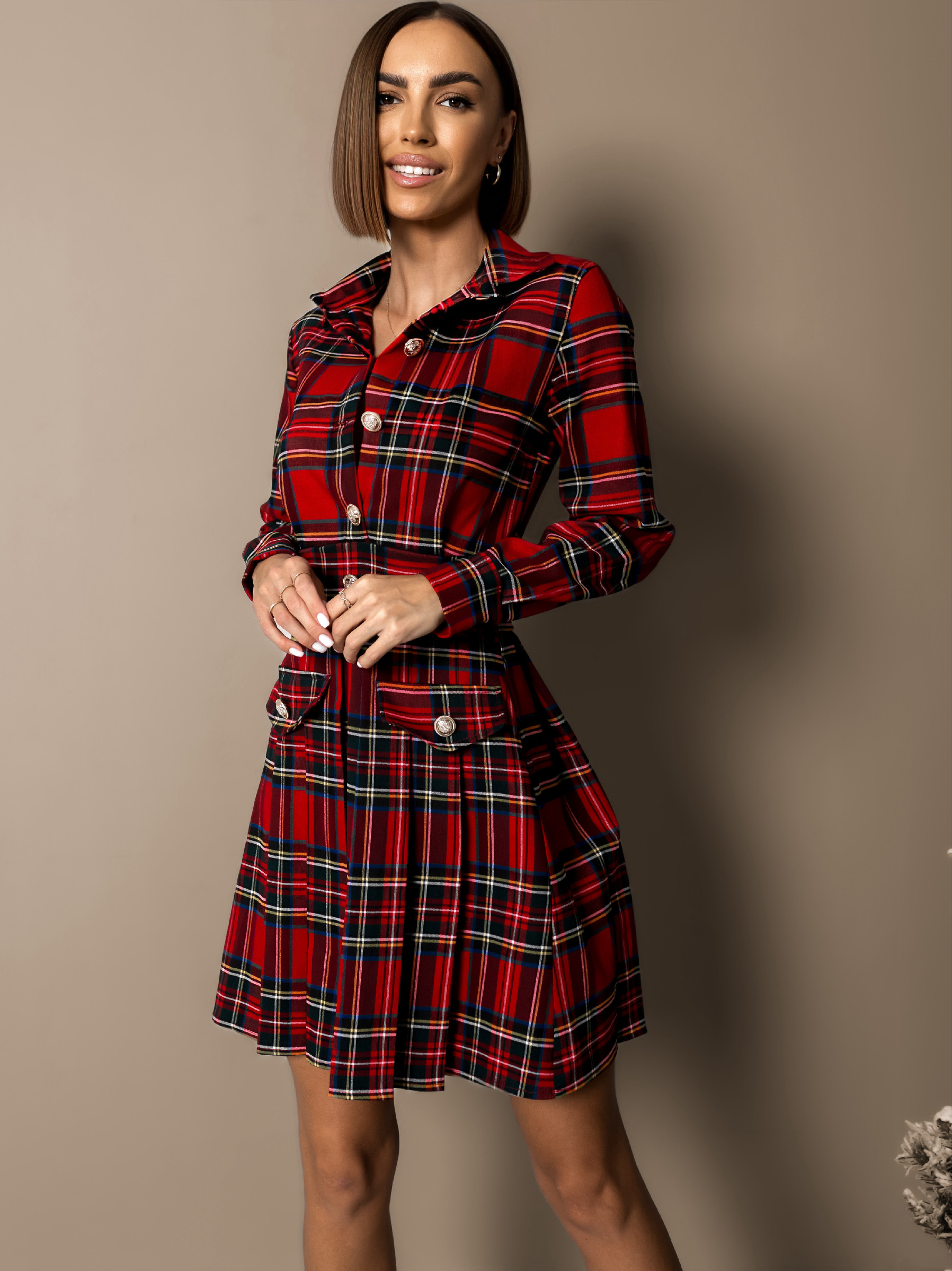 Červené kárované šaty OINEUS s knoflíky Velikost: M