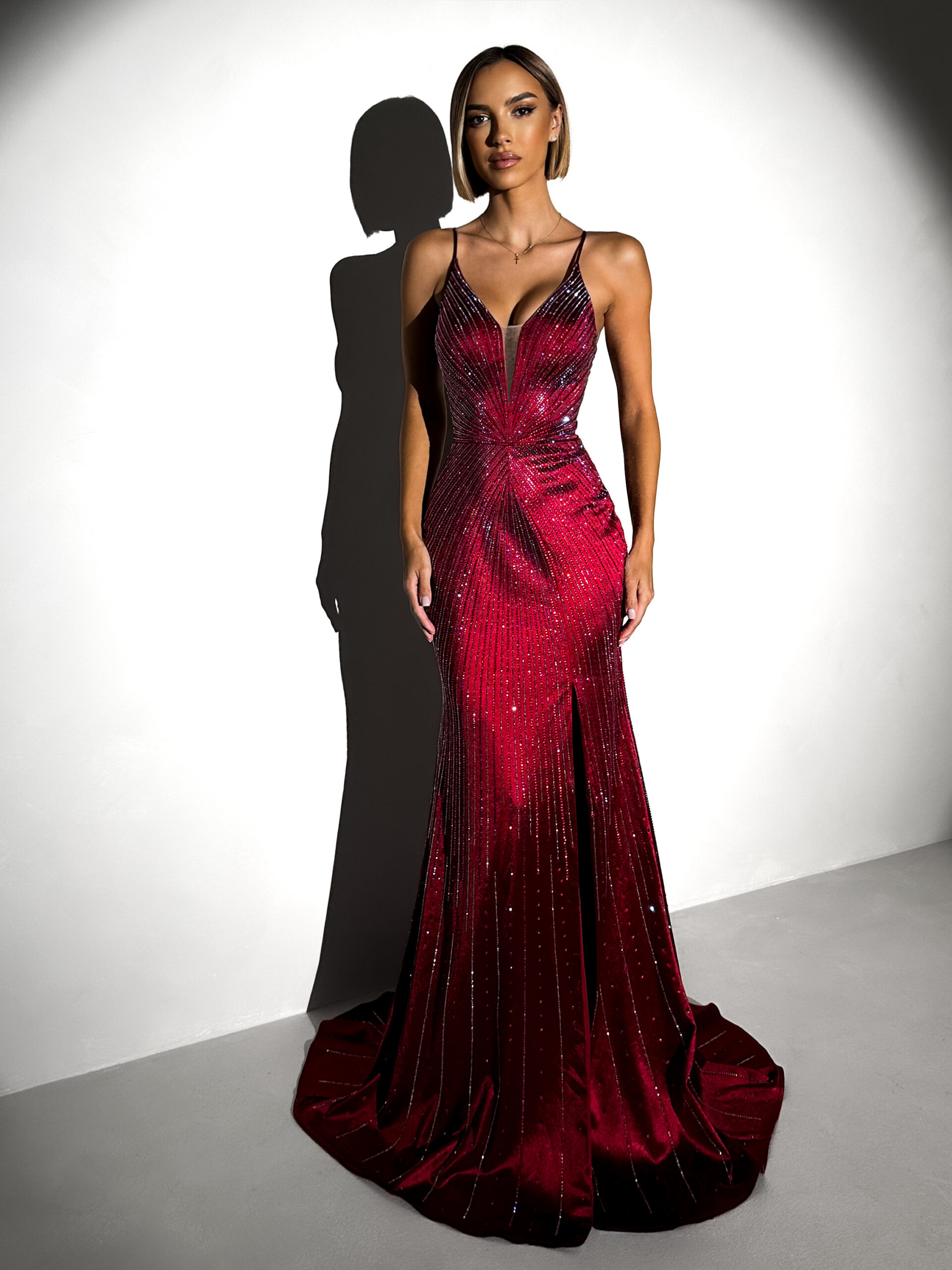 Červené plesové třpytivé šaty RAVELLE s rozparkem Velikost: M