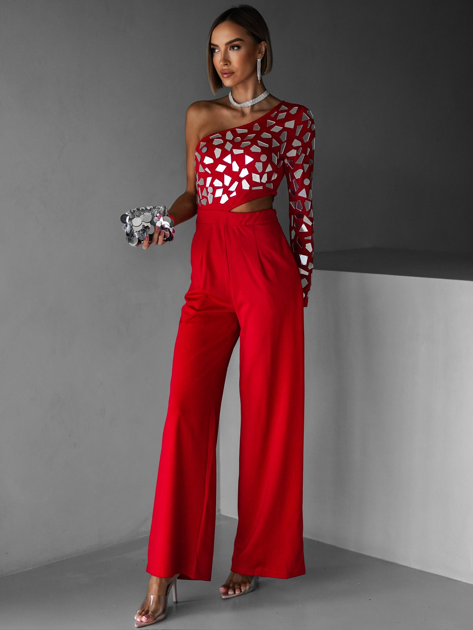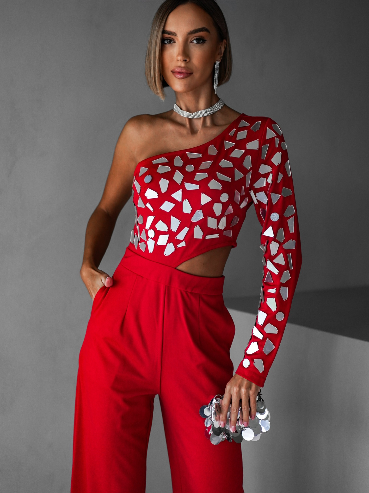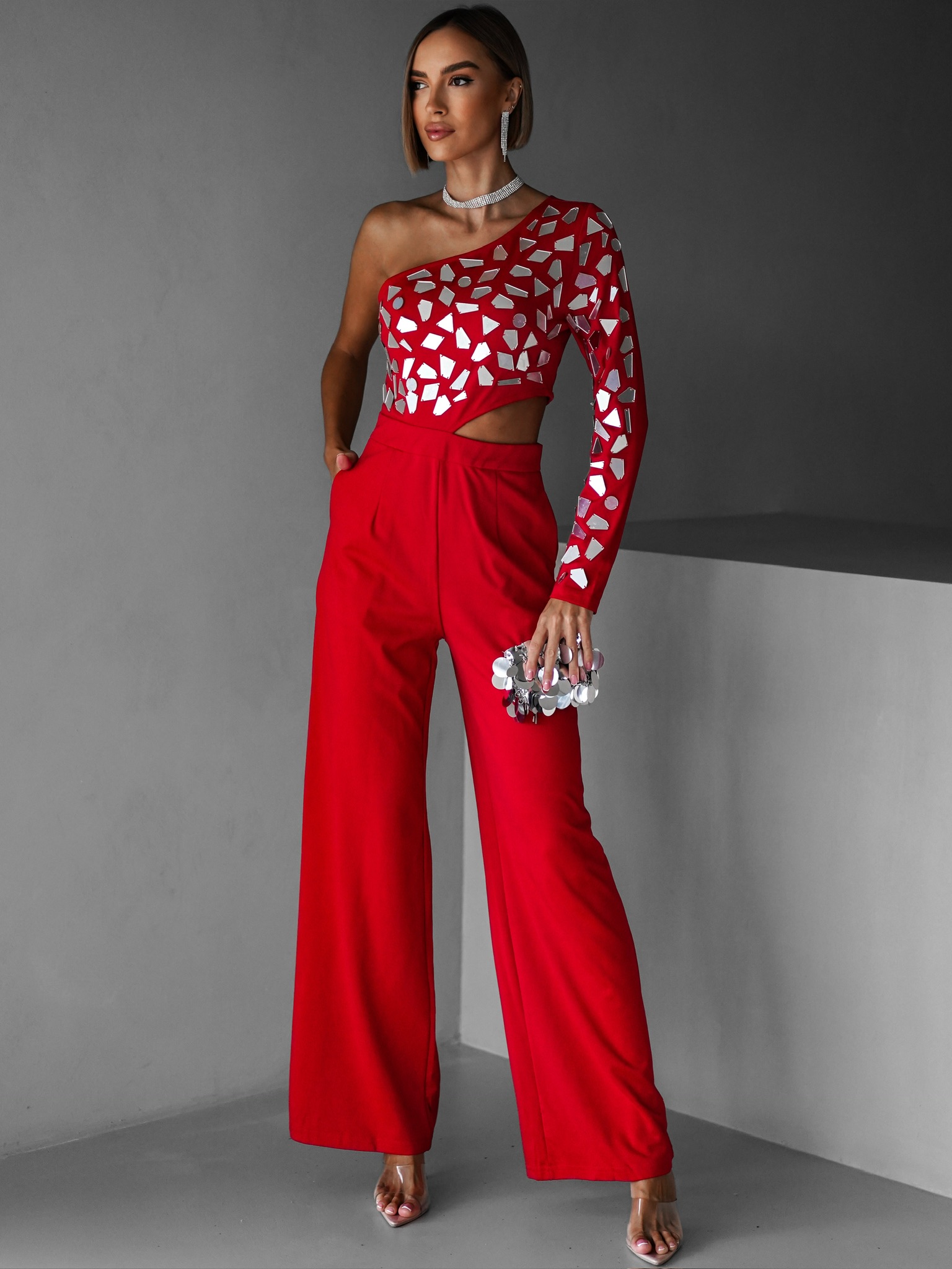 Červený elegantní overal EDIVAD na jedno rameno Velikost: L