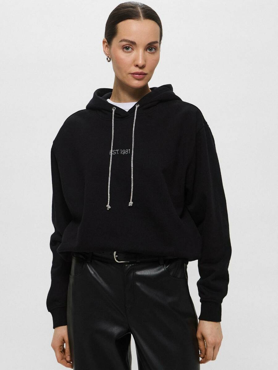 dámská černá mikina s kapucí od Guess.Mikina má kamínkoou aplikaci na přední i zadním díle.Materiál:80% bavlna20% polyester
