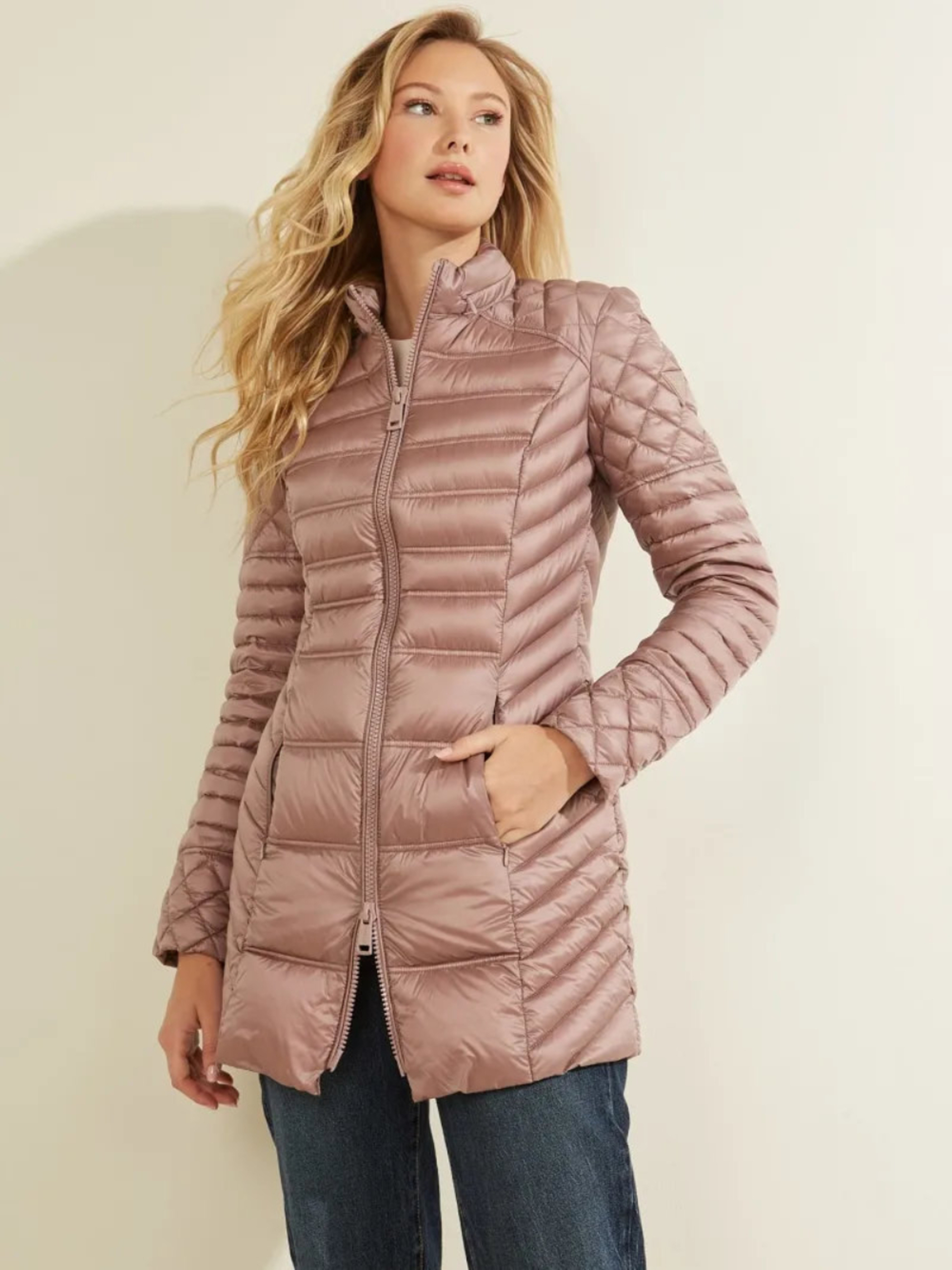 dámská lehká starorůžová bunda od Guess.Bunda je péřová.Skrytá kapuce.Materiál:100% PolyamidStřih:Slim fit