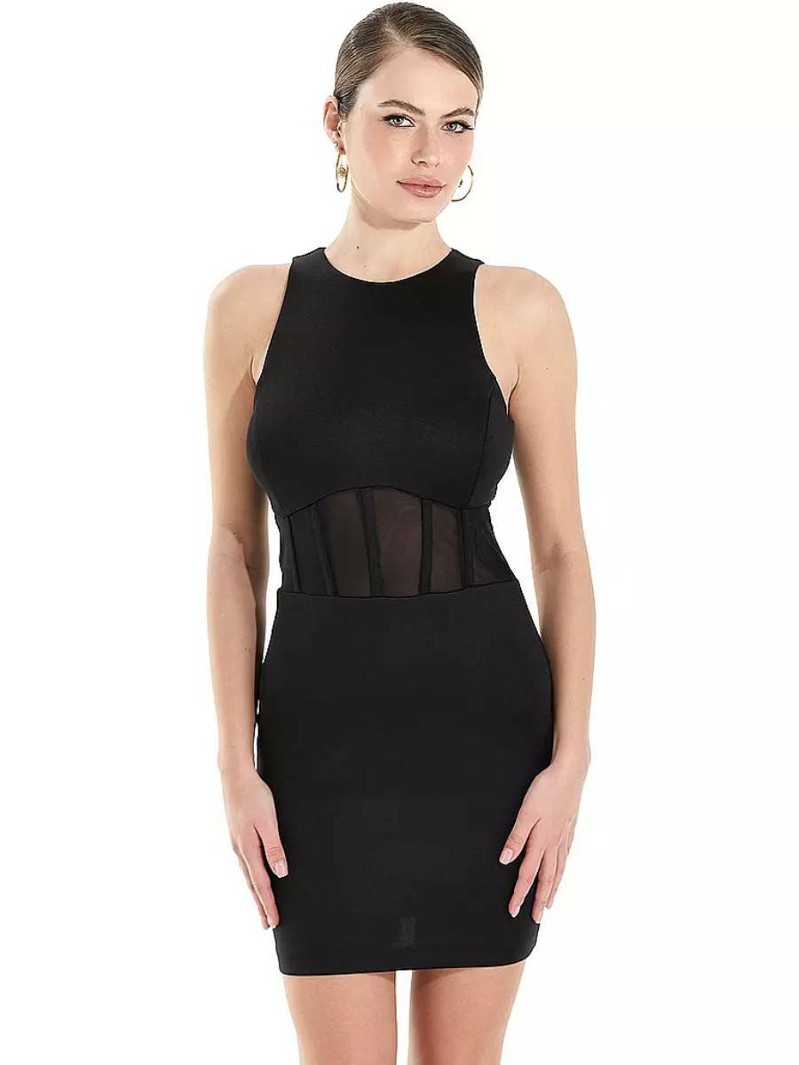 dámské černé pouzdrové šaty od Guess.Šaty mají v pase síťovanou část a na zádech zapínání na zip.Pevnější materiál.Materiál:91% polyester9% elastan
