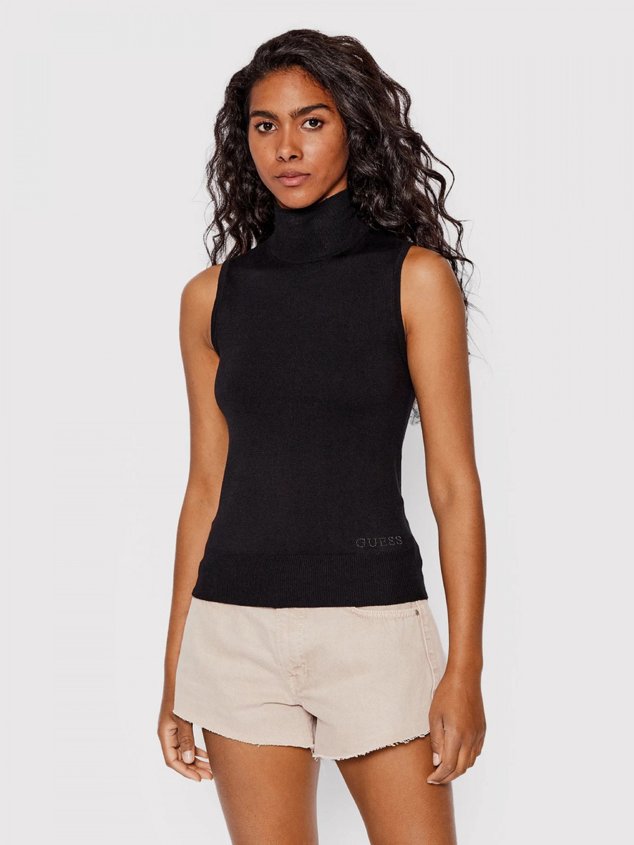 Dámský černý svetřík bez rukávů od Guess.Materiál:71% viskóza29% polyamidStřih:Slim Fit