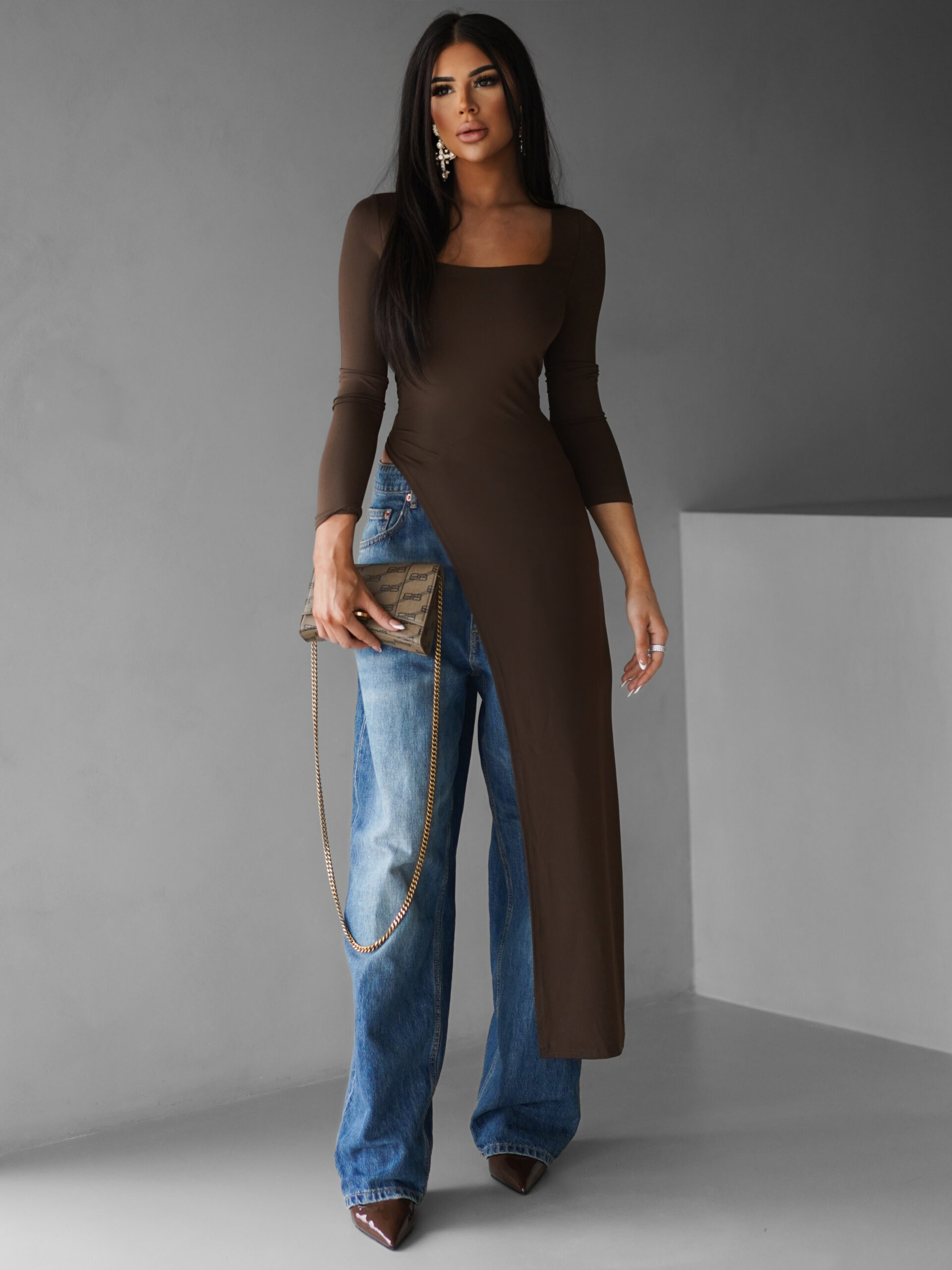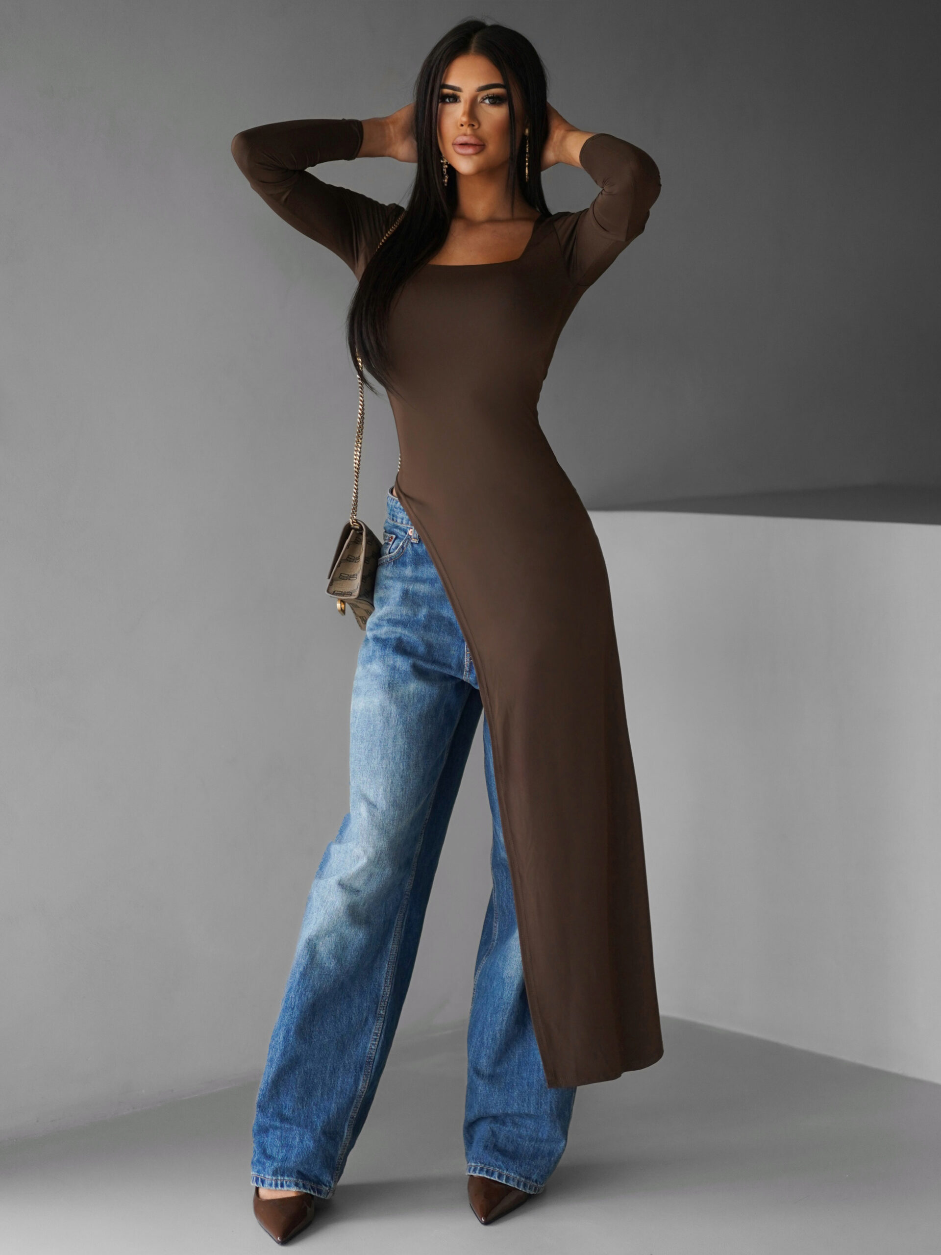 Hnědá asymetrická dlouhá tunika GIANG s dlouhým rukávem Velikost: M/L