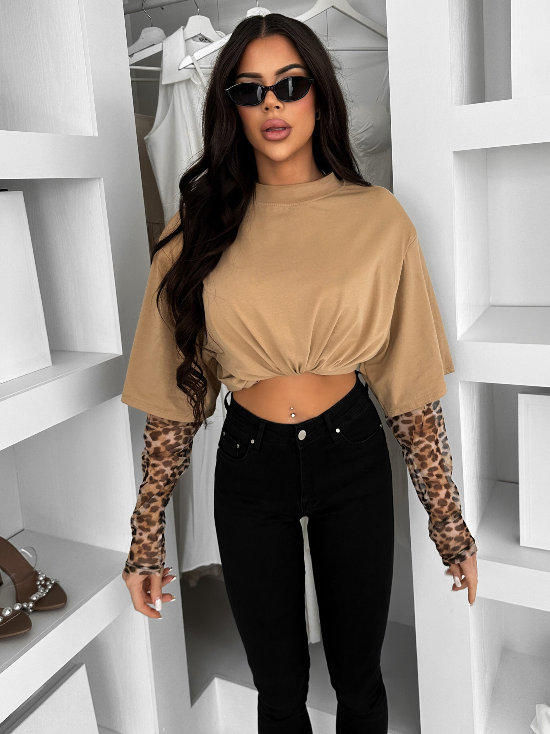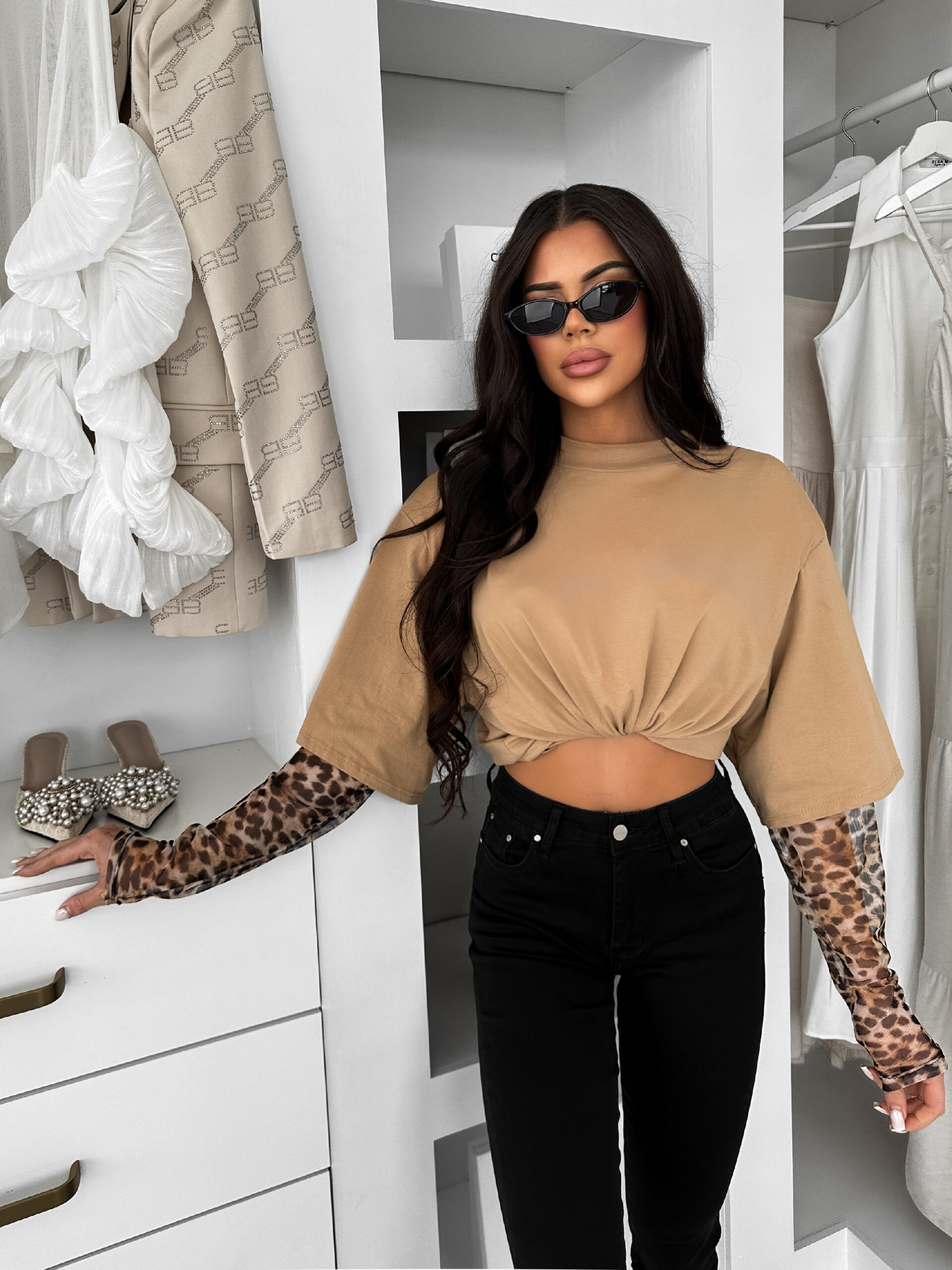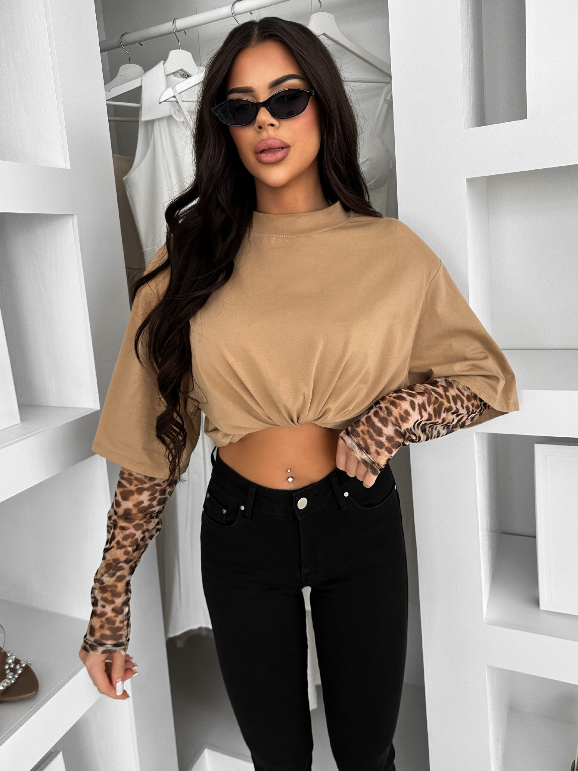 Hnědé tričko VIREYALA s leopardími rukávy Velikost: ONESIZE