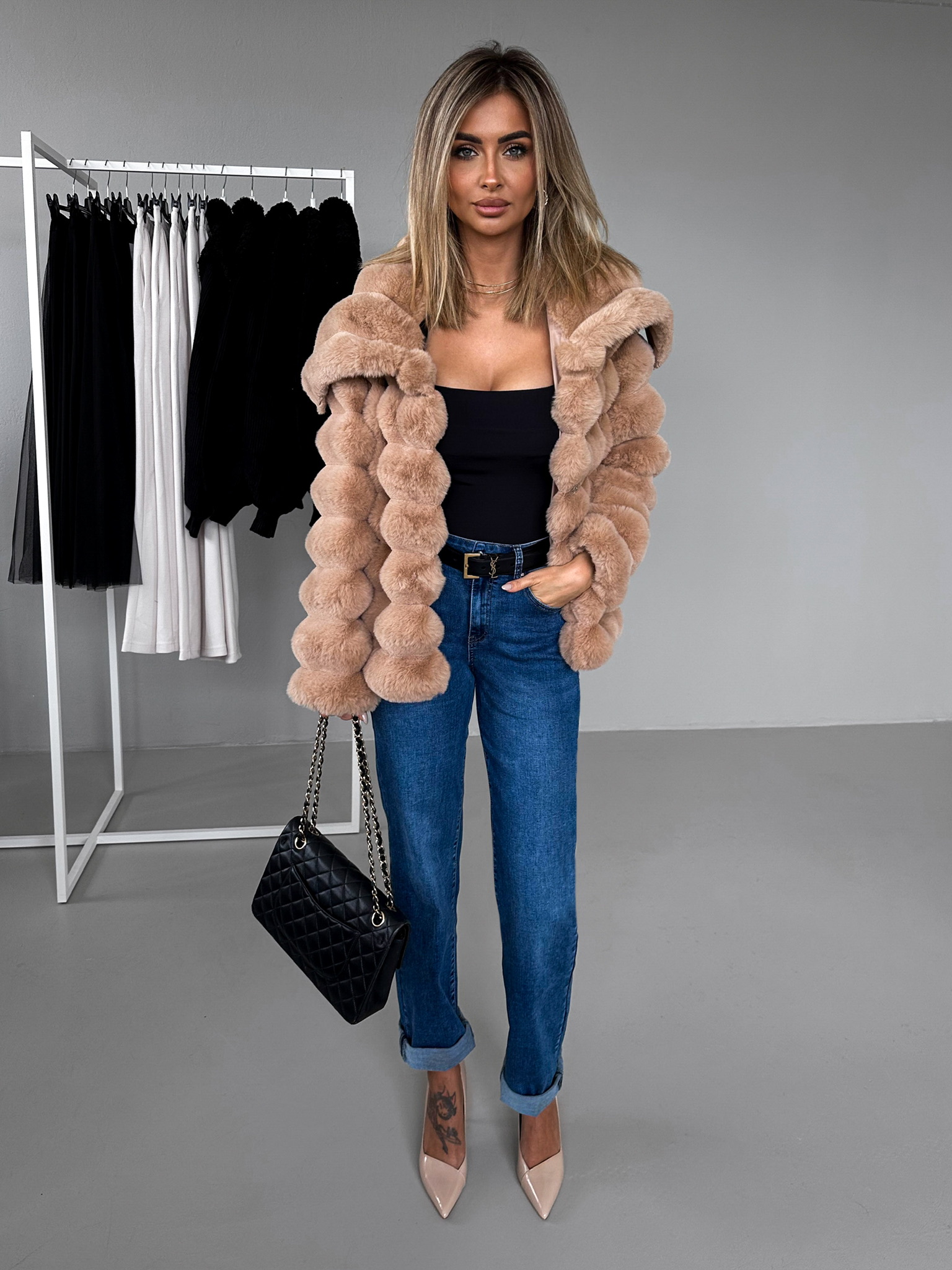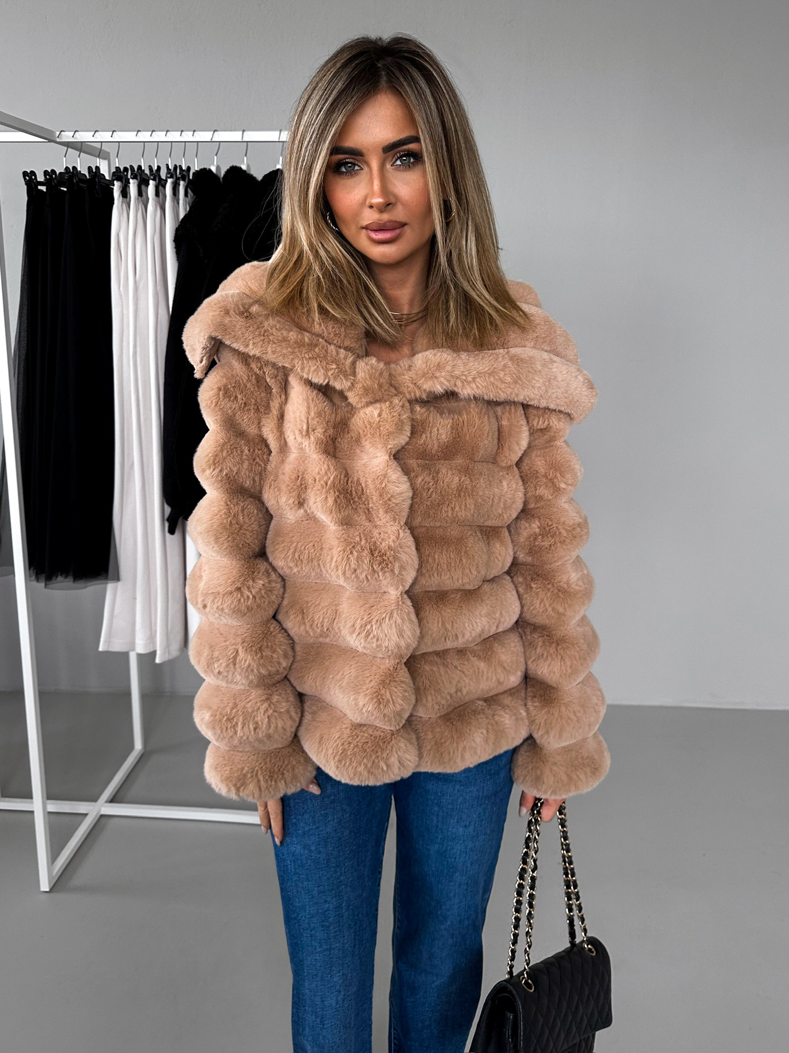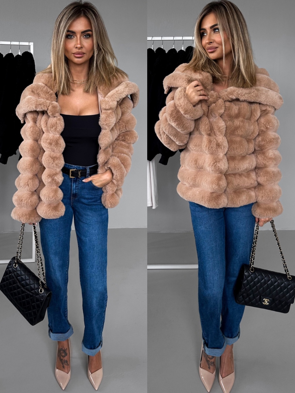 Hnědý krátký faux fur kožešinový kabát MOUNA Velikost: ONESIZE