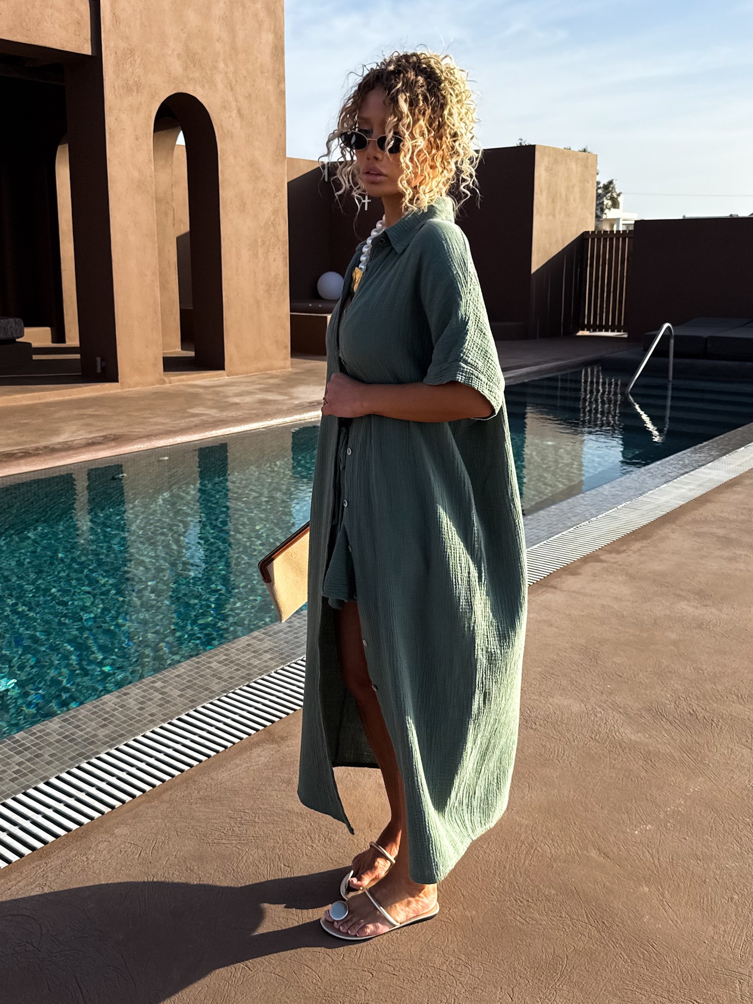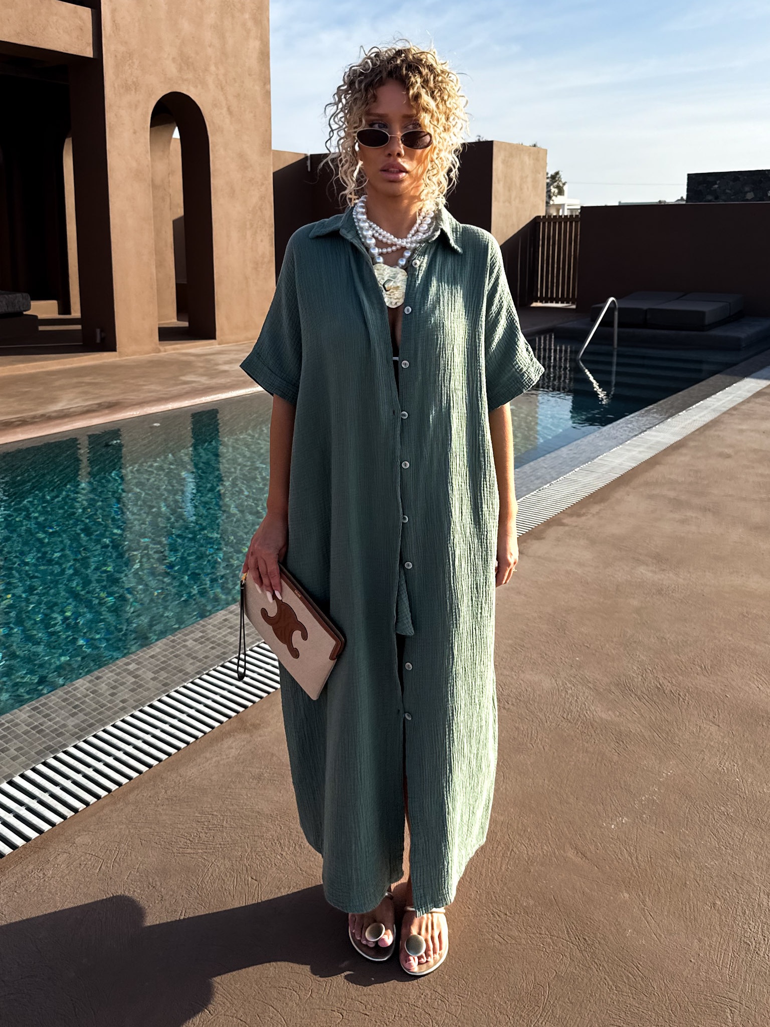 Khaki dlouhé mušelínové košilové maxi šaty NUKET Velikost: ONESIZE