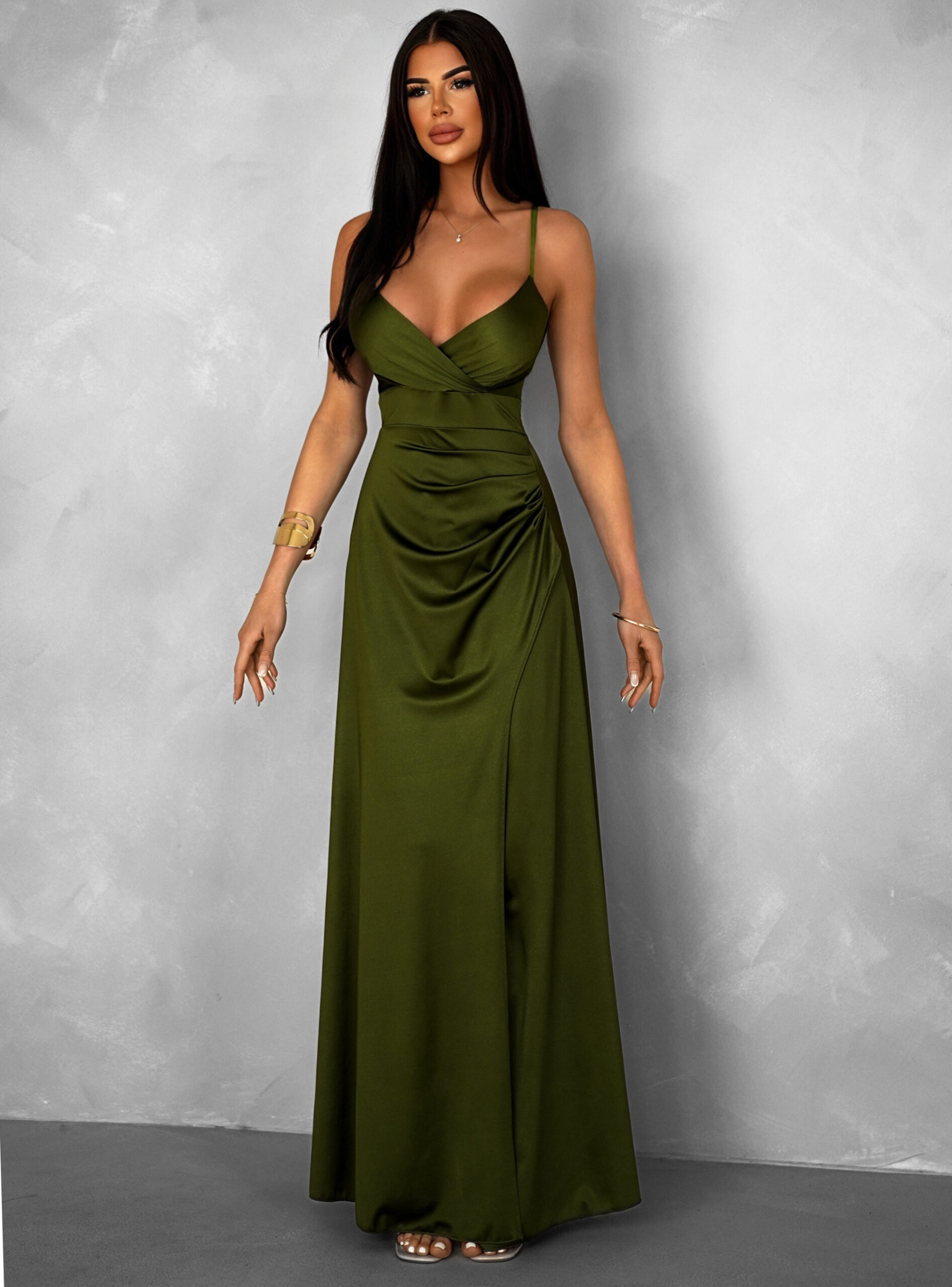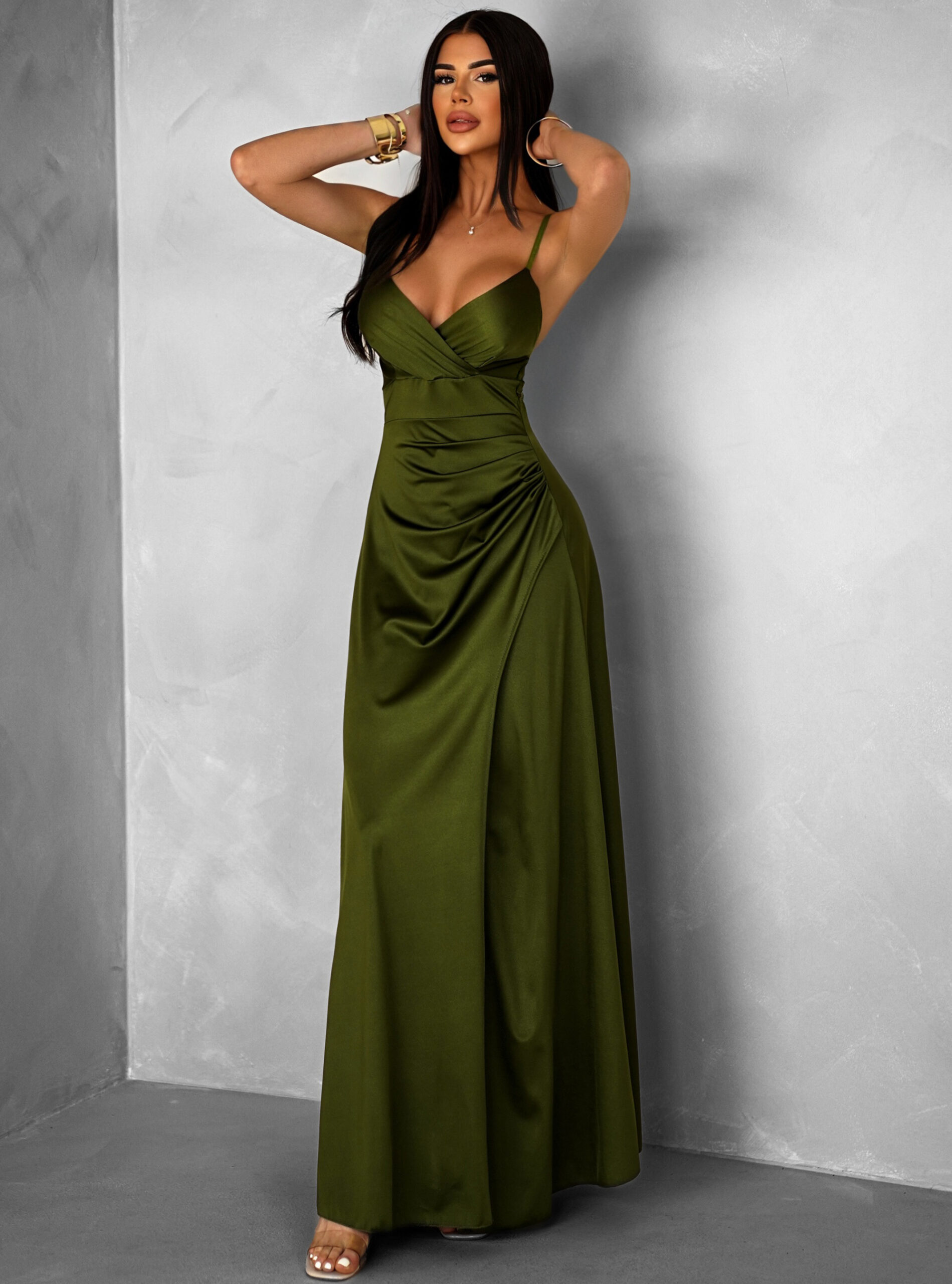 Khaki dlouhé saténové šaty ARANKA Velikost: ONESIZE