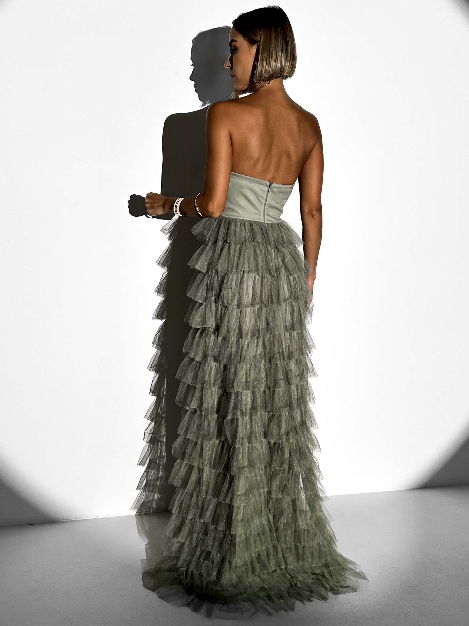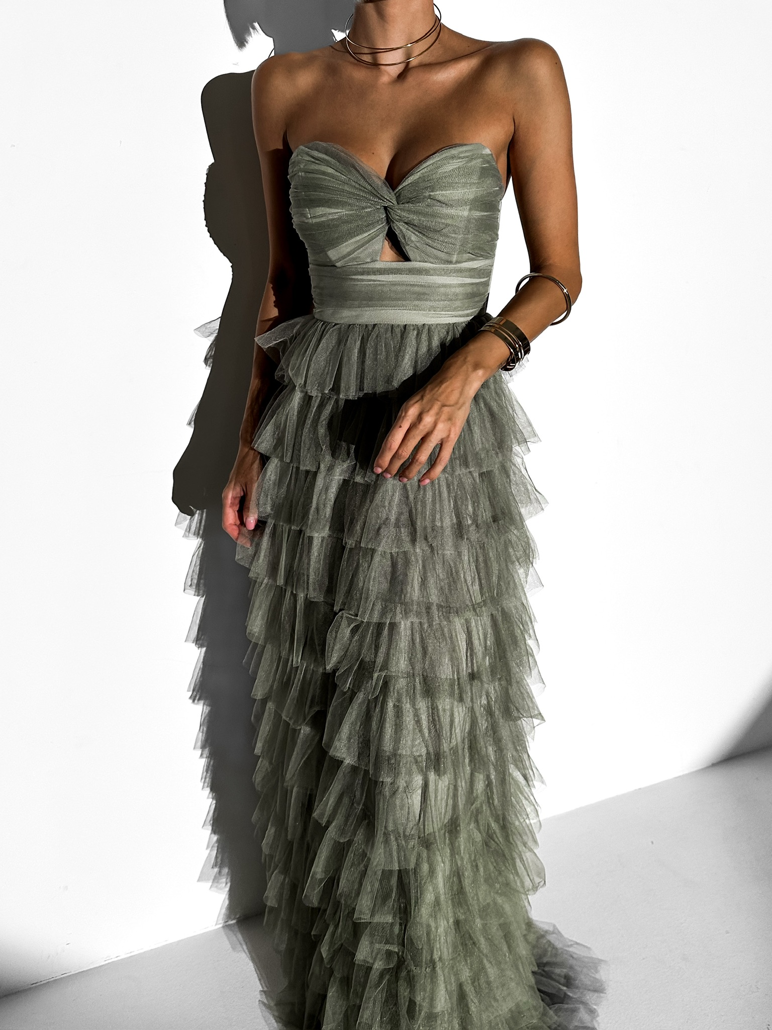 Khaki plesové tylové šaty BRUNHIL s volánky Velikost: L