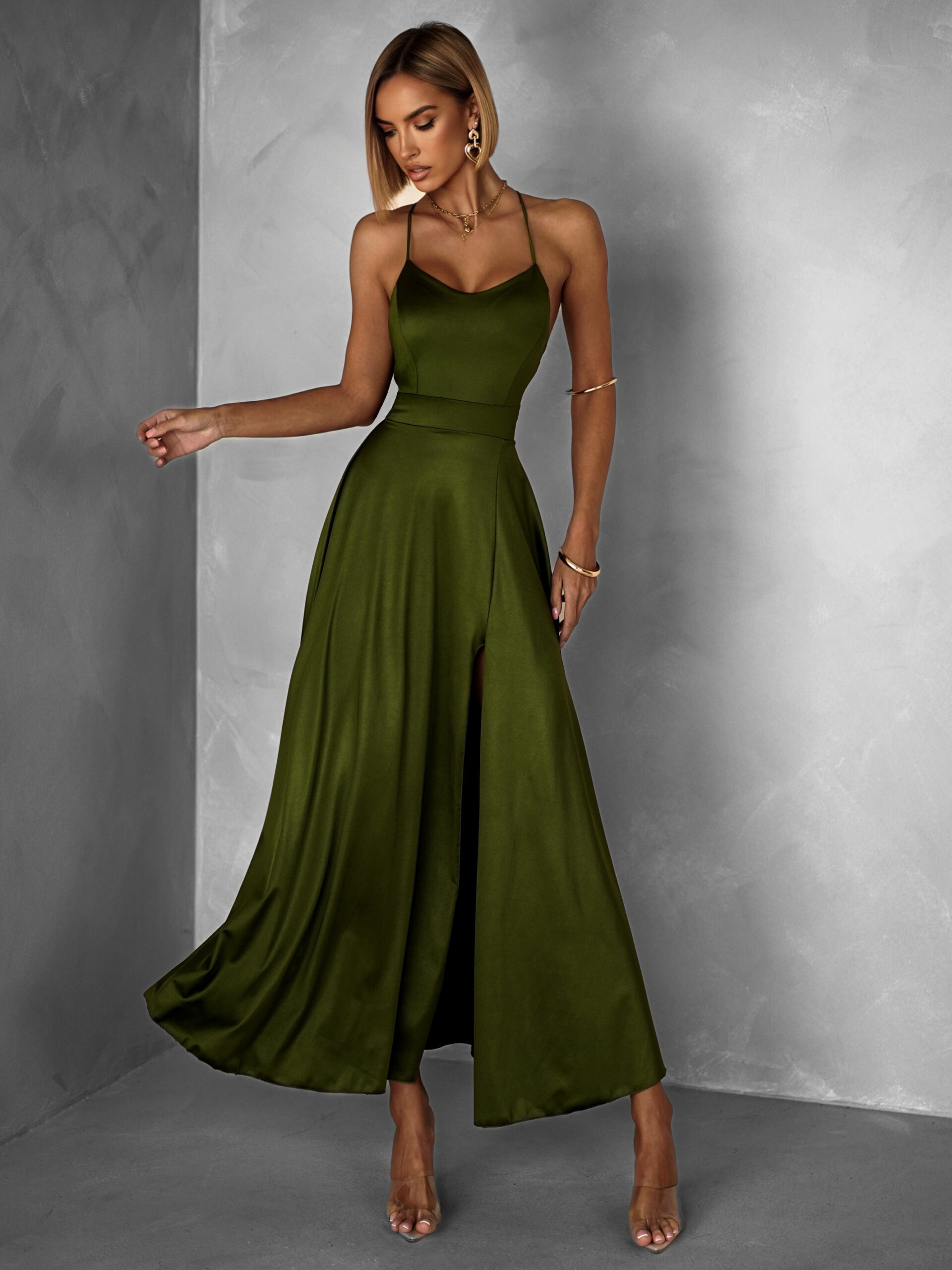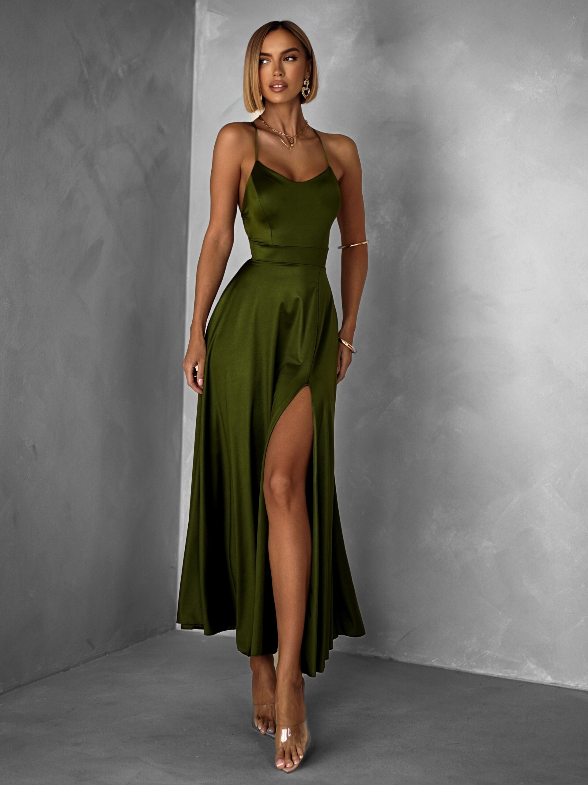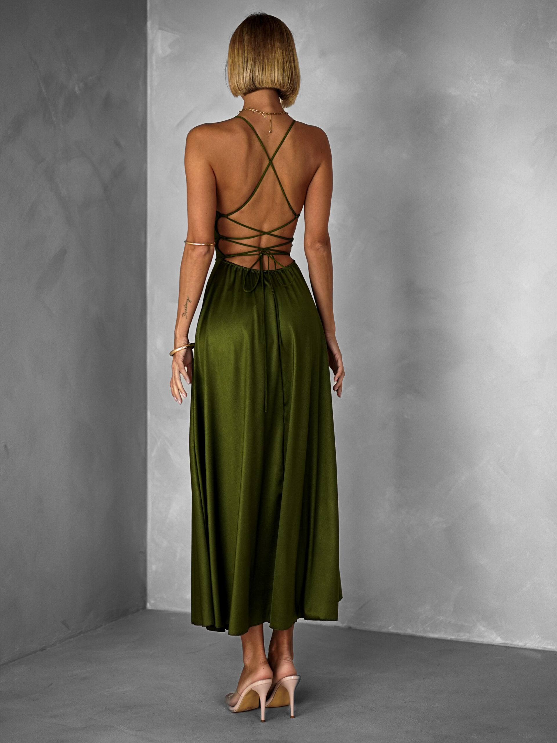 Khaki saténové midi šaty SIMUEL se šněrováním Velikost: ONESIZE