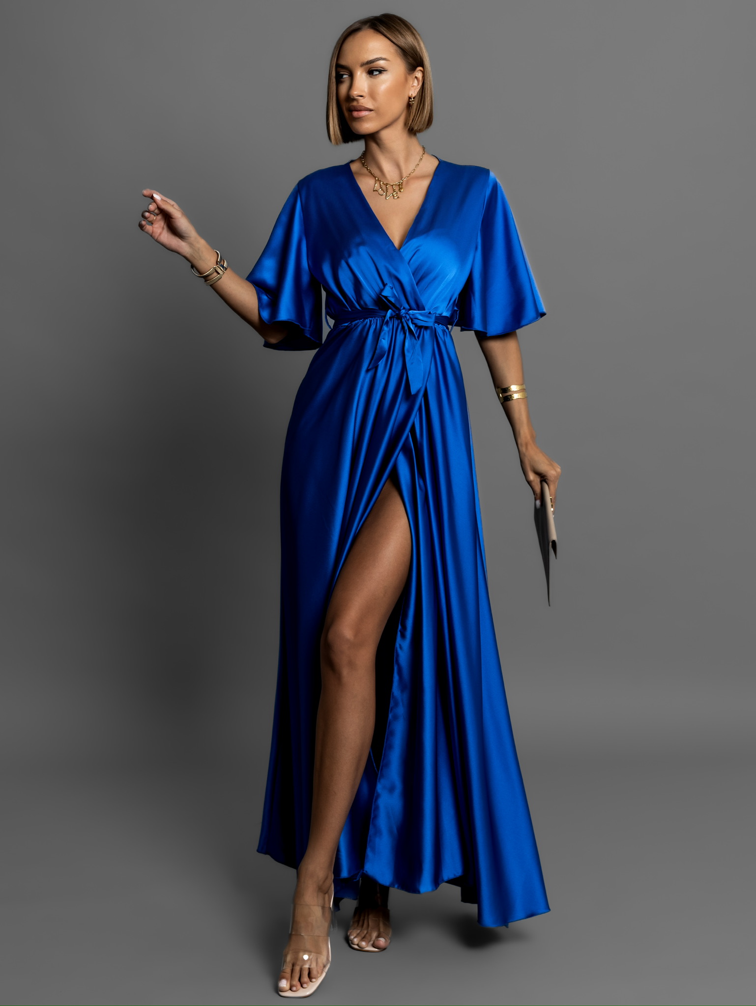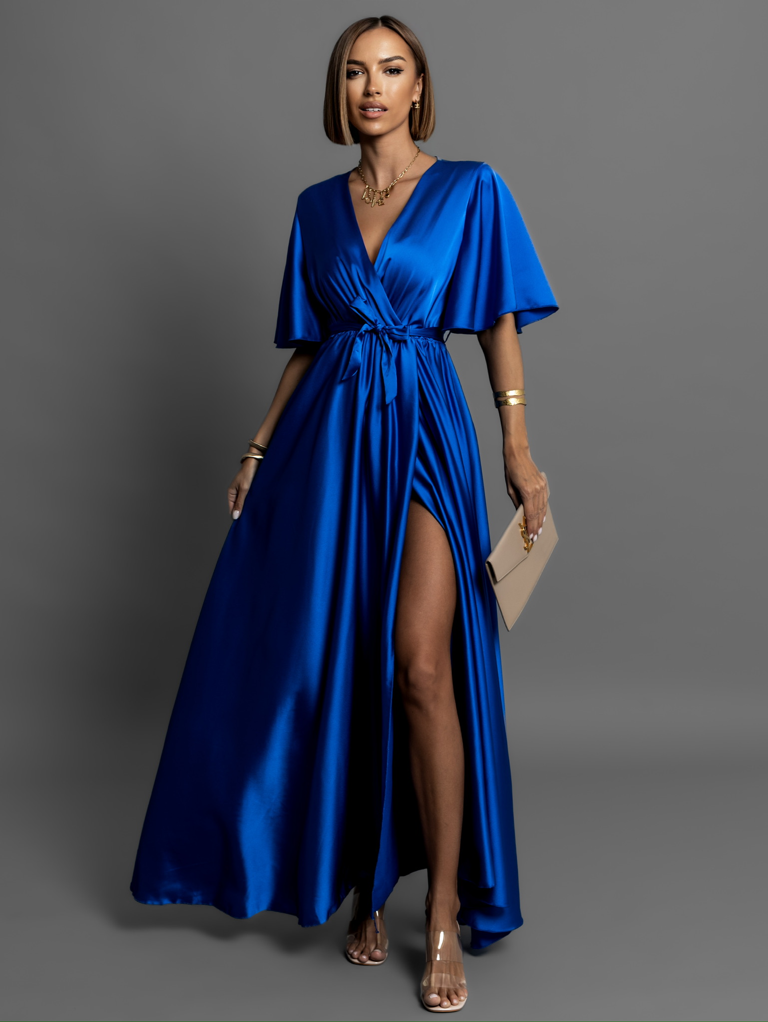 Královsky modré saténové dlouhé šaty GO HOME s krátkým rukávem Velikost: ONESIZE