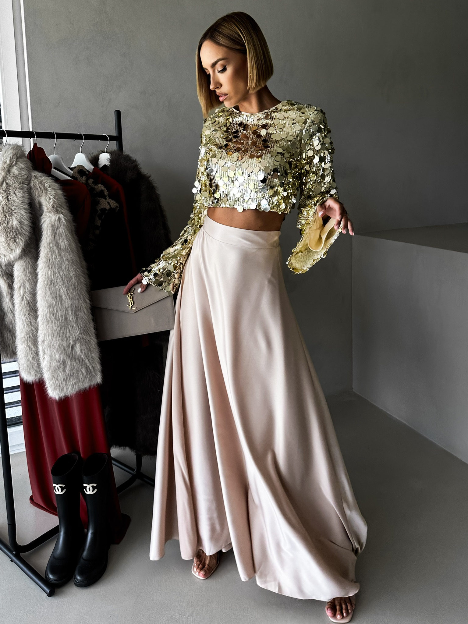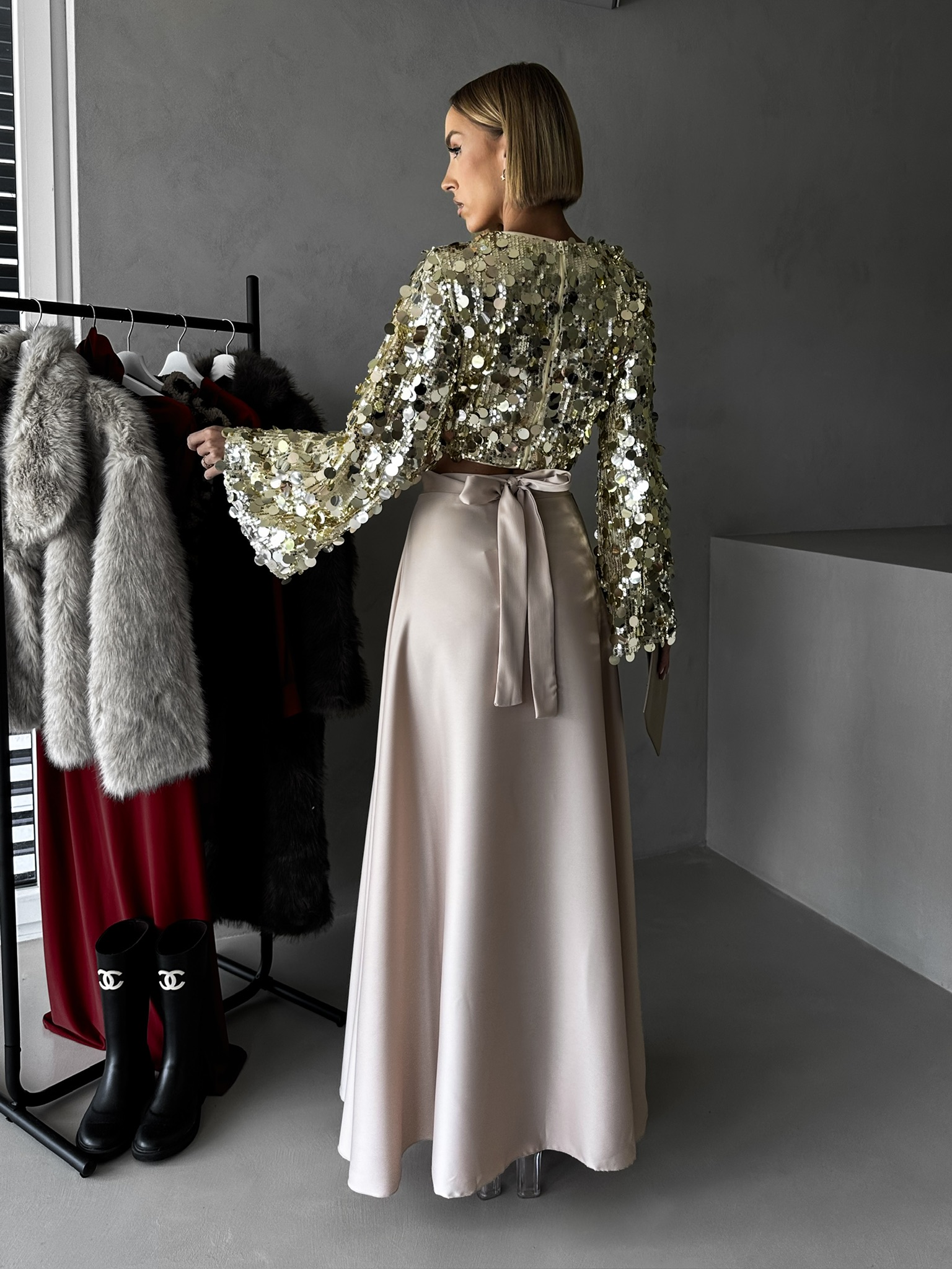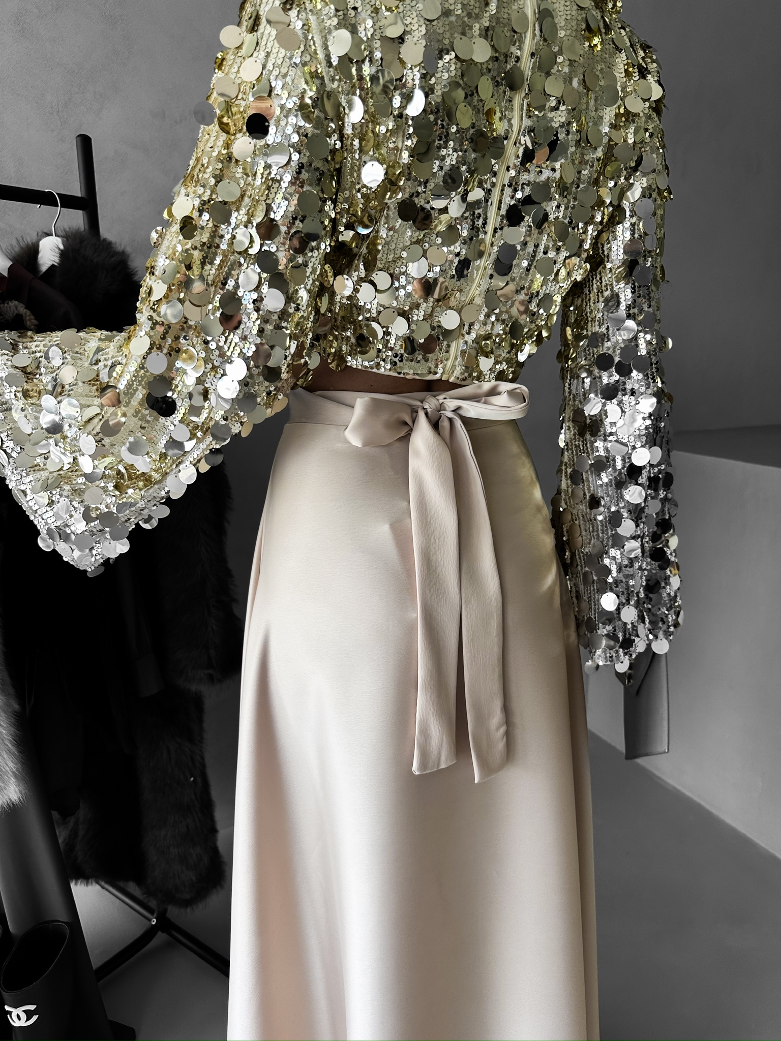 Krémová dlouhá zavinovací saténová sukně DENISSE na zavazání Velikost: ONESIZE