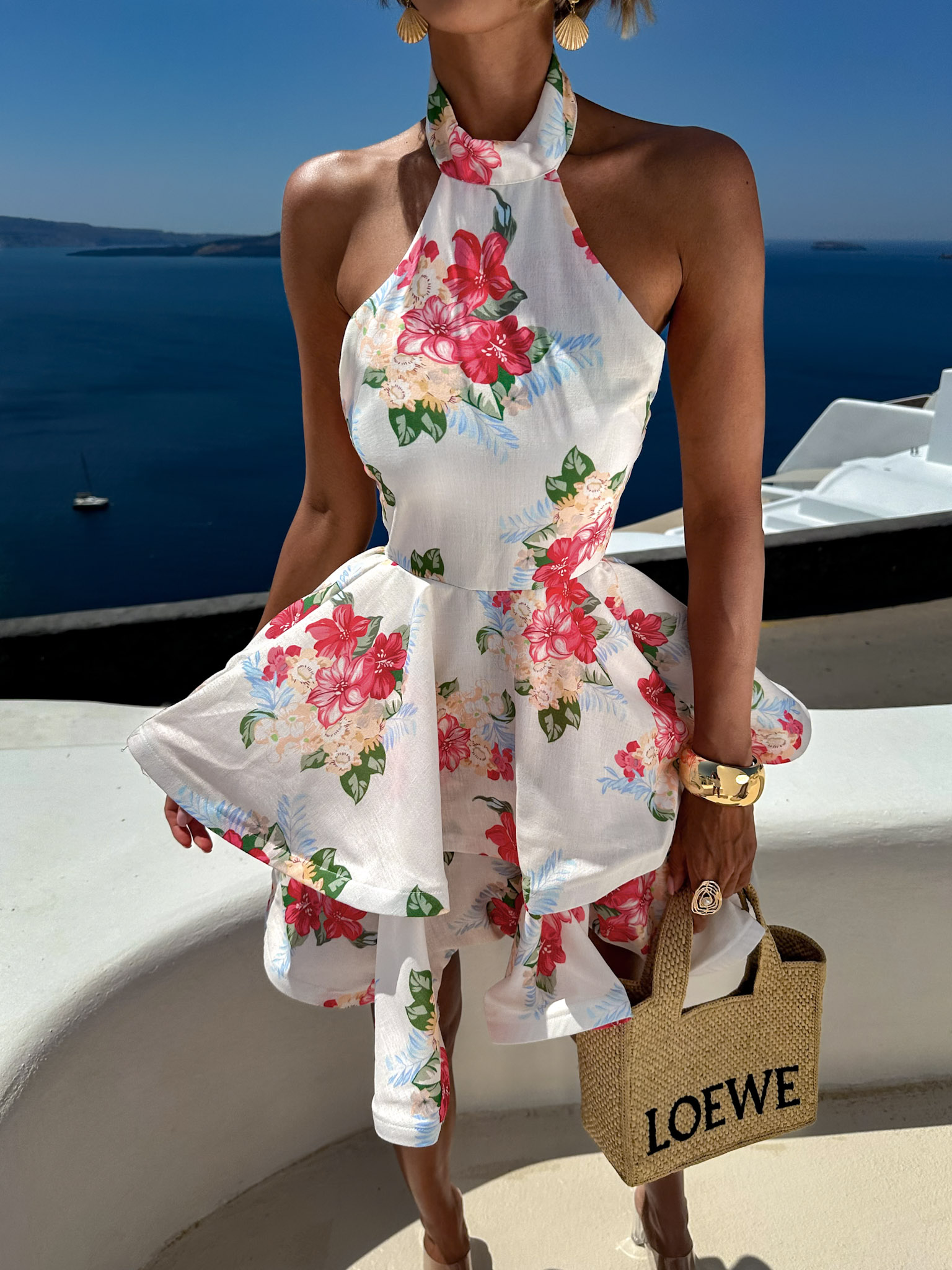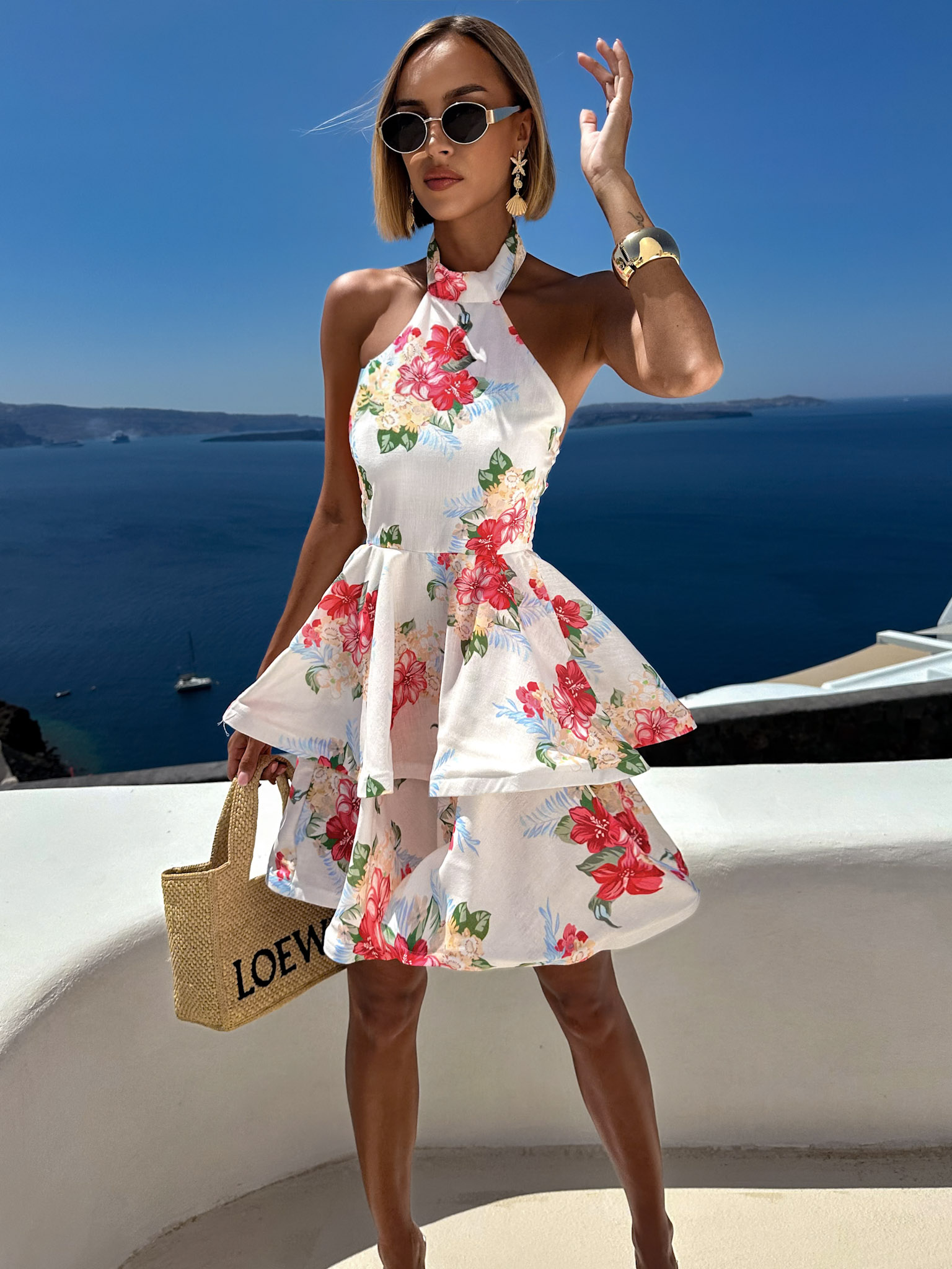 Krémové květinové krátké šaty FLORENY s volány Velikost: ONESIZE