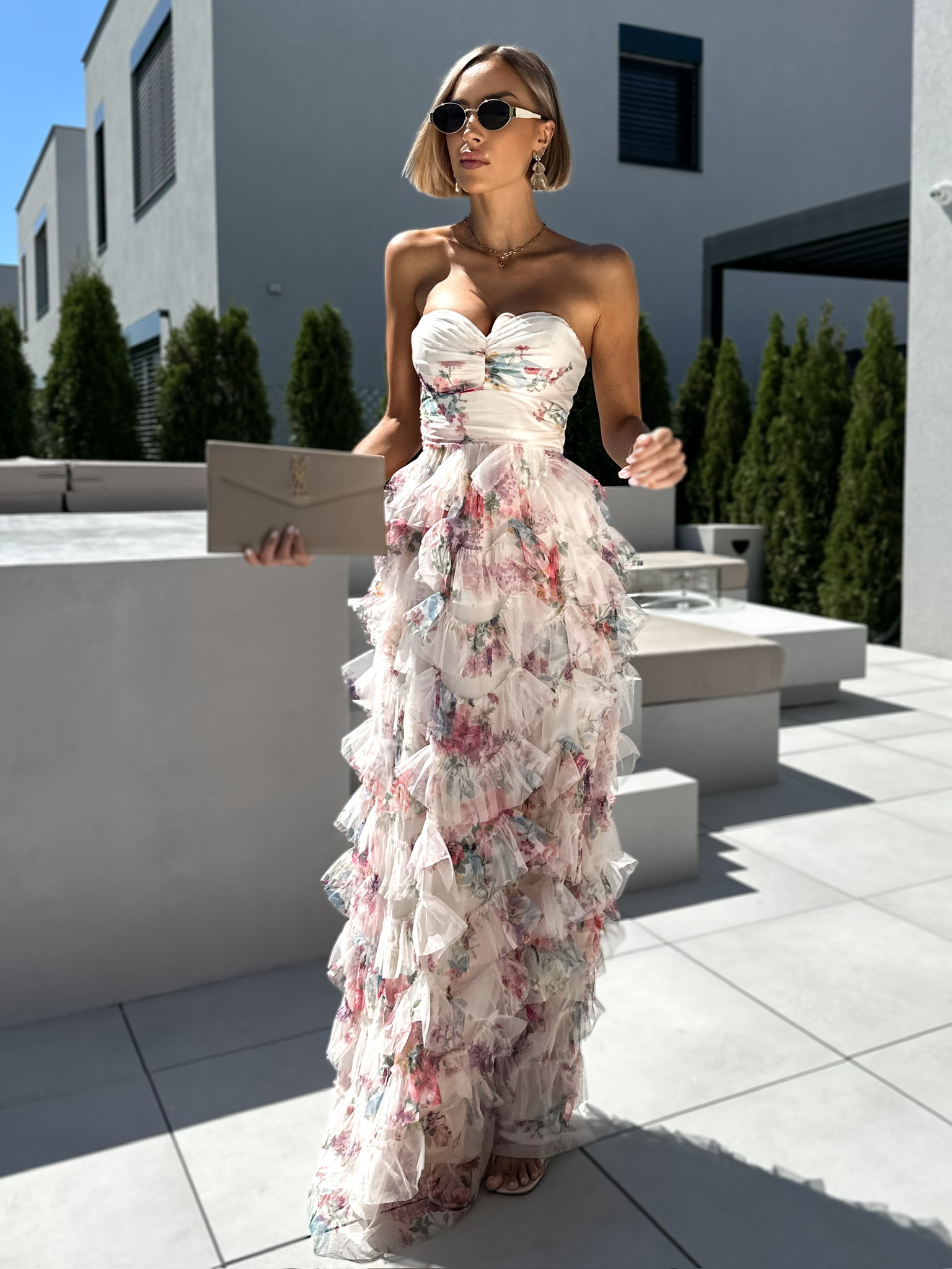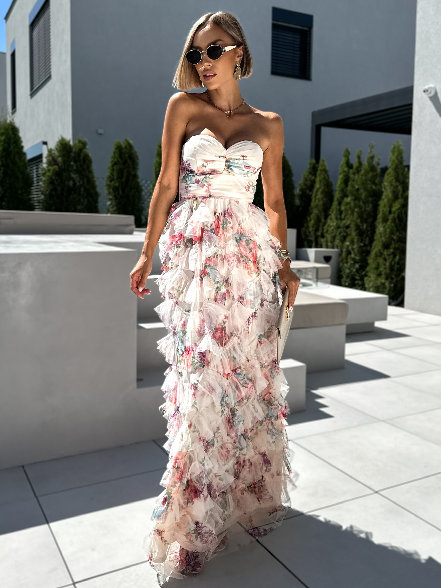 Krémové luxusní květinové korzetové šaty SALLET s volány Velikost: L
