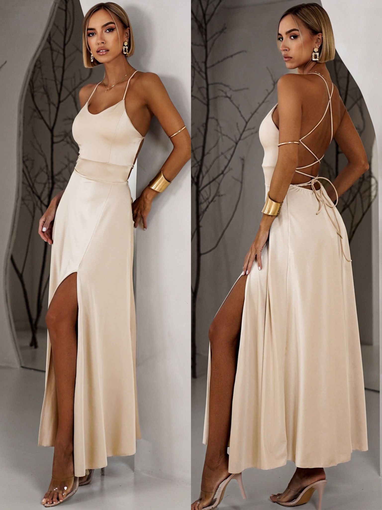 Krémové saténové dlouhé šaty SIMUEL se šněrováním Velikost: ONESIZE