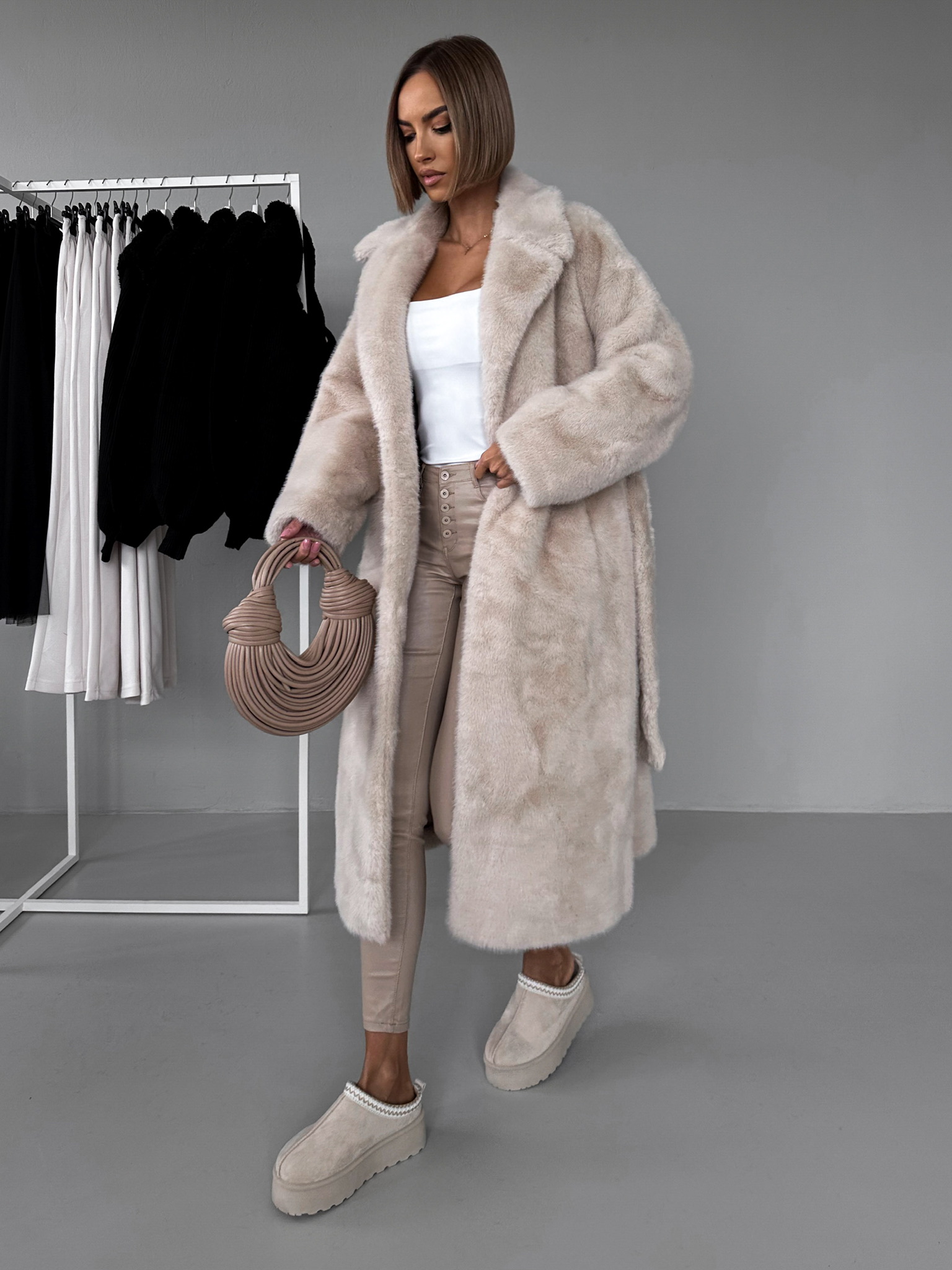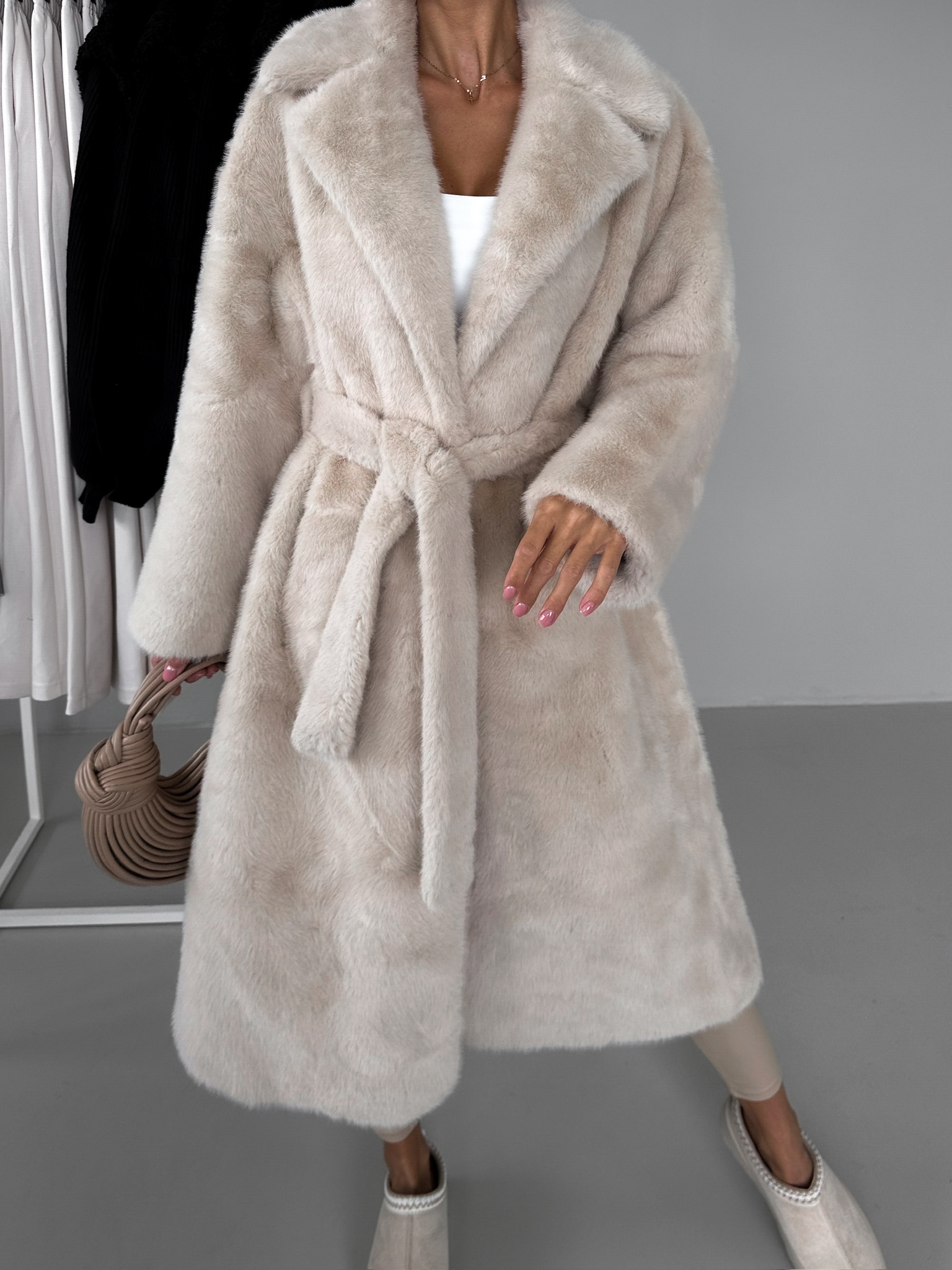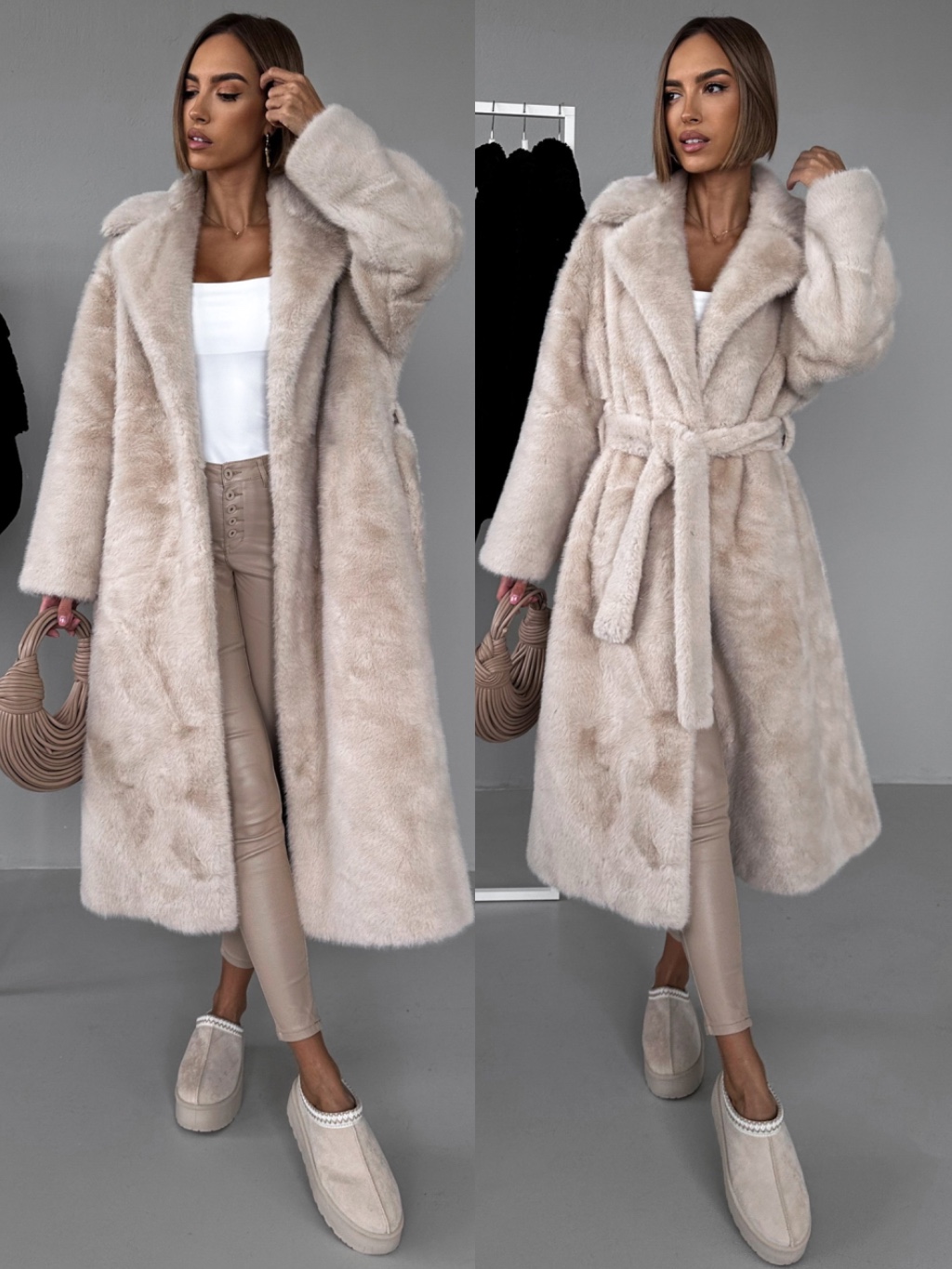 Krémový dlouhý faux fur kožešinový kabát NARCISA s páskem Velikost: S/M