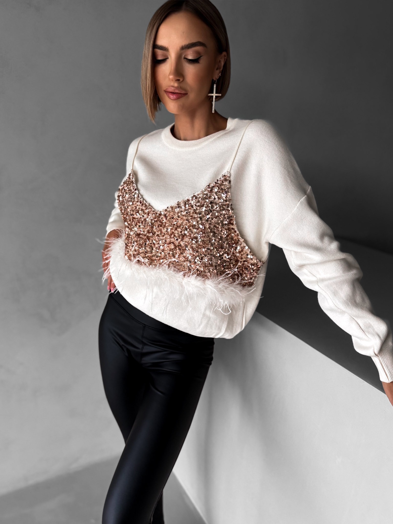Krémový flitrový svetřík HAIEC s peříčky Velikost: ONESIZE