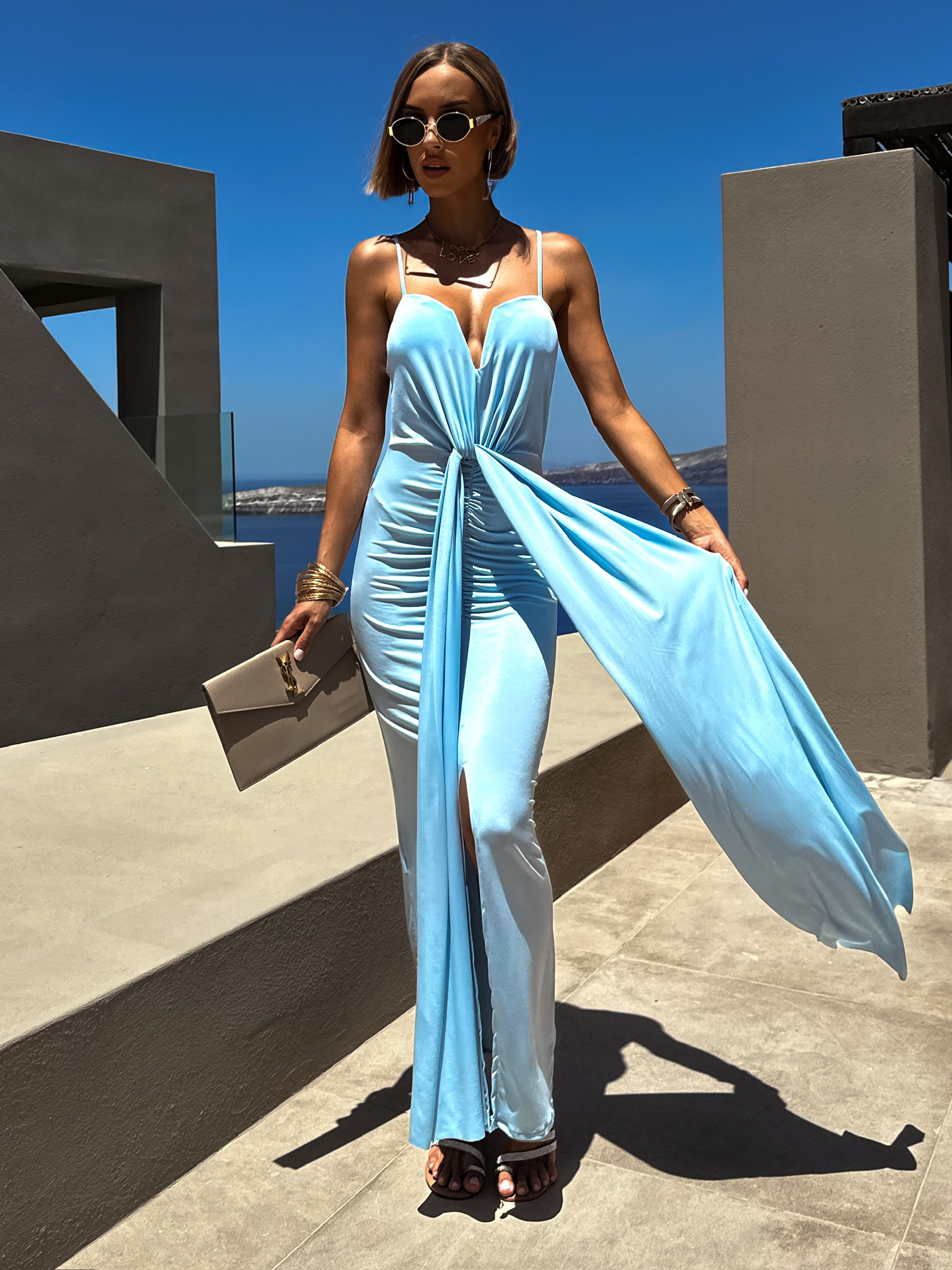 Modré dlouhé elegantní šaty DIMIS s výstřihem Velikost: ONESIZE