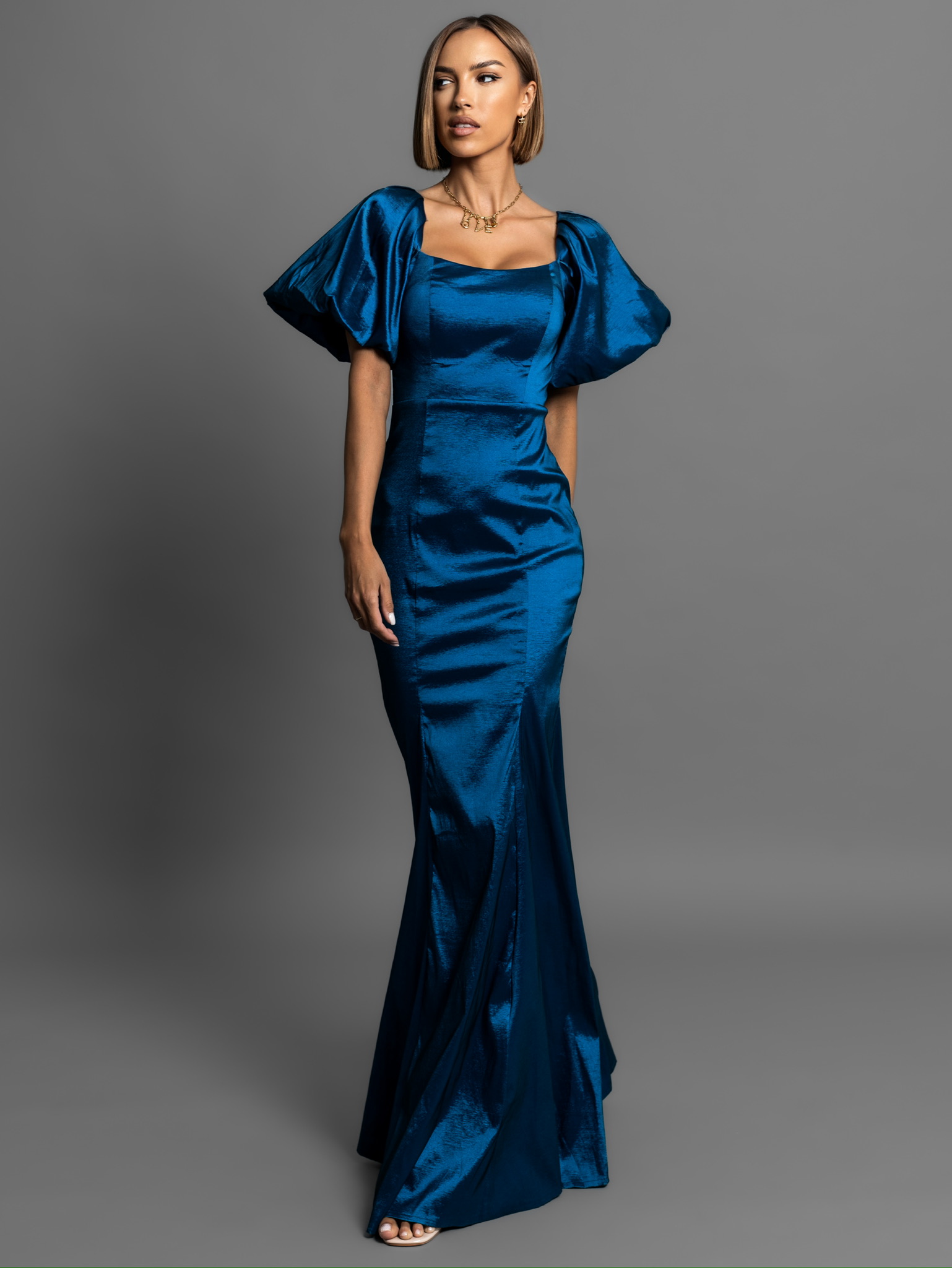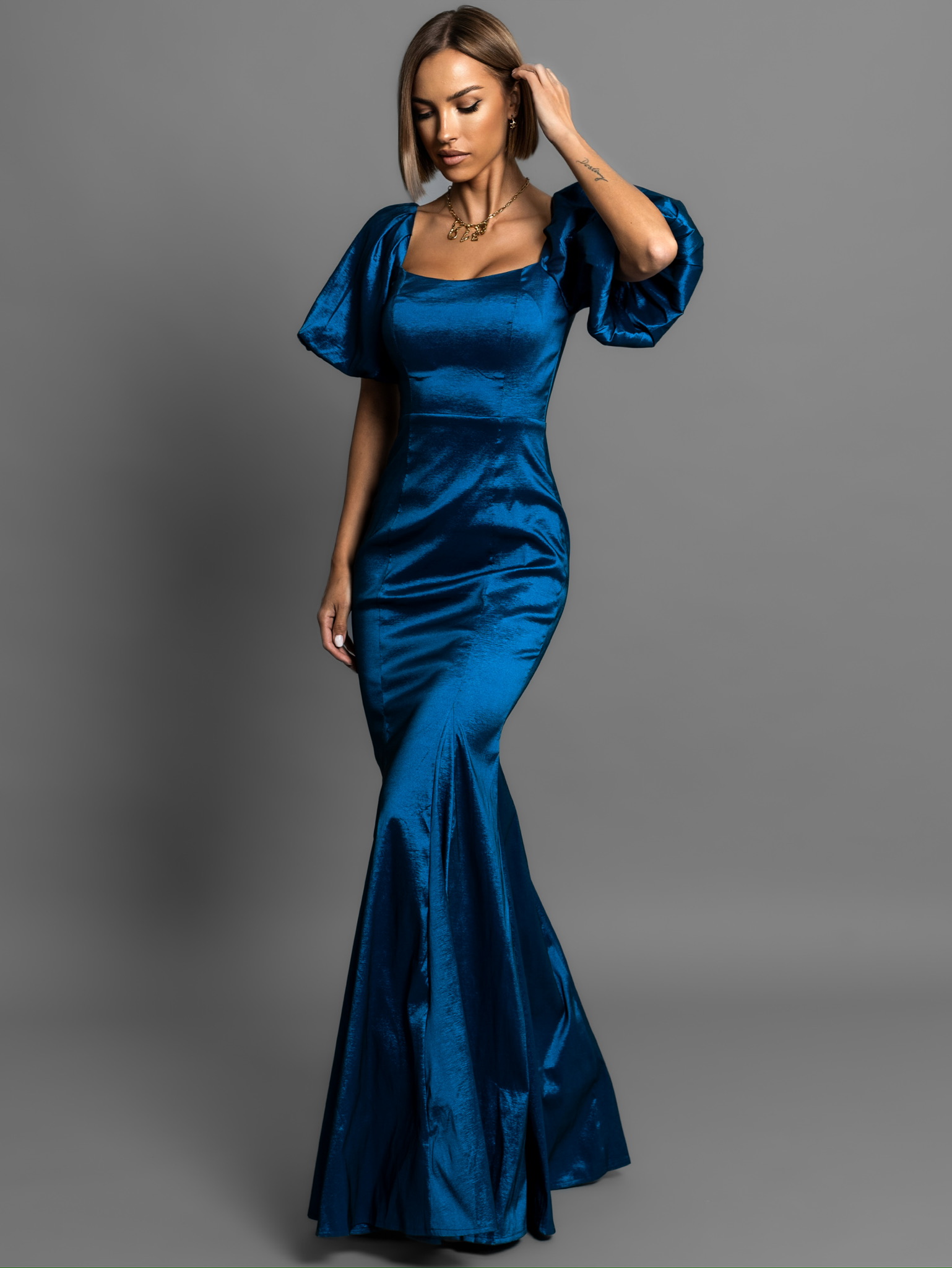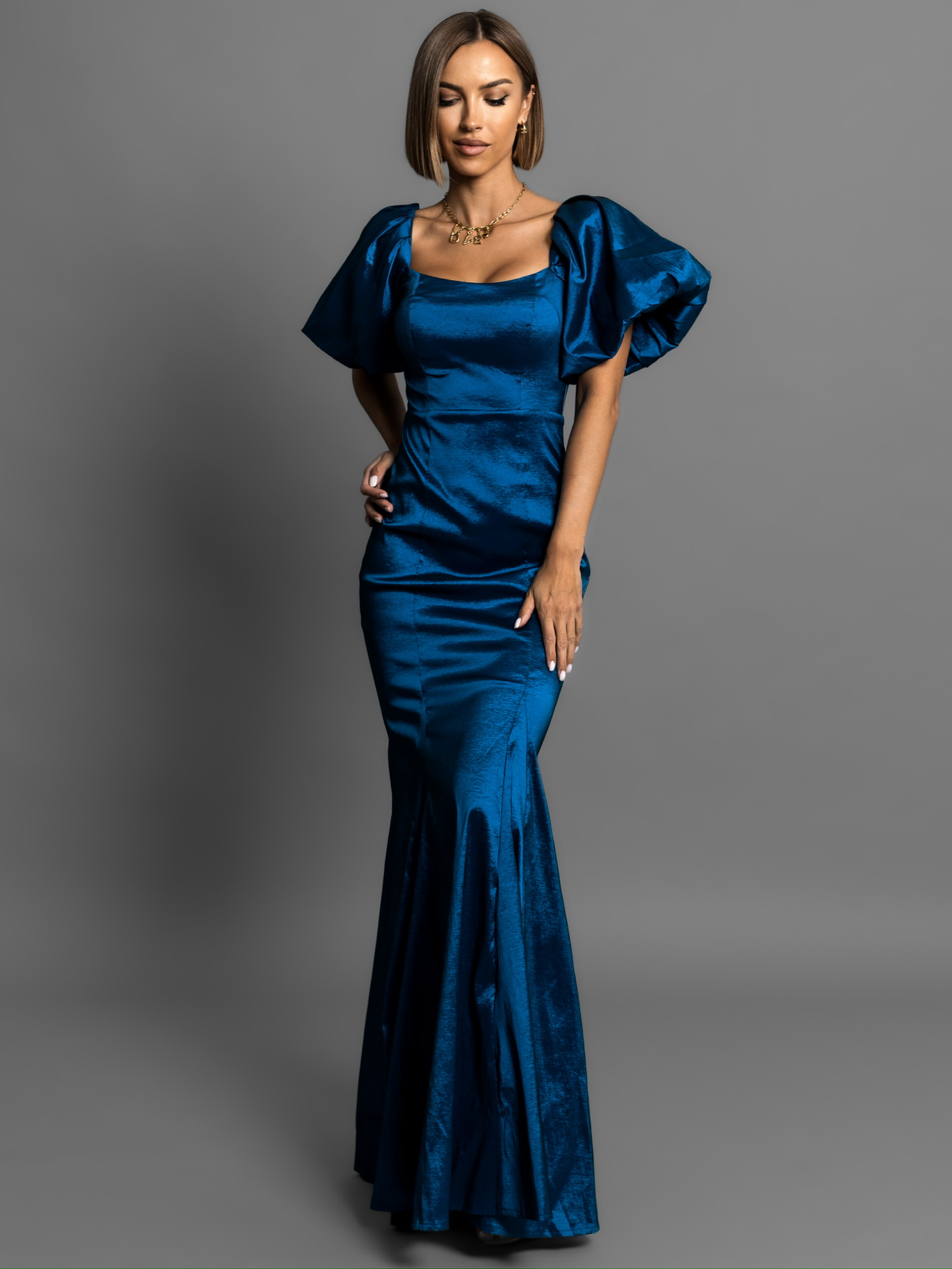 Modré společenské dlouhé šaty GLAMYT na ples Velikost: S