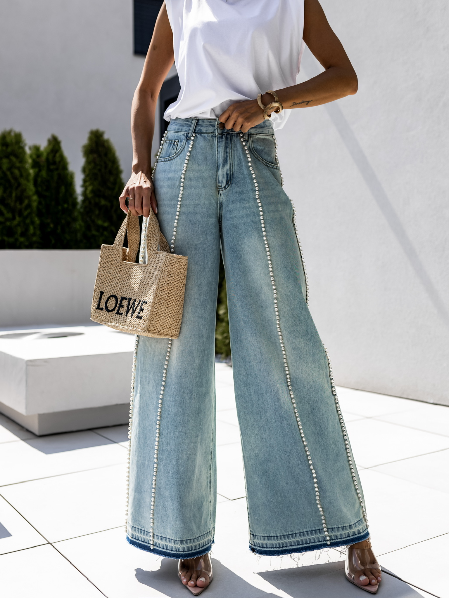 Modré stylové široké džíny PROSPER s perličkami Velikost: S