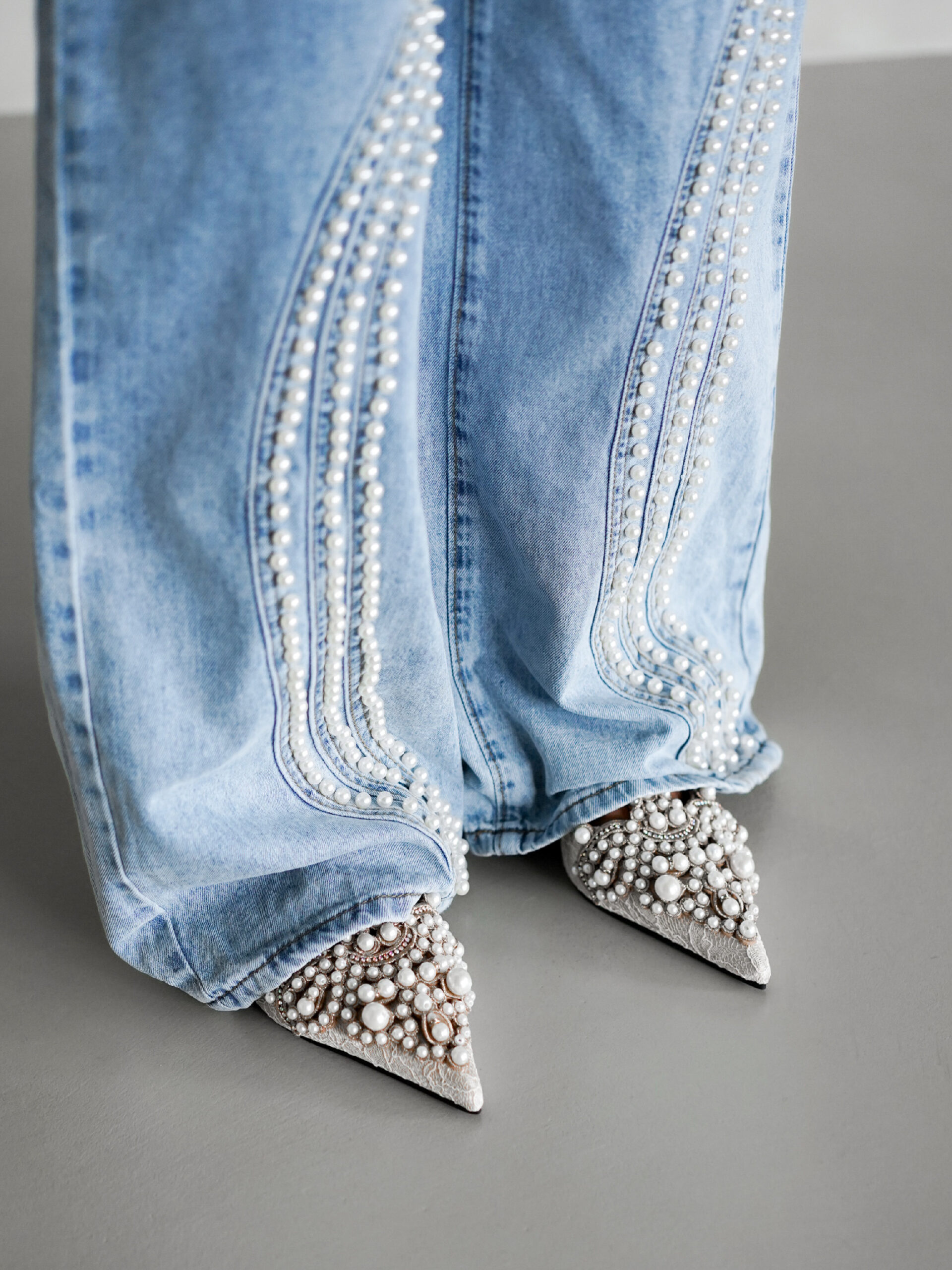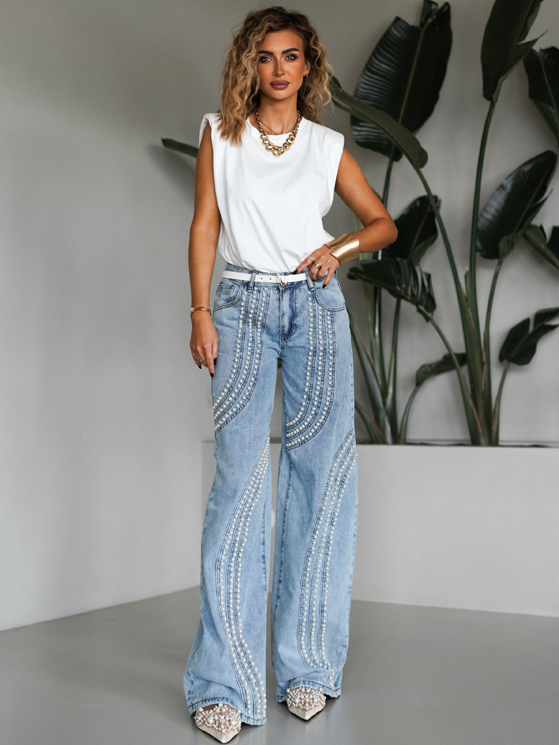 Modré stylové široké wide leg džíny TRINHA s perličkami Velikost: L