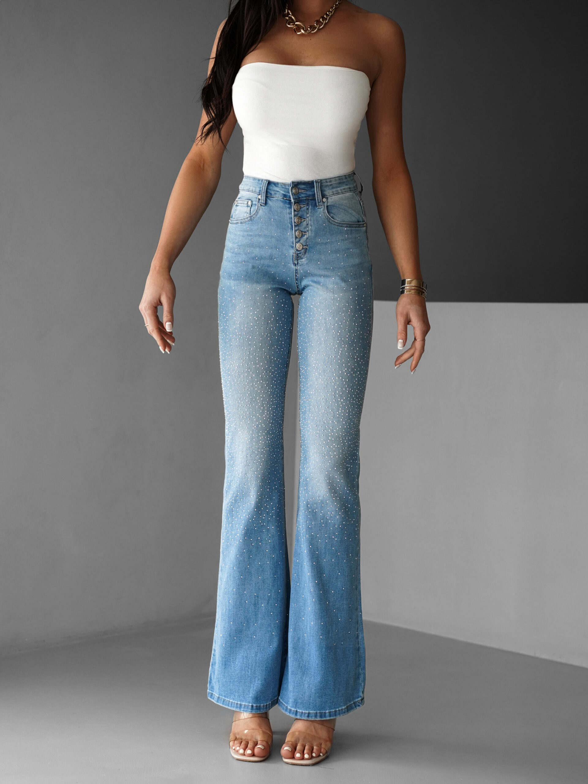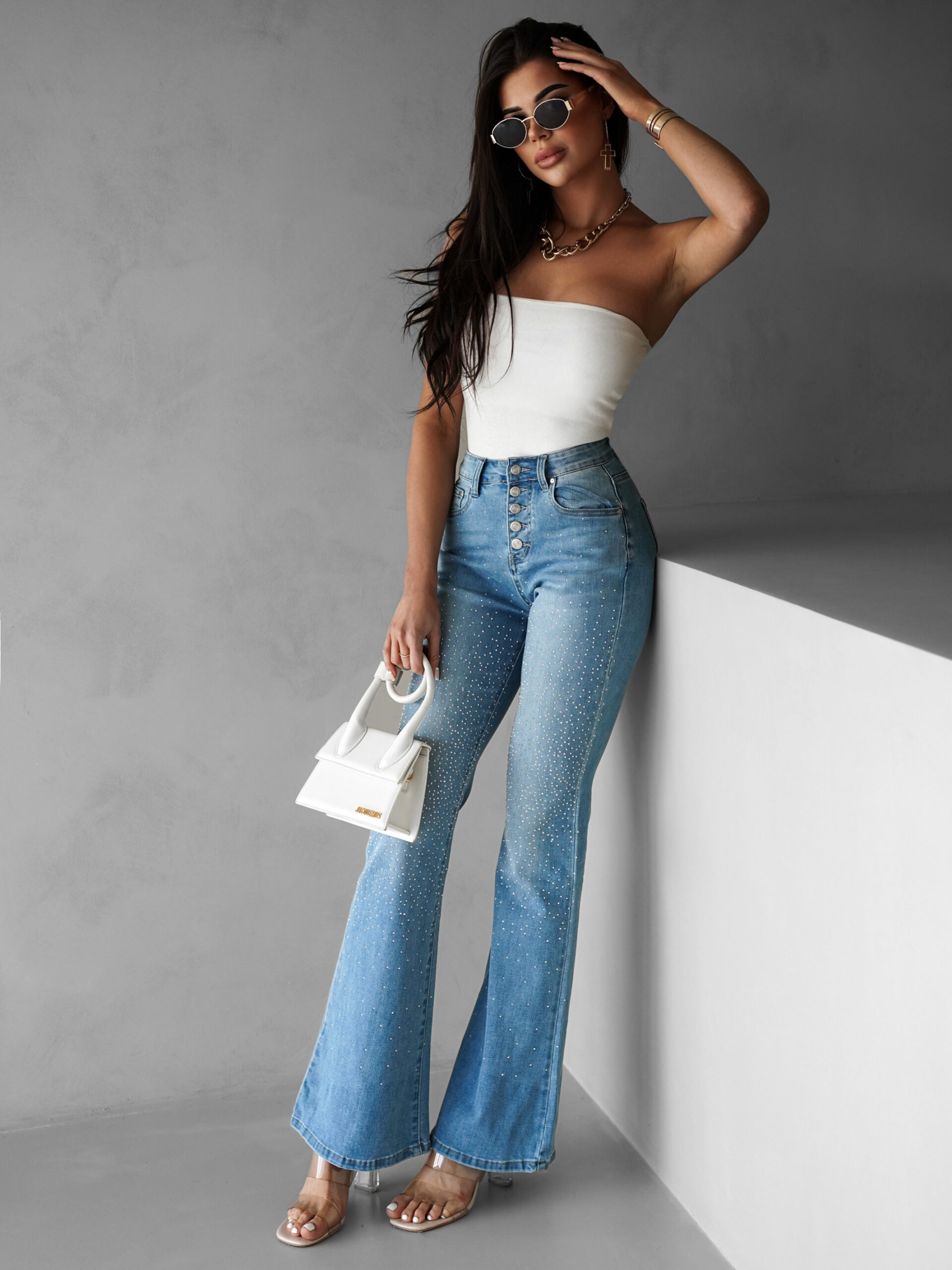 Modré třpytivé džíny DAMOR do zvonu Velikost: S