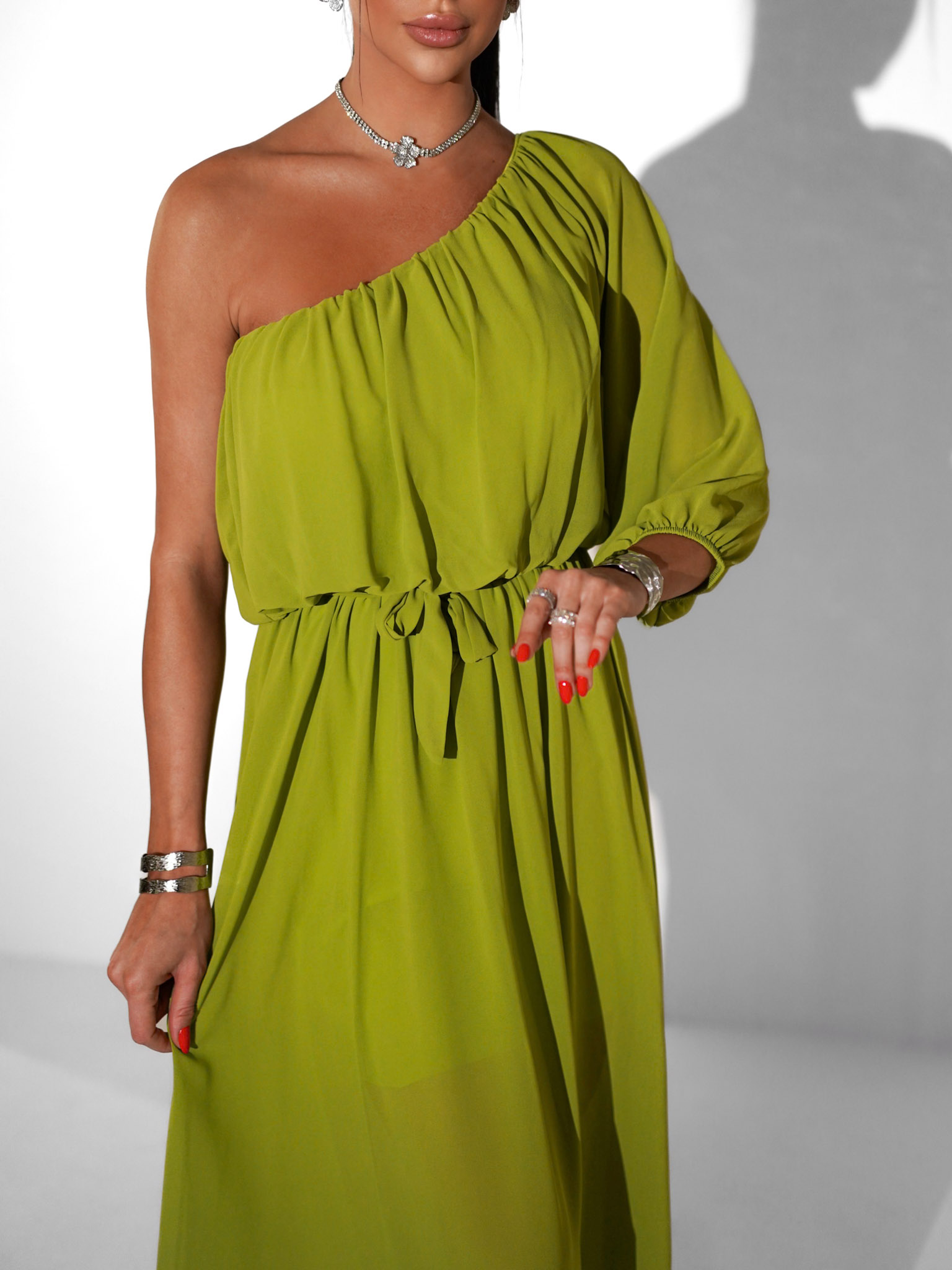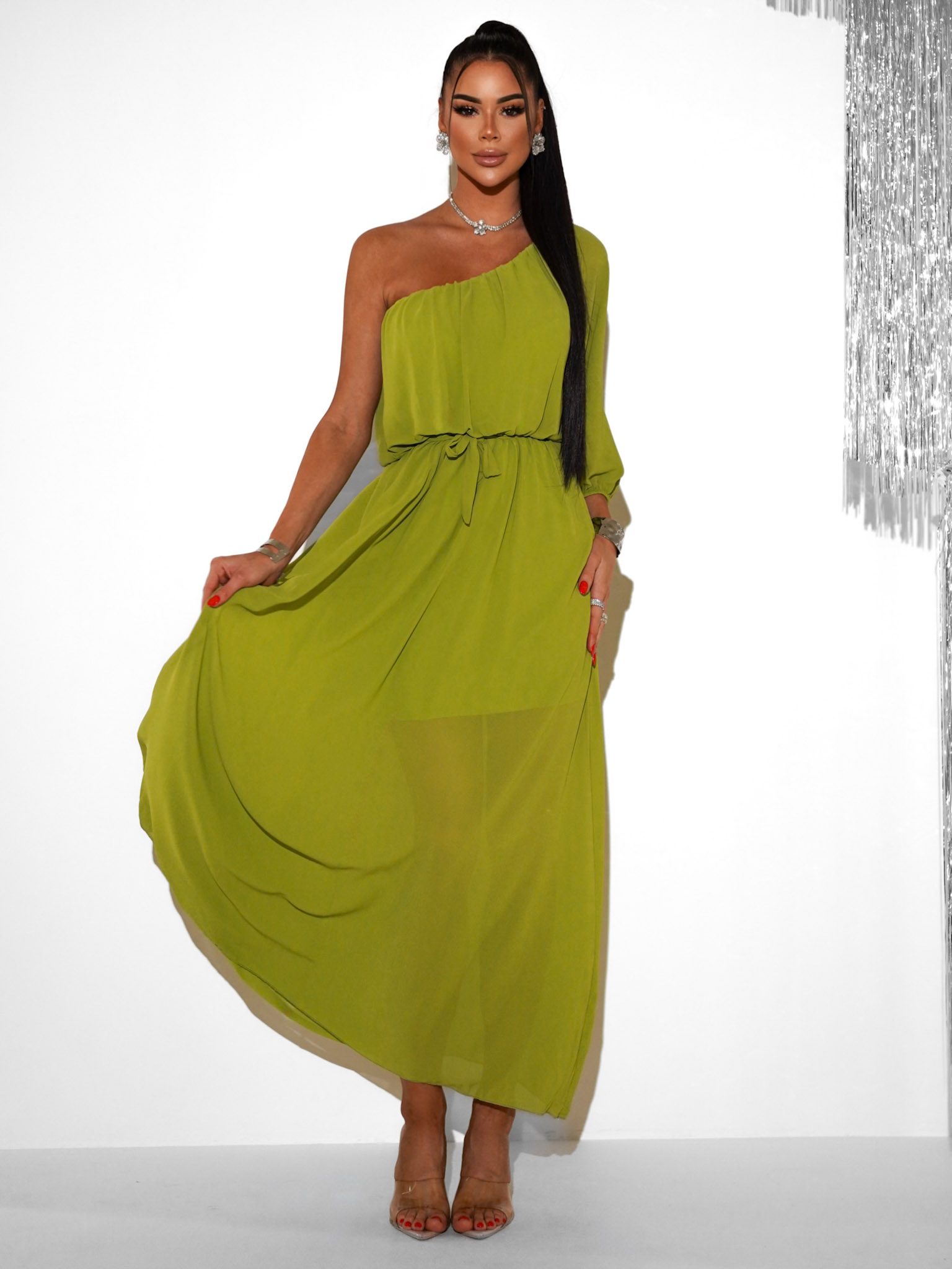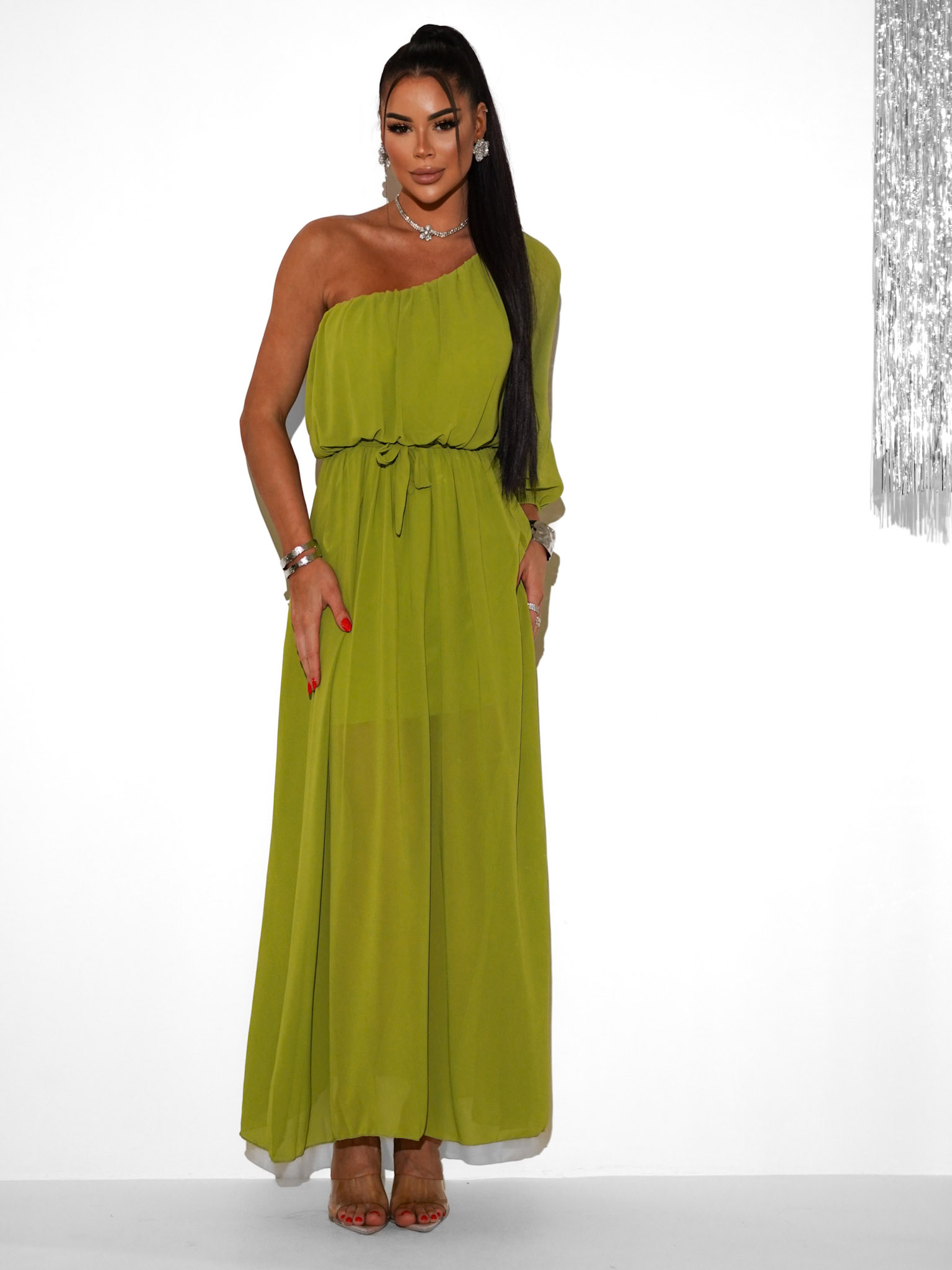 Olivové dlouhé asymetrické šaty NAVEL na jedno rameno Velikost: ONESIZE - Obrázek 2